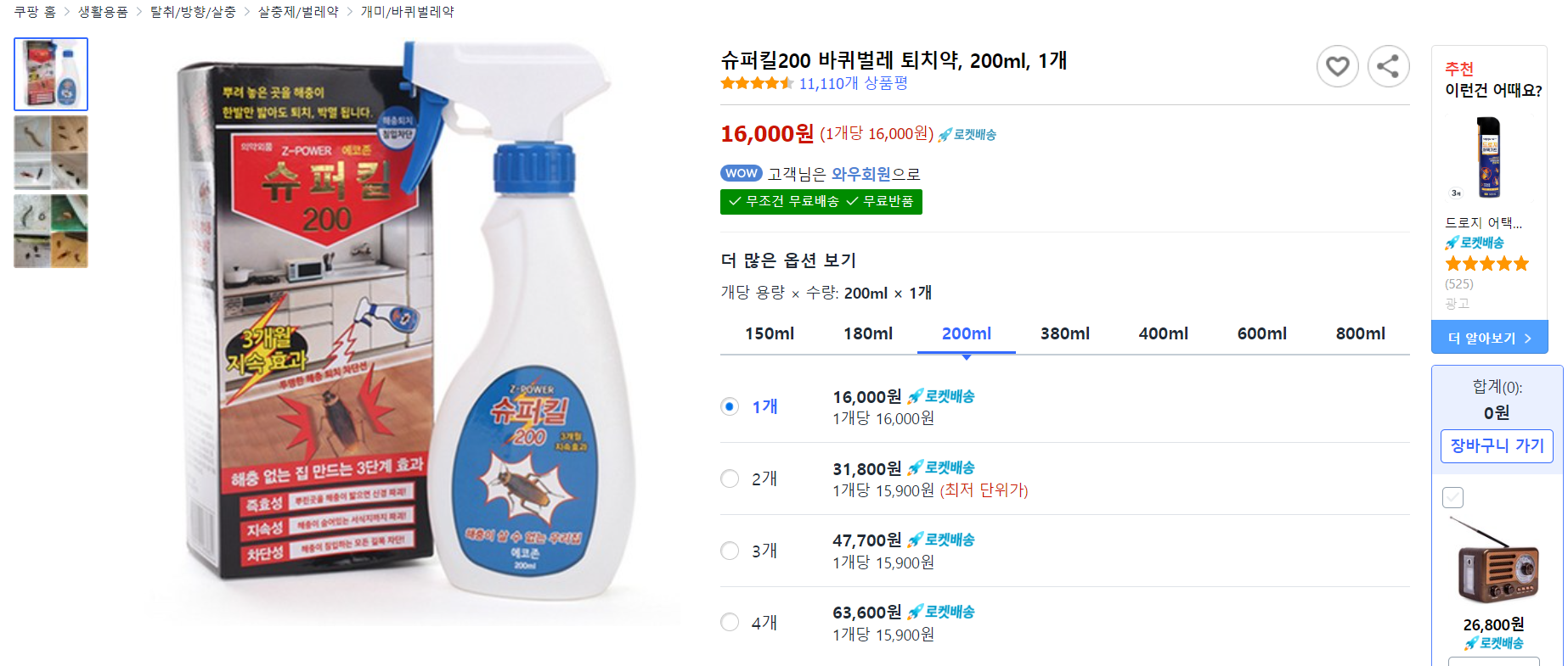 쿠팡 로켓배송으로 구매했습니다. 퇴근하고 화장실에서 하수구에 바퀴벌레가 보이더라구요. 바퀴벌레 먹이로 퇴치하는 약을 설치하긴 했는데 간간히 보여서 좀 더 효과가 있을법한 뿌리는 바퀴벌레 퇴치약 슈퍼킬 200을 주문했고 다음날에 로켓배송으로 빠르게 받을 수 있었습니다.