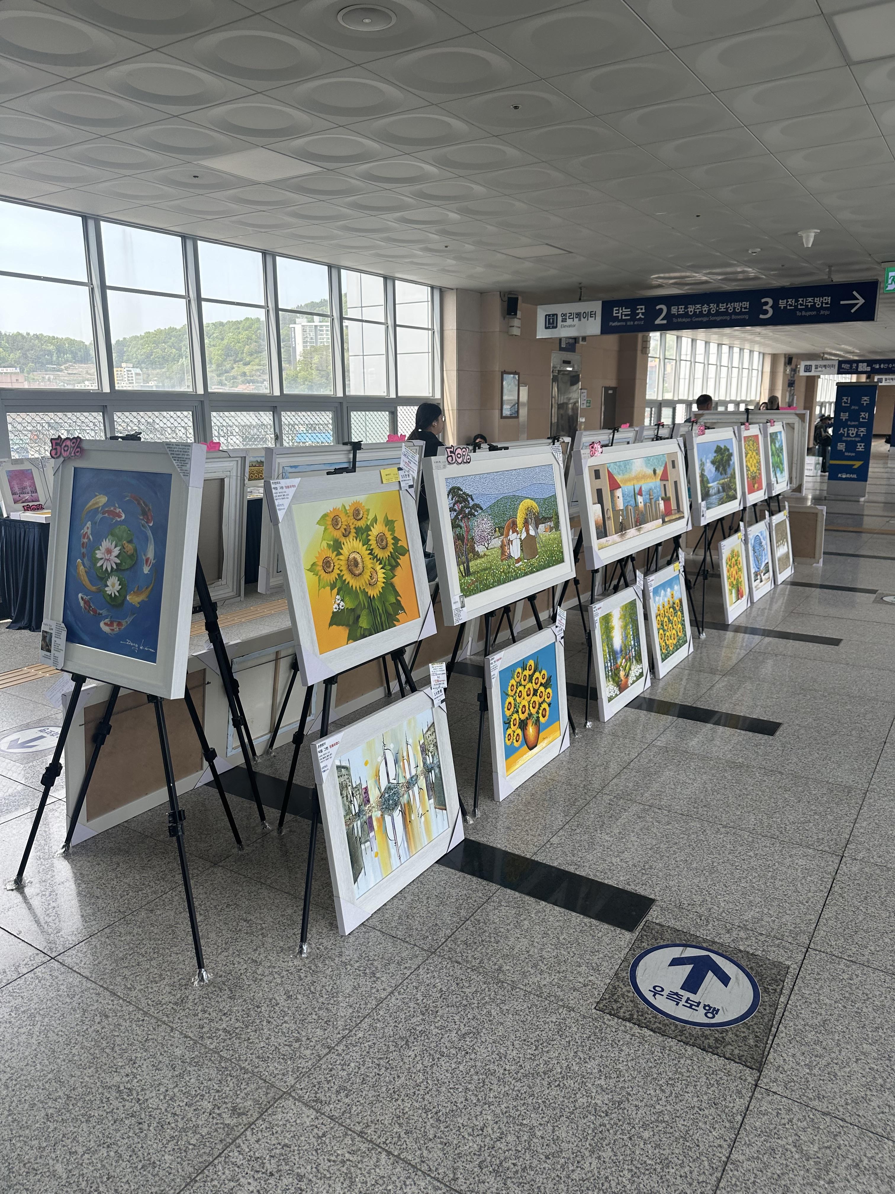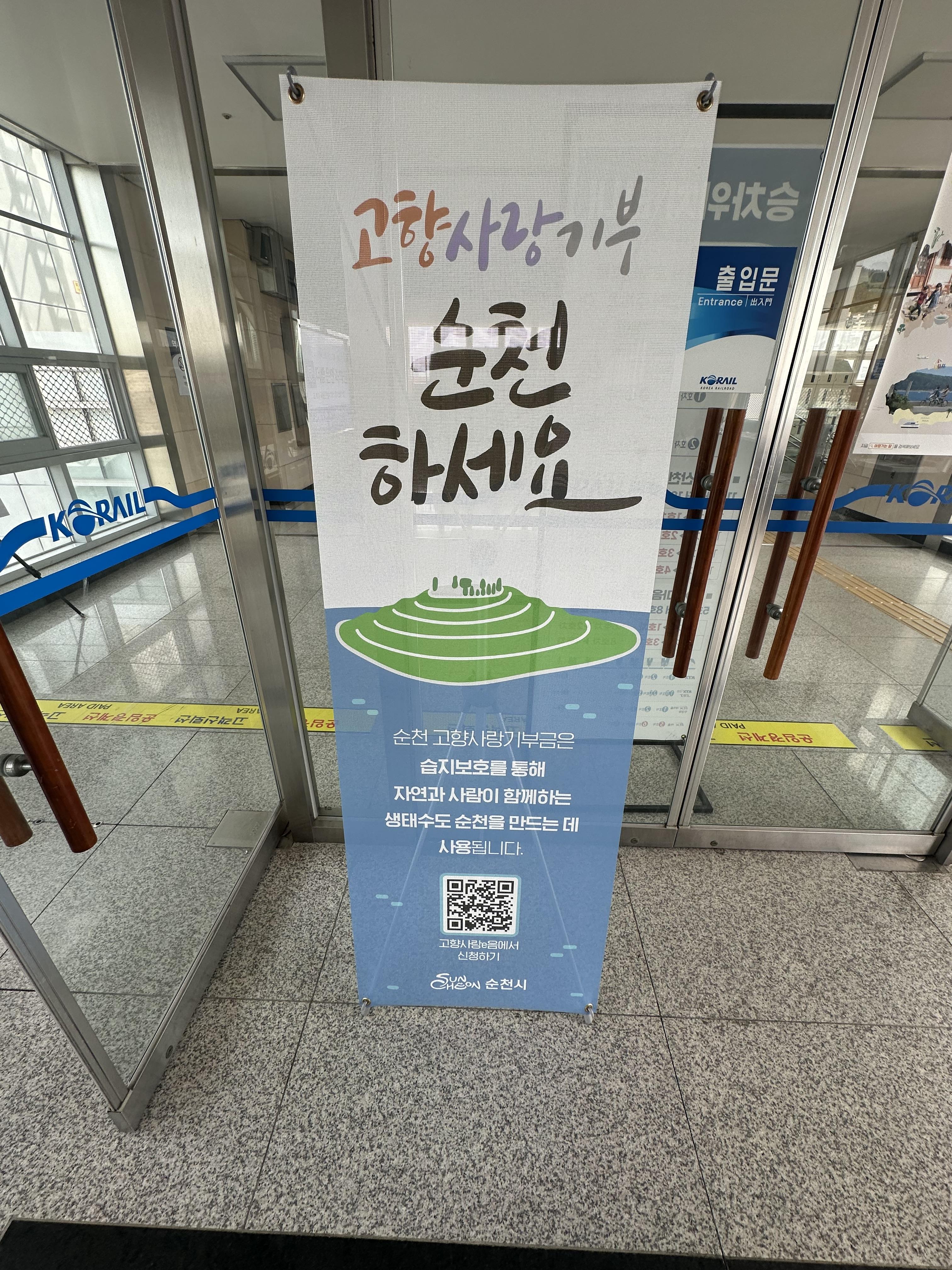 순천역 대합실로 가는 도중에 미술 작품 전시회가 있었습니다. 고향사랑기부라고 해서 기부금을 모아서 순천만 습지를 보호하고 개선하는데 사용되는 것 같습니다. 당시 4월에는 있었는데 지금은 진행할지 안할지는 모르겠습니다.