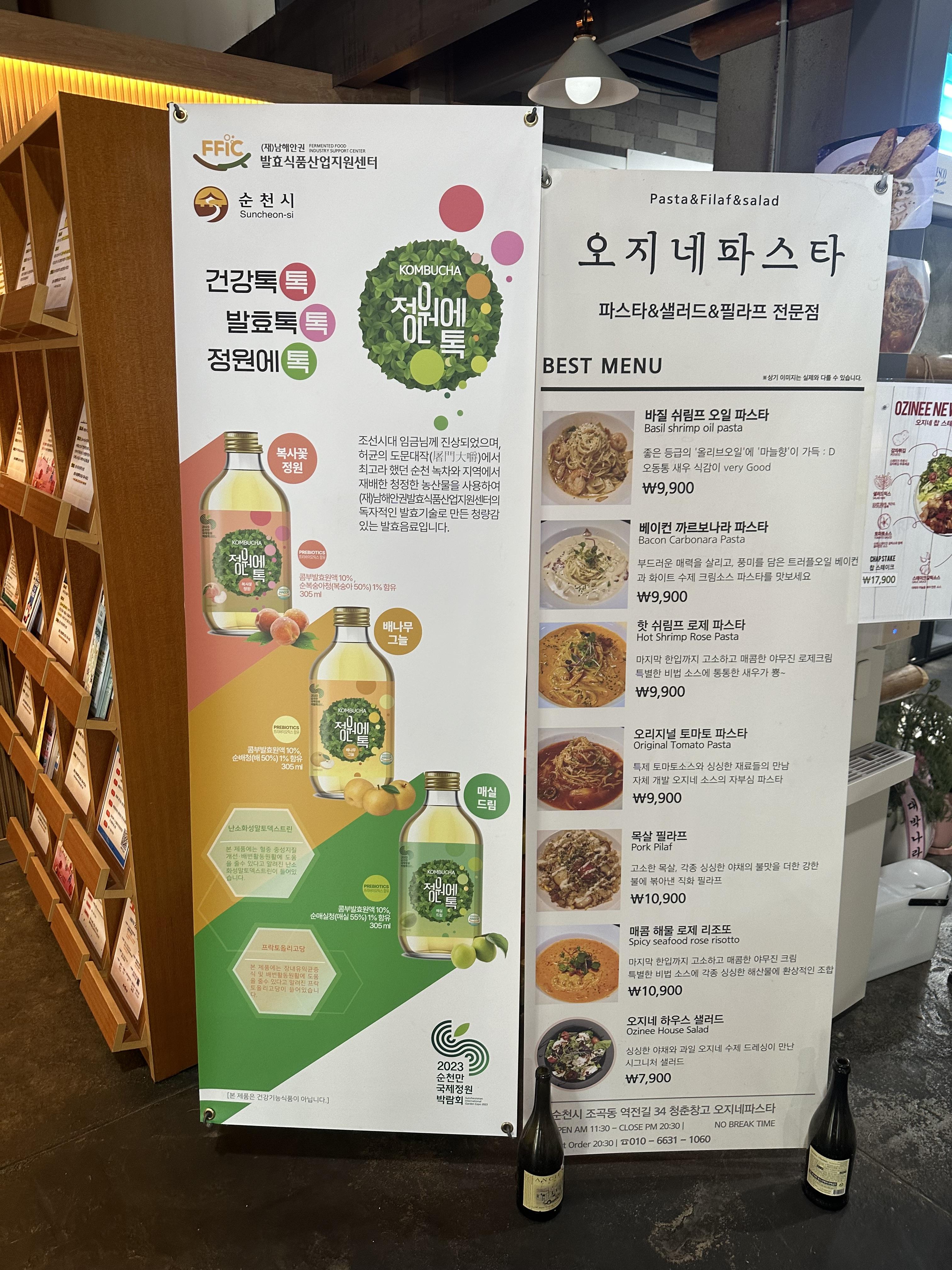 디엔차이에서 광부덮밥 파이구판덮밥을 맛있게 먹고 식판을 반납했습니다. 그리고 다시 한번 청춘창고를 돌아보며 구경을 을 하는데 오지네파스타라고 해서 파스타 가게도 있었습니다. 나름 작은 규모이기는 하지만 청춘창고 안에는 카페도 있고 한식, 중식, 일식 그리고 다양한 외국 음식들도 판매하니 참고하시면 좋을 것 같습니다. 말씀 드린것처럼 청년들이 운영하는 곳이다보니 매장내 가게가 바뀔 수 있는 점 이해바라며 글 작성시간 기준으로 오래되었다면 다른 블로그 최신글과 함께 보신다면 즐거운 여행이 될 것 같습니다. 오지네파스타 바로 옆에는 순천시에서 파는 정원톡이라는 발표음료가 판매되고 있었습니다.