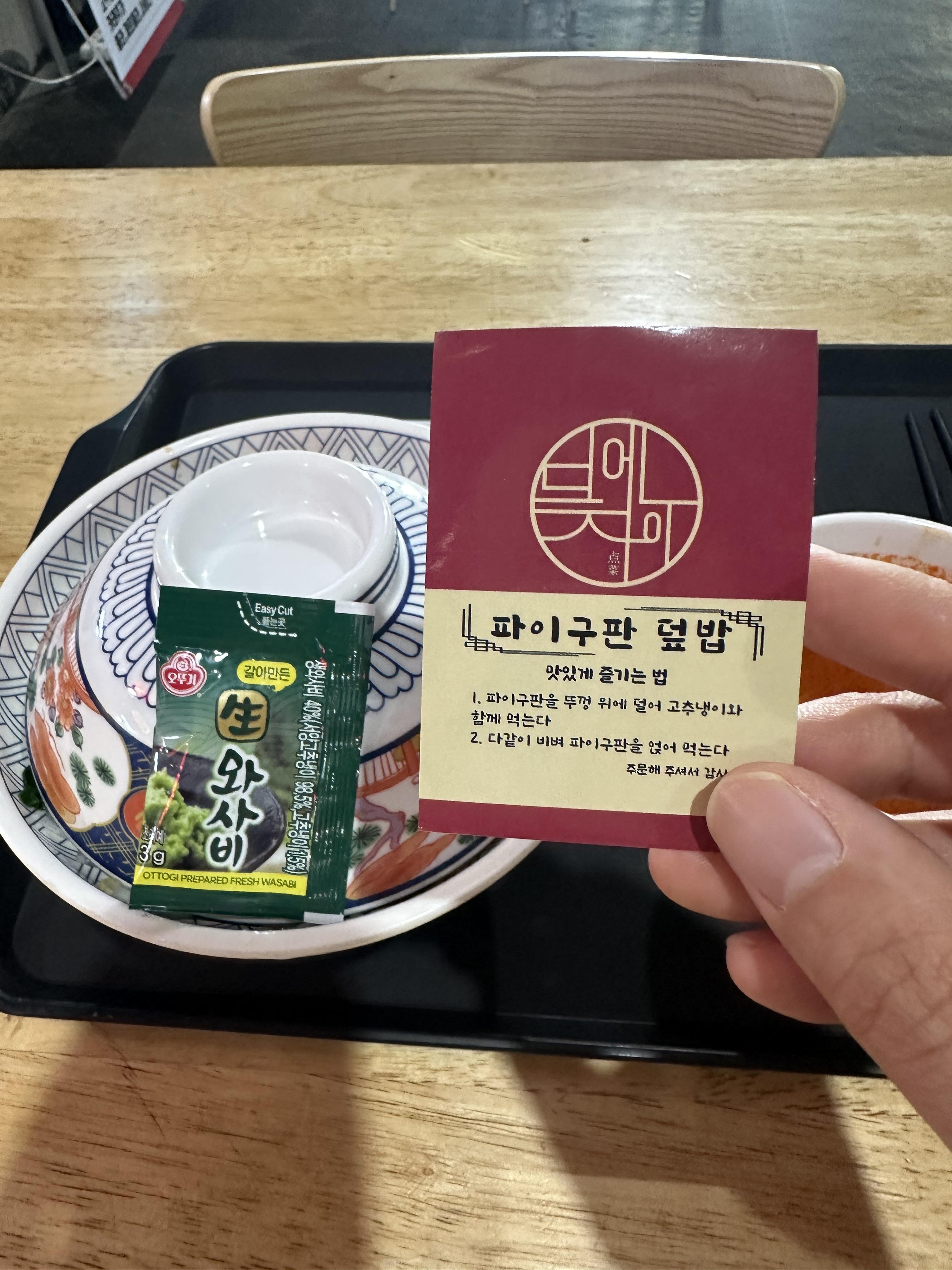 주문 후 청춘창고를 돌아다니면서 사진 찍다보니까 10분정도 후에 주문했던 광부덮밥 (파이구판 덮밥)이 드디어 나왔습니다. 짬봉 국물이 옆에 잇었습니다. 그리고 단무지와 짜사이, 그리고 고추냉이 와사비가 눈에 보입니다. 중국 대만에서 먹던 음식이라 그런지 처음 음식을 받았을 때 밥그릇으로 덮어져 있는 것을 볼 수 있습니다. 뚜껑 위에은 파이구판 덮밥을 맛있게 먹는 방법이라고 간단하게 적힌 작은 책갈피 처럼 생긴게 보였습니다.