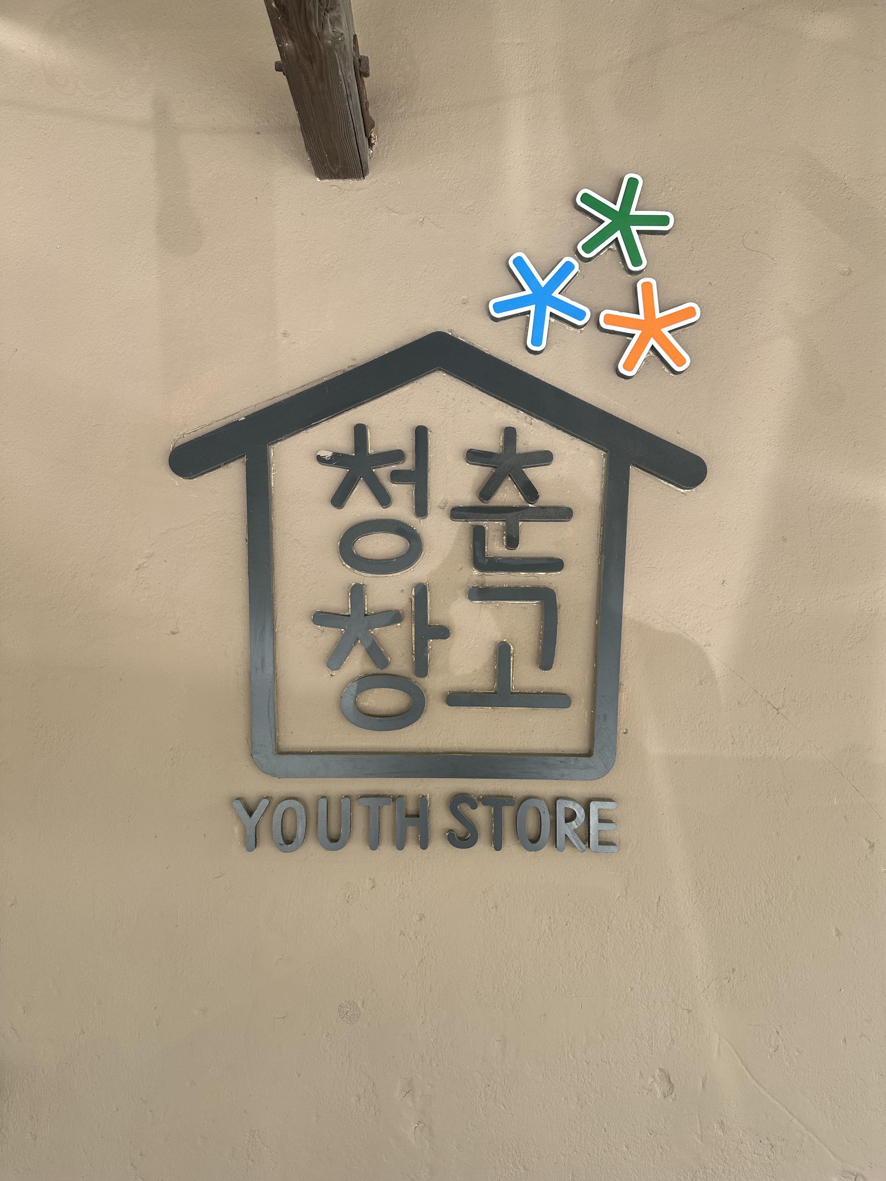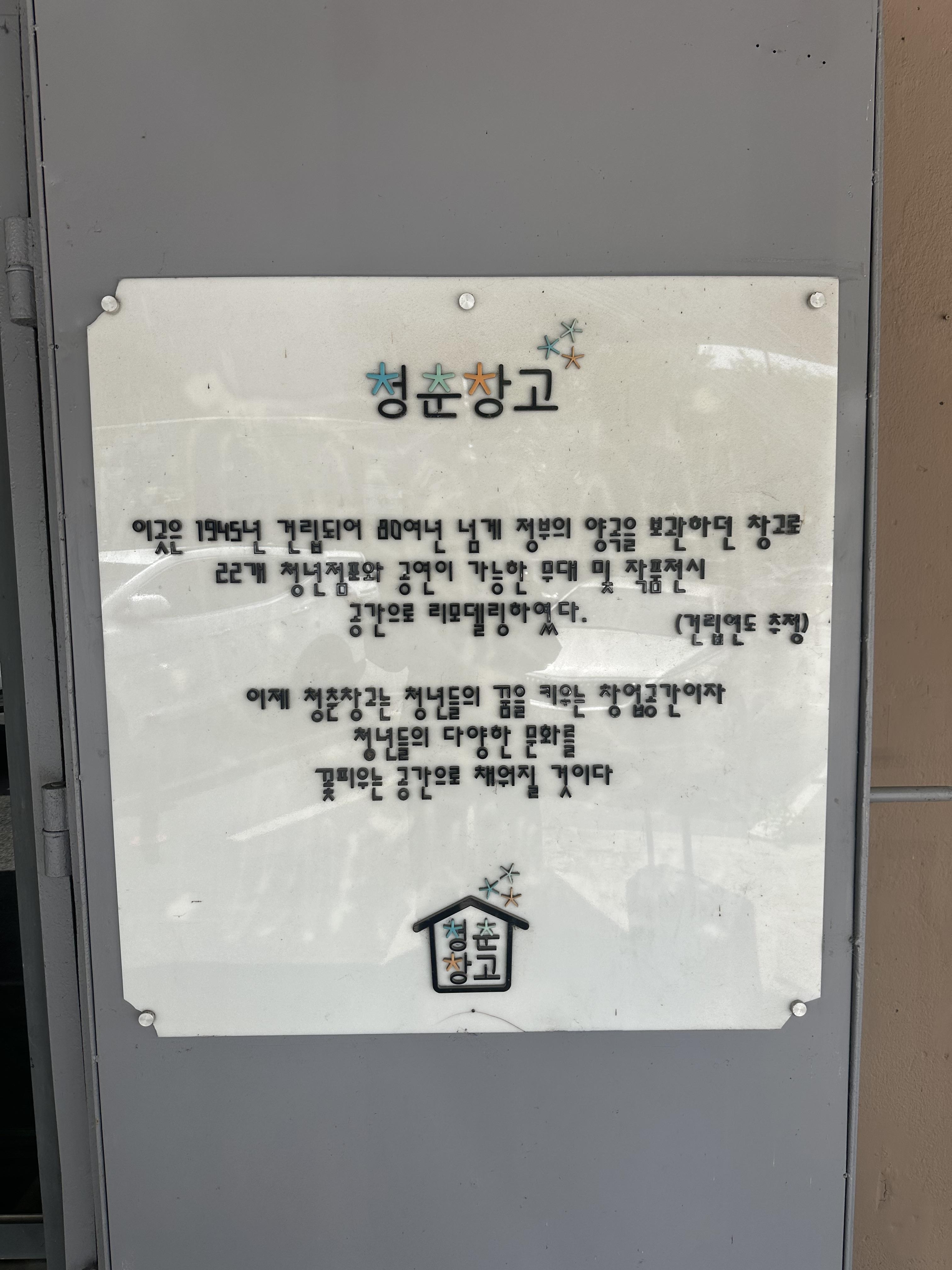 청춘창고로 들어가기전에 청춘창고를 소개 하는 로고와 짧은 글을 볼 수 있습니다. 건물만 보면 오래된 창고가 맞다는 것이느껴졌습니다. 그러나 창고의 로고는 젋은 청춘들이 답게 컬러의 이모티콘과 함께 청춘들의 위한 장소임이 느껴지는 로고가 붙어있었습니다.