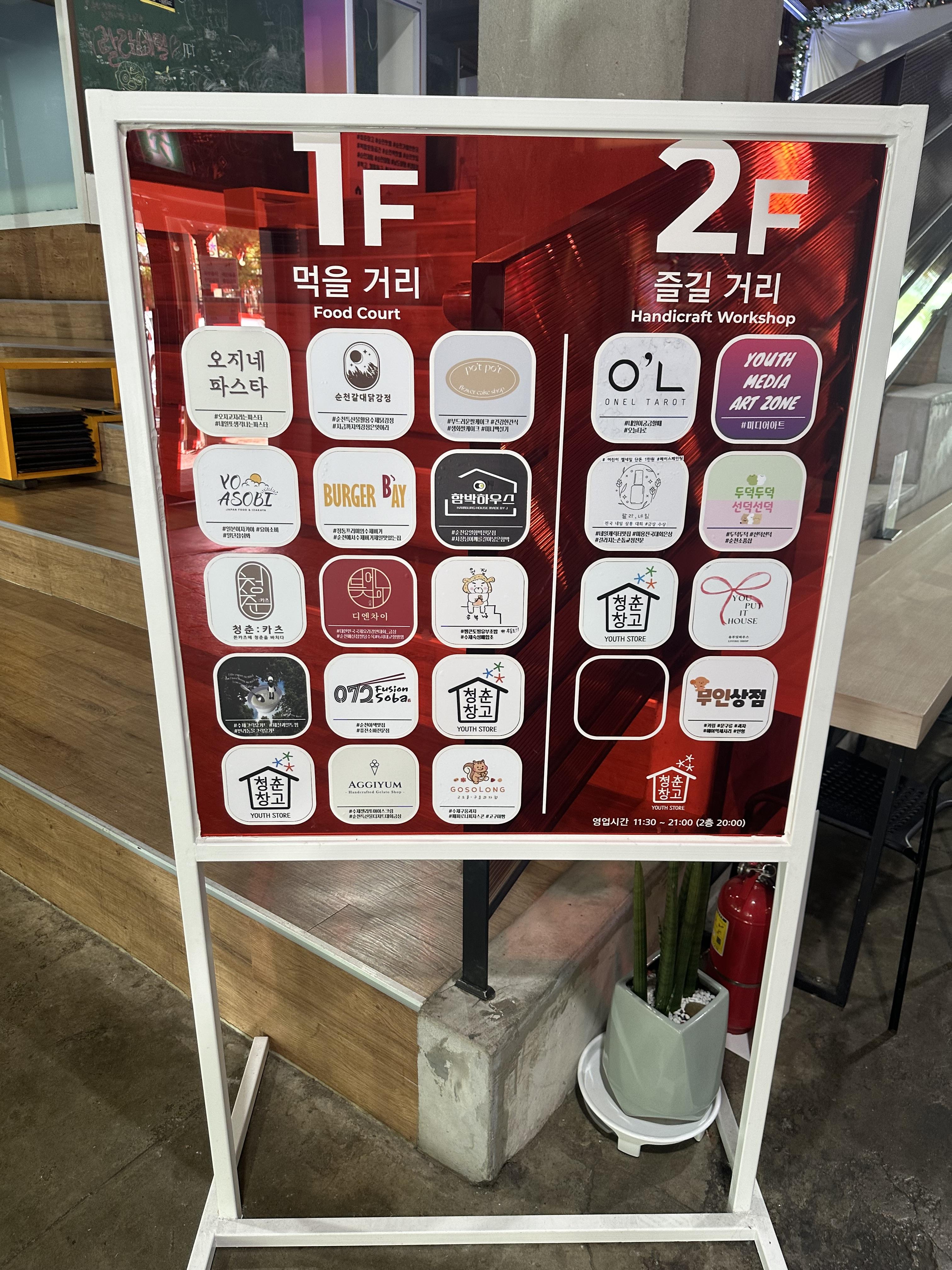 - 2층에는 무인상점, 타로, 미디어아트, 네일캐릭터맛집, 두덕두덕 선덕선덕 순천소품샵 및 각종 공연을 할 수 있는 무대가 있습니다.