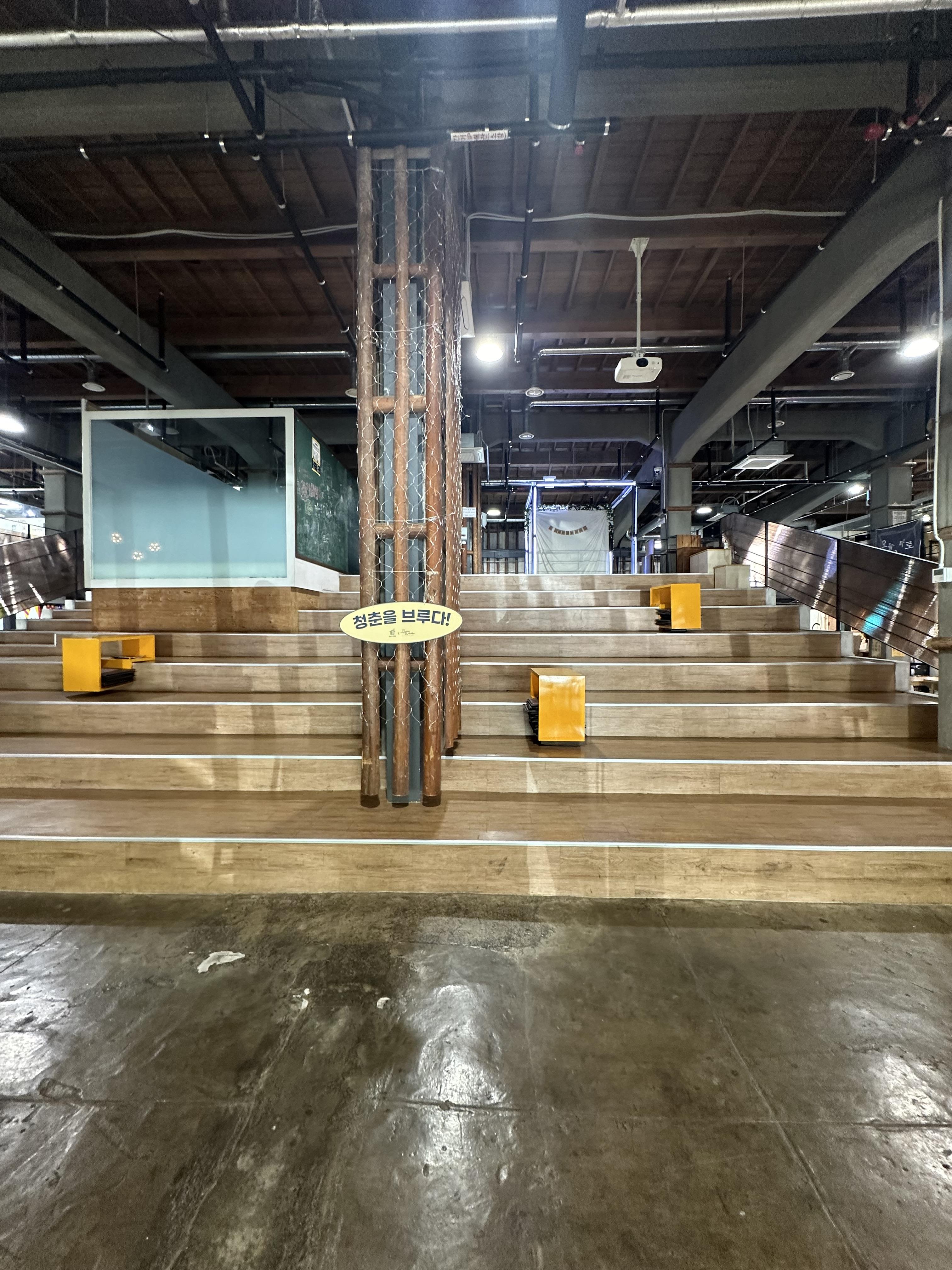 청춘창고에 도착해서 문을 지나면 정문 앞에는 2층으로 올라갈 수 있는 계단으로도 활용 될 수 있고 무대에서 관람할 수 있는 의자를 볼 수 있습니다. 그리고 이런 계단을 통해 2층으로 올라갈 수 있습니다. 청춘창고 건물은 정말 오래동안 운영되어온 낡은 양곡 창고처럼 볼품없지만 안에서는 건물 외관하는 다르게 젊은 청춘들을 위해 탈바꿈 한 모습을 볼 수 있습니다.