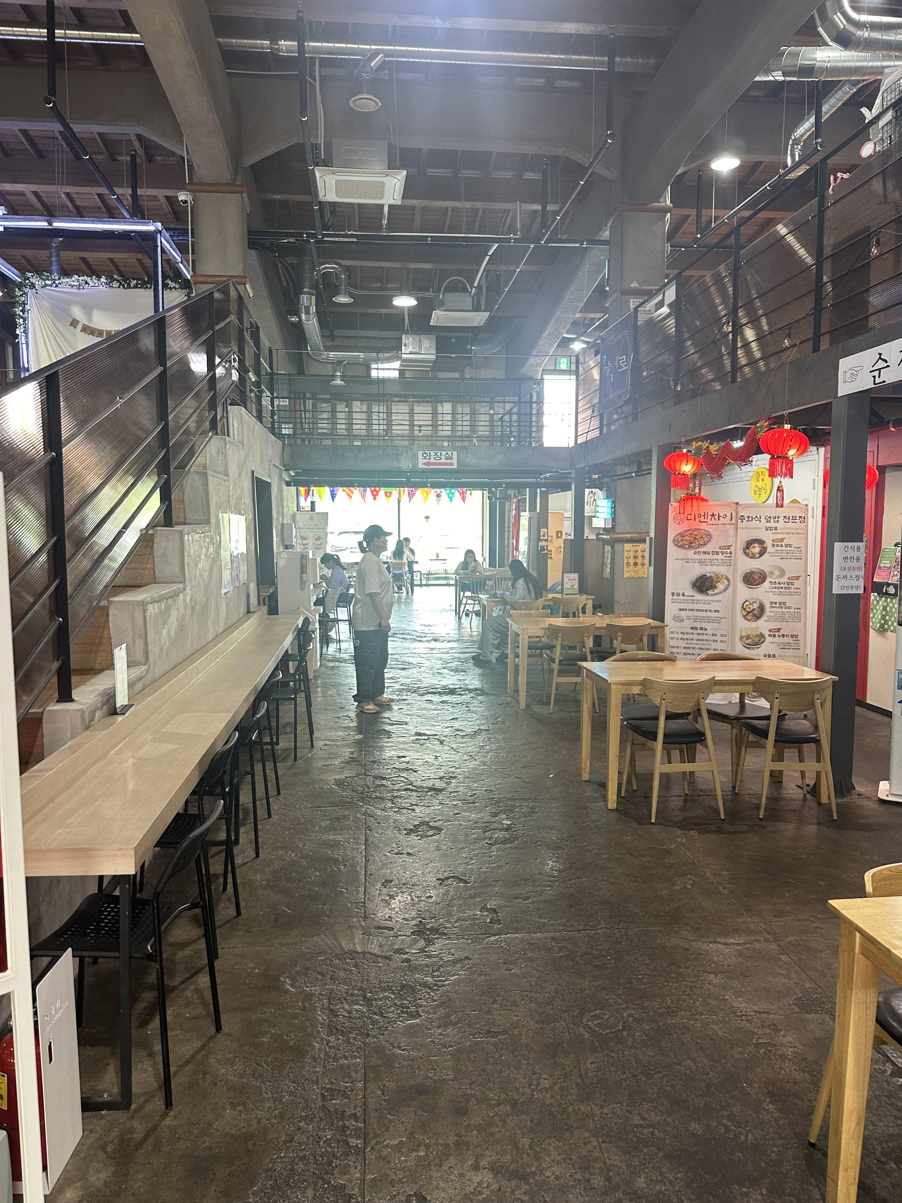 청춘창고는 1층과 2층으로 구분되는데요. 건물 밖에서 보면 1층으로만 보였습니다. 저도 포스팅하기전에는 1층으로만 알고 잇었는데 무대있는쪽이 2층이더라구요. 1층은 먹을거리가 있고 2층은 즐길거리가 있다는 것을 안내판을 통해 확인 할 수 있스빈다. 안내판에서 보면 1층 먹을거리에서는 식당이 많아 보이는데요. 실제로 방문하면 아직 입점하지 않은곳도 있고 문을 열지 않은 곳도 있었습니다. 그래서 미리 최신정보들을 찾아보시거나 전화번호 파악되신다면 확인 후 가보시는것도 추천드립니다. 순천을 자주 오지는 않고 1년에서 2년마다 오는데 입점가게가 자주 바뀌는 것 같습니다. 아무래도 청년들이고 청년들도 나이를 먹다보면 더 이상 입점해서 일할수는 없고 자체적으로 창업을 해야하기 때문에 나가는게 아닐까 조심스럽게 추정됩니다. 저는 청춘창고 한바퀴 돌아보면서 디엔차이라는 중식덮밥 전문점에서 주문하고 기다리게 되었습니다.