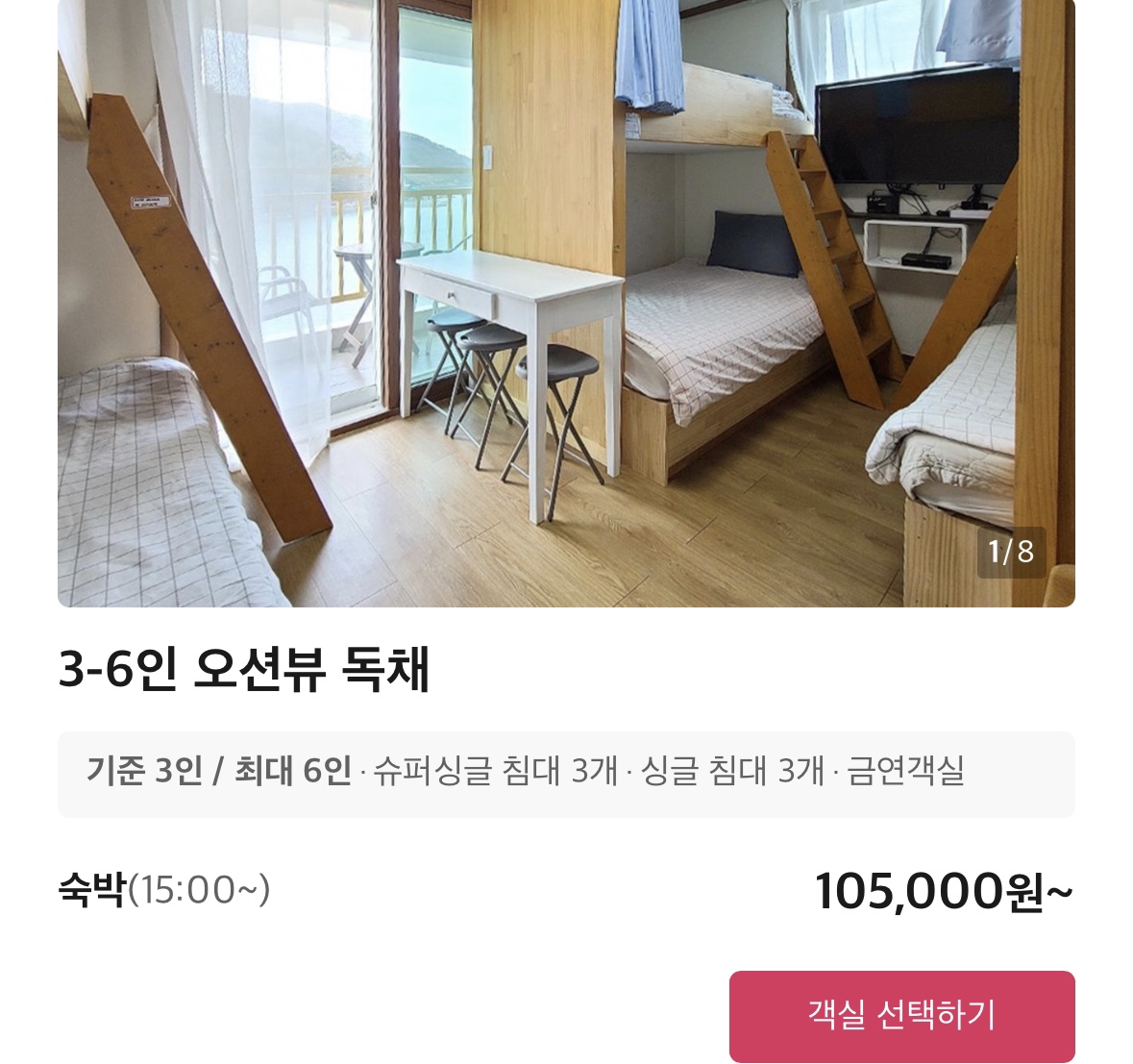 2-3인실, 2-4인실, 3-6인실 오션뷰 독채, 패밀리룸 독채까지 다양하게 있습니다. 도시에서 벗어나 조용한 시골마을에 있다보니 조용하게 쉬기 정말 좋아요. 숙소 바로 앞에 바다가 있어서 굳이 나가지 않아도 창문을 통해 바다를 바라보면 정말 힐링되어요.