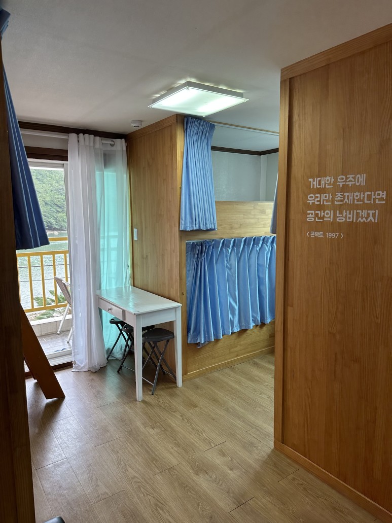 - 혼자만의 공간을 느낄 수 있도록 객실에는 커튼이 설치 되어있어요. 그리고 충분한 콘텐트와 전등이 설치 되어있어요.