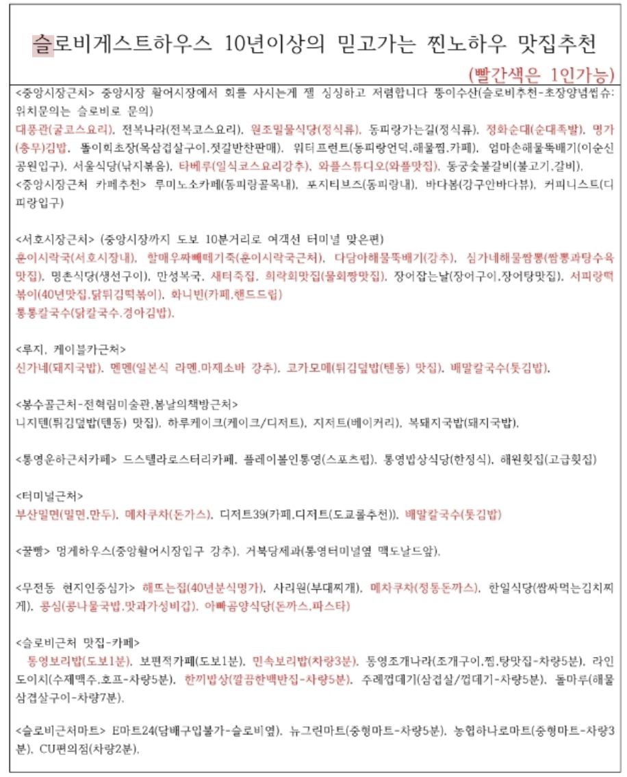 - 슬로비게스트하우스는 파티보다는 소통이라는 주제로 게스트들의 모임을 주선해요. 음식은 사장님께서 사전에 통영 맛집에서 주문해서 가져와요. (떡볶이, 회, 순대 등등)
