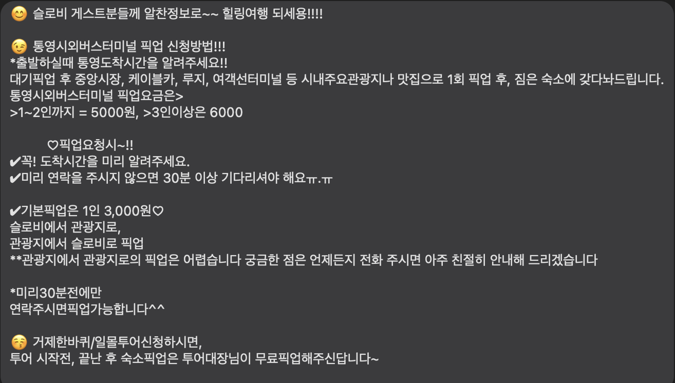 슬로비 게스트하우스에 예약을 하고나면 당일날 사장님께서 친절하게 안내 문자를 보내주어요. 사장님이 통영 출신분이라 통영에 대해 정말 많이 알아요. 맛집부터, 관광지까지 많이 알고 계셔요. 슬로비게스트하우스에서는 손님들을 위해 사장님께서 픽업서비스를 해주시는데요. 버스보다는 빠르고, 택시보다는 저렴한 가격에 이용 할 수 있어요. 단순히 픽업 서비스를 넘어서 픽업서비스 도중에 사장님께서 통영 시내를 드라이브 해주시는데 정말 좋아요. 버스타고 슬로비게스트하우스까지 가는 과정도 힐링이지만 함께 가는 과정도 정말 좋아요. 이용해보시면 정말 감동 받으실거에요.