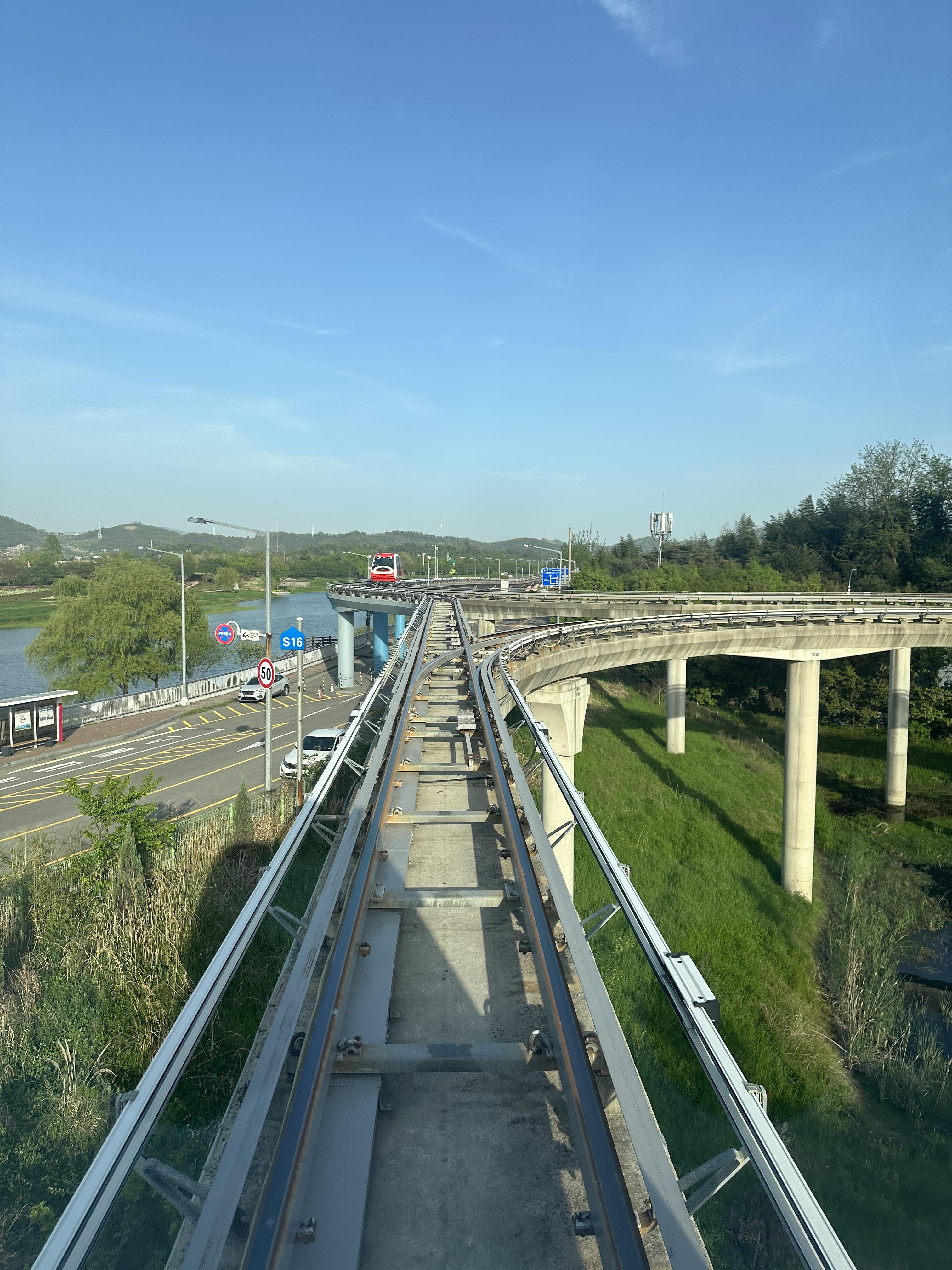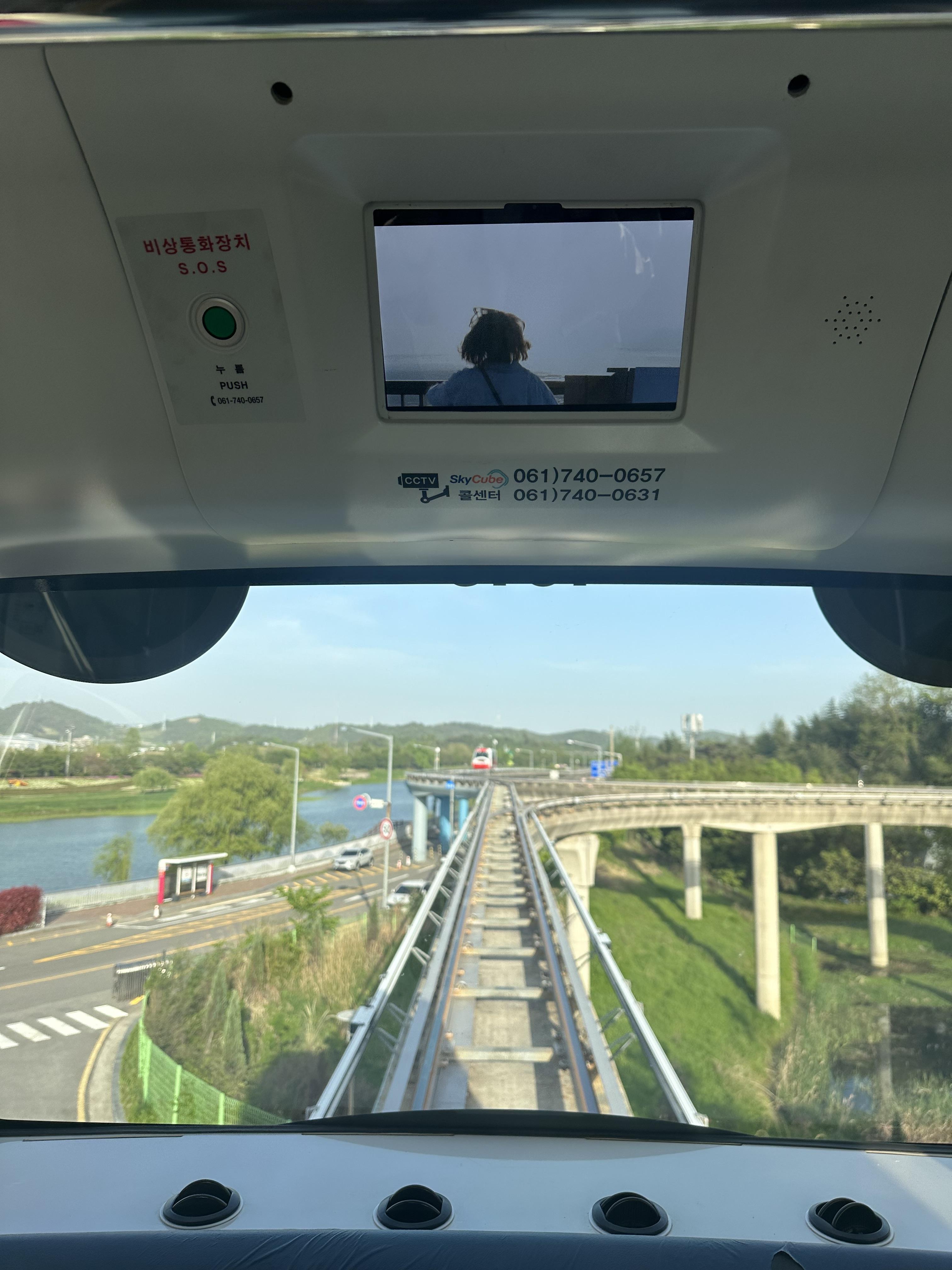 드디어 스카이큐브 하늘 택시에 탑승했습니다. 앞뒤로 3명씩 총 6명정도 앉을 수 있습니다. 체구에 따라 중량 초과시에는 인원이 좀 더 제한 될 수도 있을 것 같습니다. 처음 출발 할 경우 회차 구간이 보이게 됩니다. 반대편에는 순천만역에서 스카이큐브로 오는 하늘 택시가 보이고 있습니다. 별도의 회차가 필요없는 소형궤도무인차량(PRT) 하늘택시는 자체적으로 회차를 통해 더 빠르게 움직일 수 있습니다.