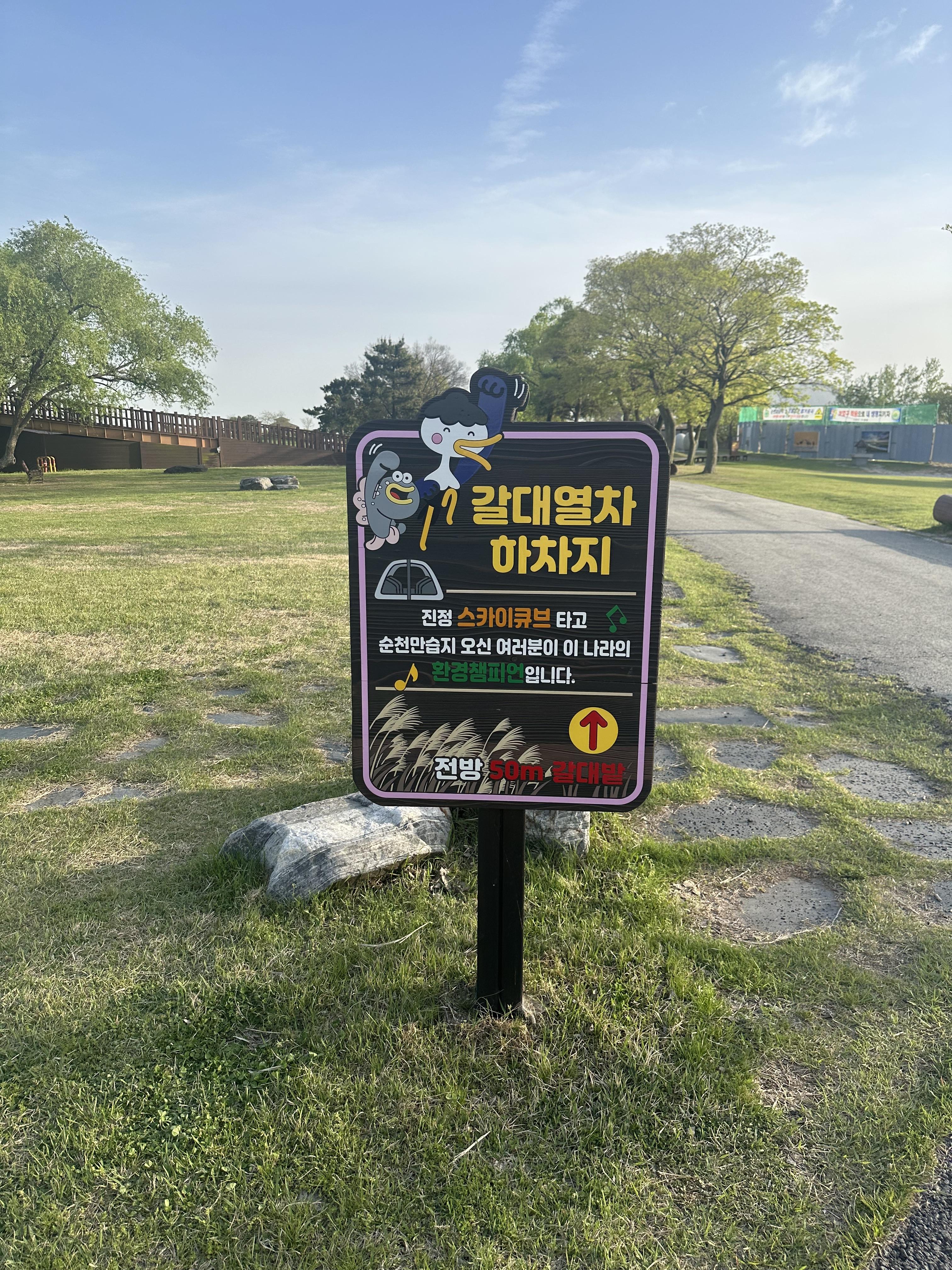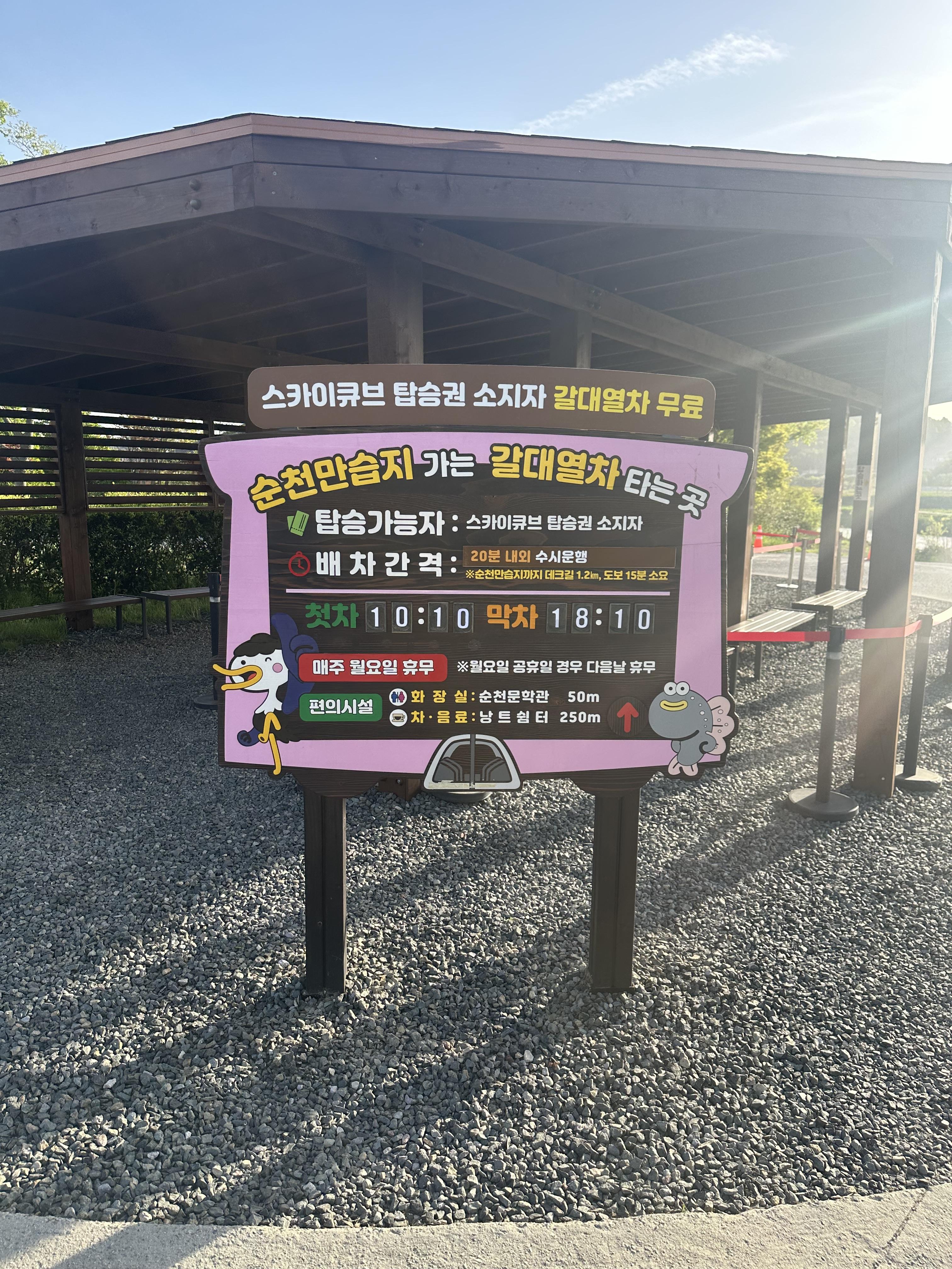 갈대 열차를 타고 순천만 갈대열차 하차지에 빠르게 도착했습니다. 갈대열차 승차장은 하차장 건너편에 있습니다. 스카이큐브 왕복 티켓을 구매 하셔서 순천만 구경 후 다시 타야 한다면 위치 잘 기억했다가 타시면 됩니다. 다만 갈대 열차는 스카이큐브 막차 시간에 맞춰서 종료되기 때문에 스카이큐브 막차 시간에 30분 더한 시간에 맞춰서 다시 돌아오셔야 합니다.