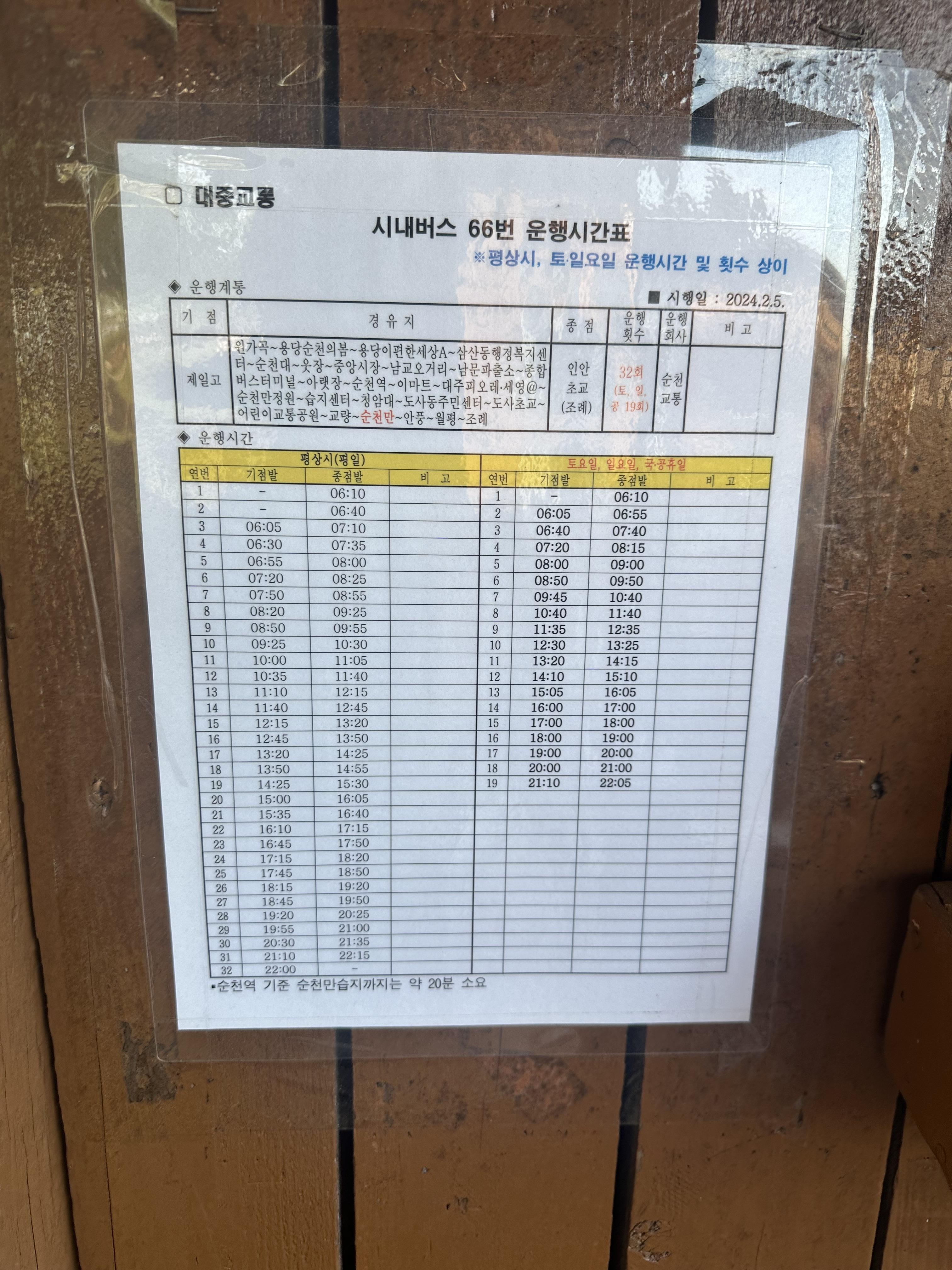 만약 보조전망대에서 일몰을 보신다면 이미 스카이큐브는 못타기 때문에 입구에 가셔서 순천역으로 가는 66번 시내버스 시간표를 찍어두시면 도움이 될것 같습니다. 오히려 스카이큐브 타고 갈아타는것보다 66번이 30분정도면 순천역과 순천시내로 가르니 더 빠르게 갈 수 있습니다.