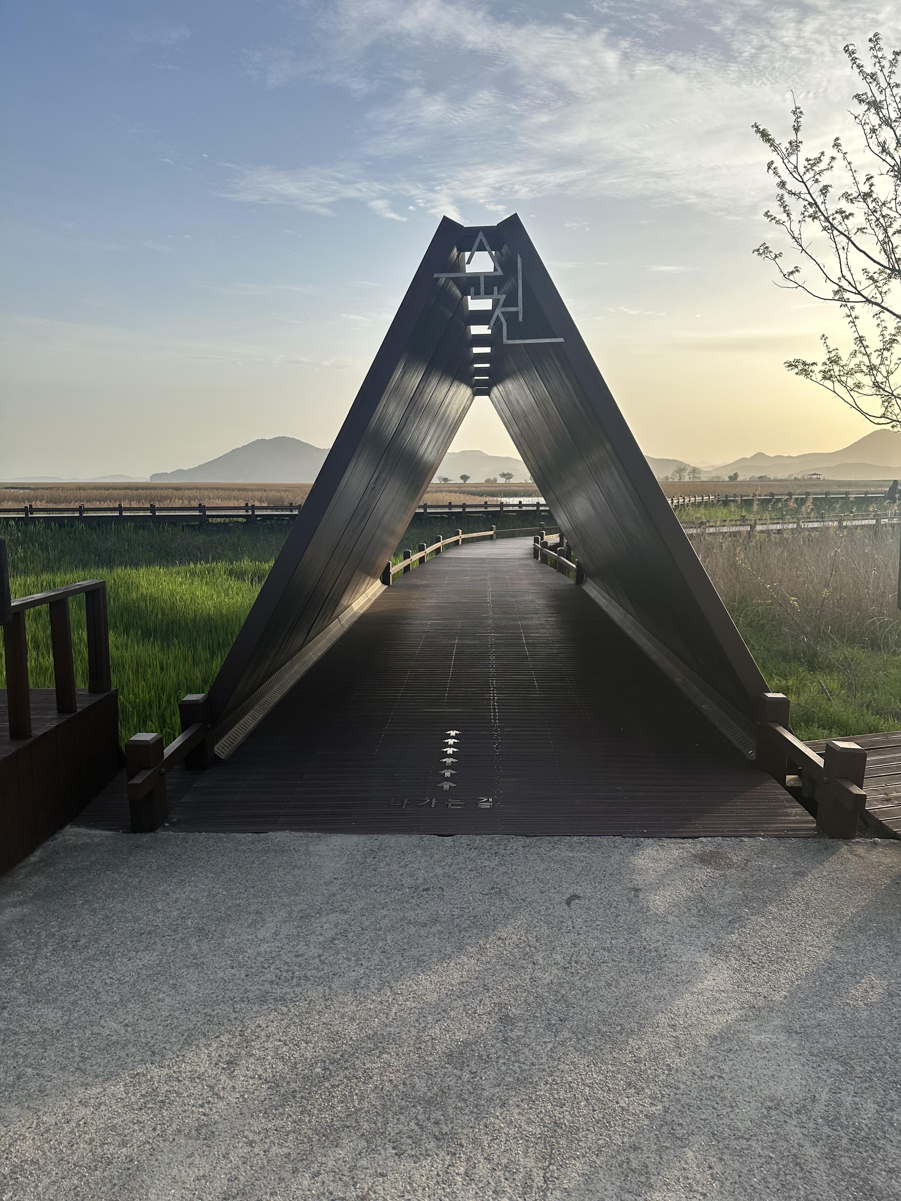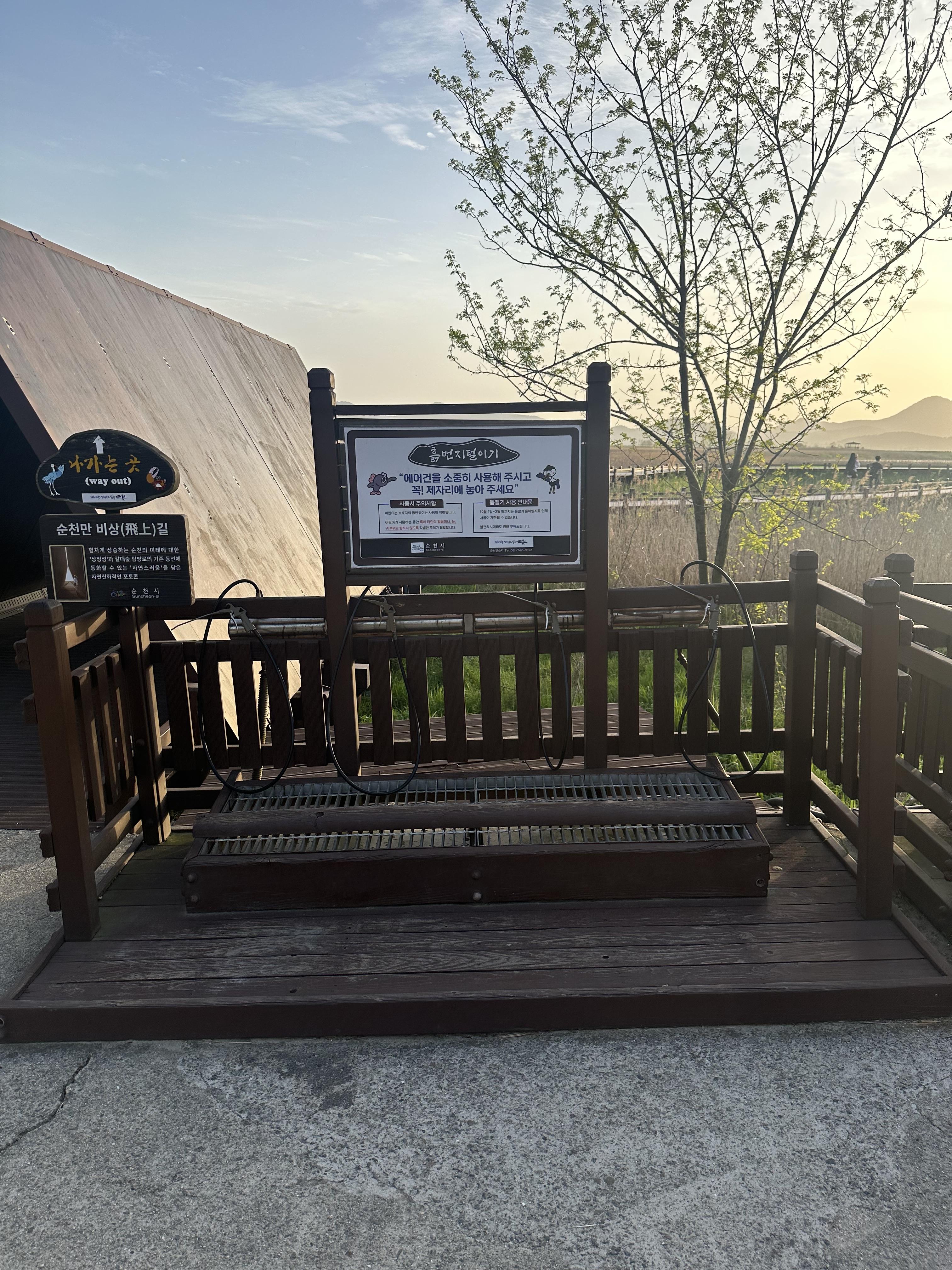 용산전망대와 화장실 가는 길에는 이렇게 삼각형 모양의 지붕이 있습니다. 이곳은 포토존으로 활용된다고 합니다. 원래는 없던거 같은데 최근에 생긴것 같습니다. 그리고 지붕을 지나면 바로 옆에는 순천만 습지와 용산전망대에서 지나오다보면서 옷에 묻는 흙 먼지 등을 털어 낼 수 있는 에어건이 있습니다.