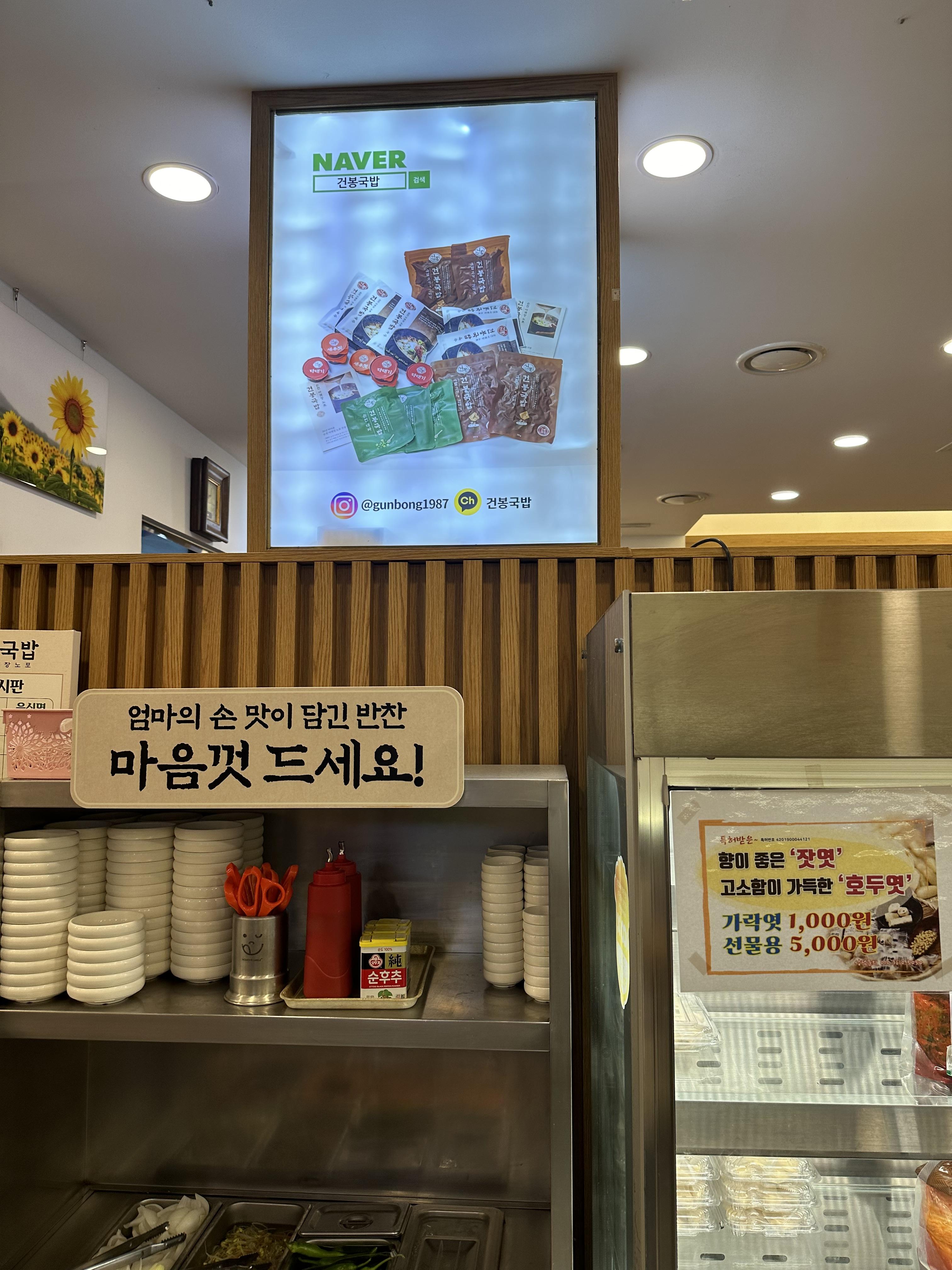 건봉국밥에서 반찬으로는 다양하게 나오는데요. 특히 김치가 정말 맛있습니다. 건봉국밥 반찬은 처음에 기본 반찬만 제공되고 나머지는 무한 리필방식으로 먹고 싶은만큼 남김없이 가져가시며 됩니다. 여기 김치가 정말 맛있고요. 김치는 실제로 판매되고 택배로도 받아볼 수 있다고 합니다. 김치랑 건봉국밥 밀키트 외에도 향이 좋은 잣엿과 고소함이 가득한 호두엿 등도 판매되고 있습니다. 자세한 사항은 매장 가서 한번 직접보시면 좋을 것 같습니다. 선물용으로도 판매하니 선물 할 분이 있다면 선물하셔도 좋을 것 같습니다.