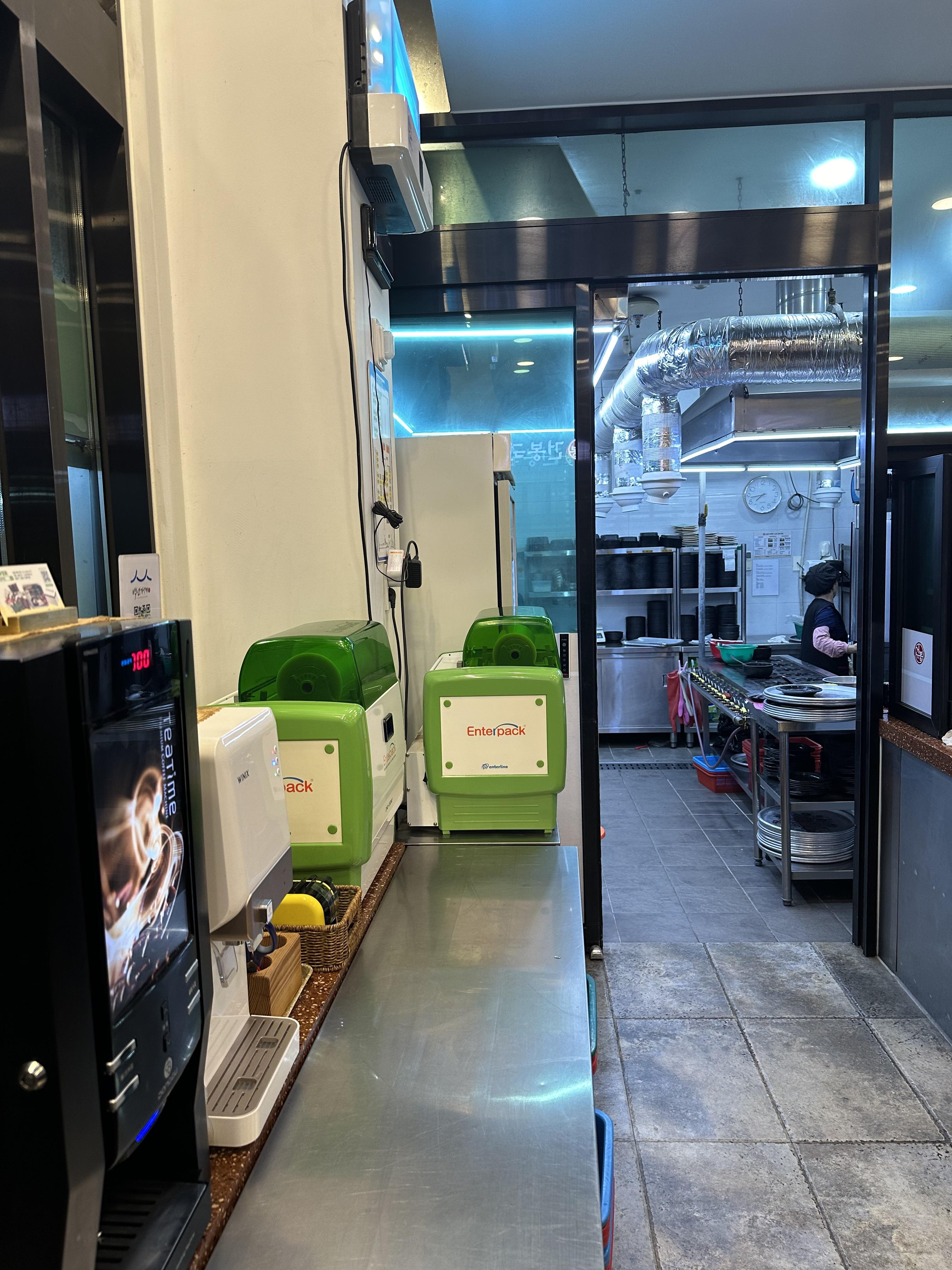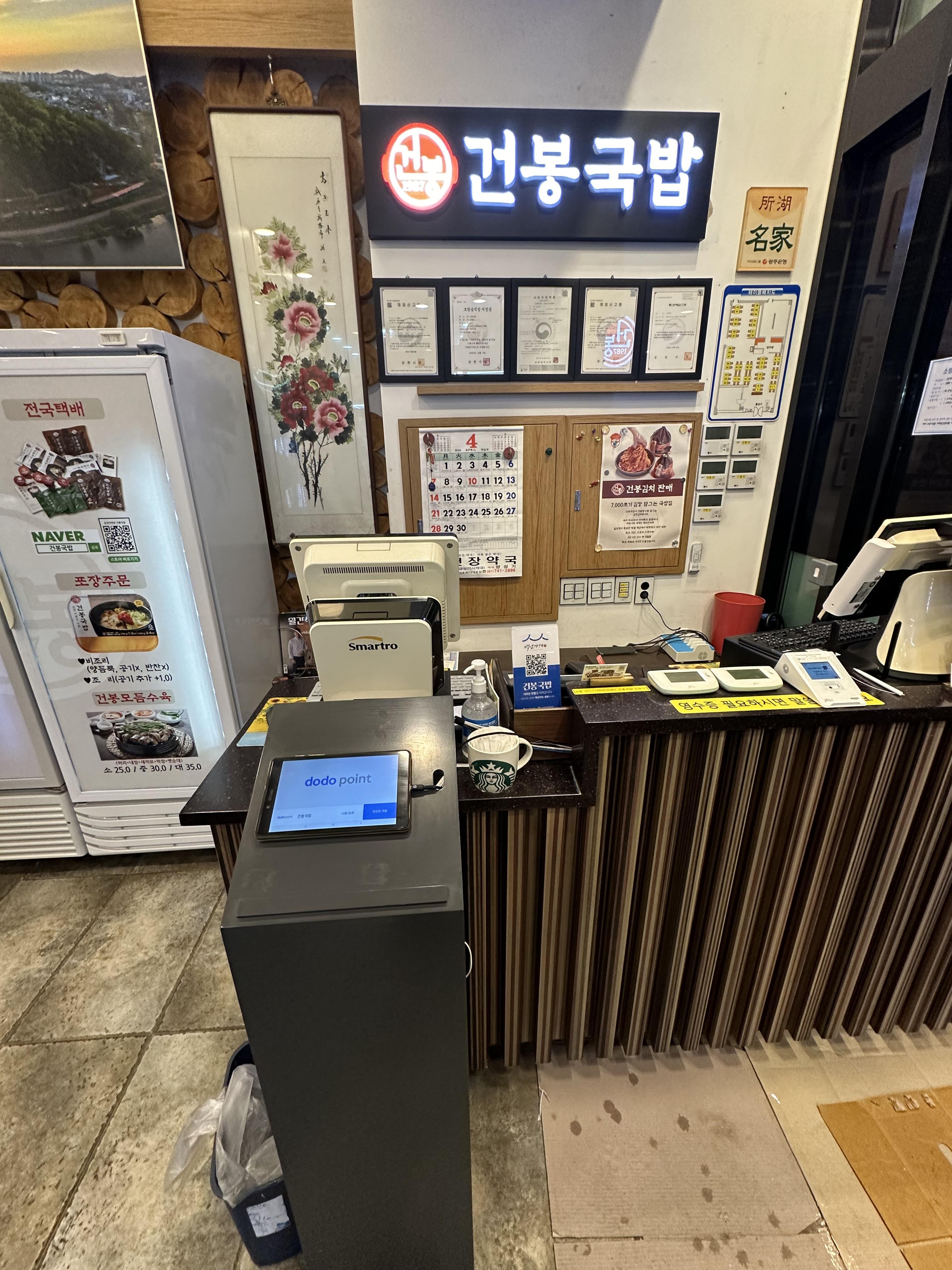 순천 건봉국밥에서 맛있게 식사를 하고 계산을 하기 위해 카운터로 갔습니다. 매장 입구에 들어서면 우측에 카운터가 있고 왼쪽에는 음식을 조리하는 주방이 있습니다. 그리고 가운데에는 음식 먹고 후식으로 마실 수 있는 믹스커피 자판기도 눈에 보이고 있습니다. 포스팅 하면서 순천맛집 건봉국밥의 성과노력으로 인증 내용을 소개해드렸는데요. 그 중에서 2023 블루리본서베이 수록이라고 있었습니다. 건봉국밥은 2022년까지 2022년에 수록 했다고 합니다. 그 외에 서울 최우수 레스토랑 인증서와 2스타 레스토랑 인증서 등 다양한 성과 노력을 볼 수 있습니다. 카운터에서 전국택배로 네이버 스마트스토어를 통해 건봉국밥 밀키트와 건봉 김치를 판매한다는 것도 볼 수 있습니다. 김치 정말 맛있으니 안먹어보셨다면 직접 주문보다는 순천 가서 한번 드셔보시고 건봉국밥이 생각날때마다 택배 주문 해서 먹어보시는것도 괜찮은 것 같습니다.