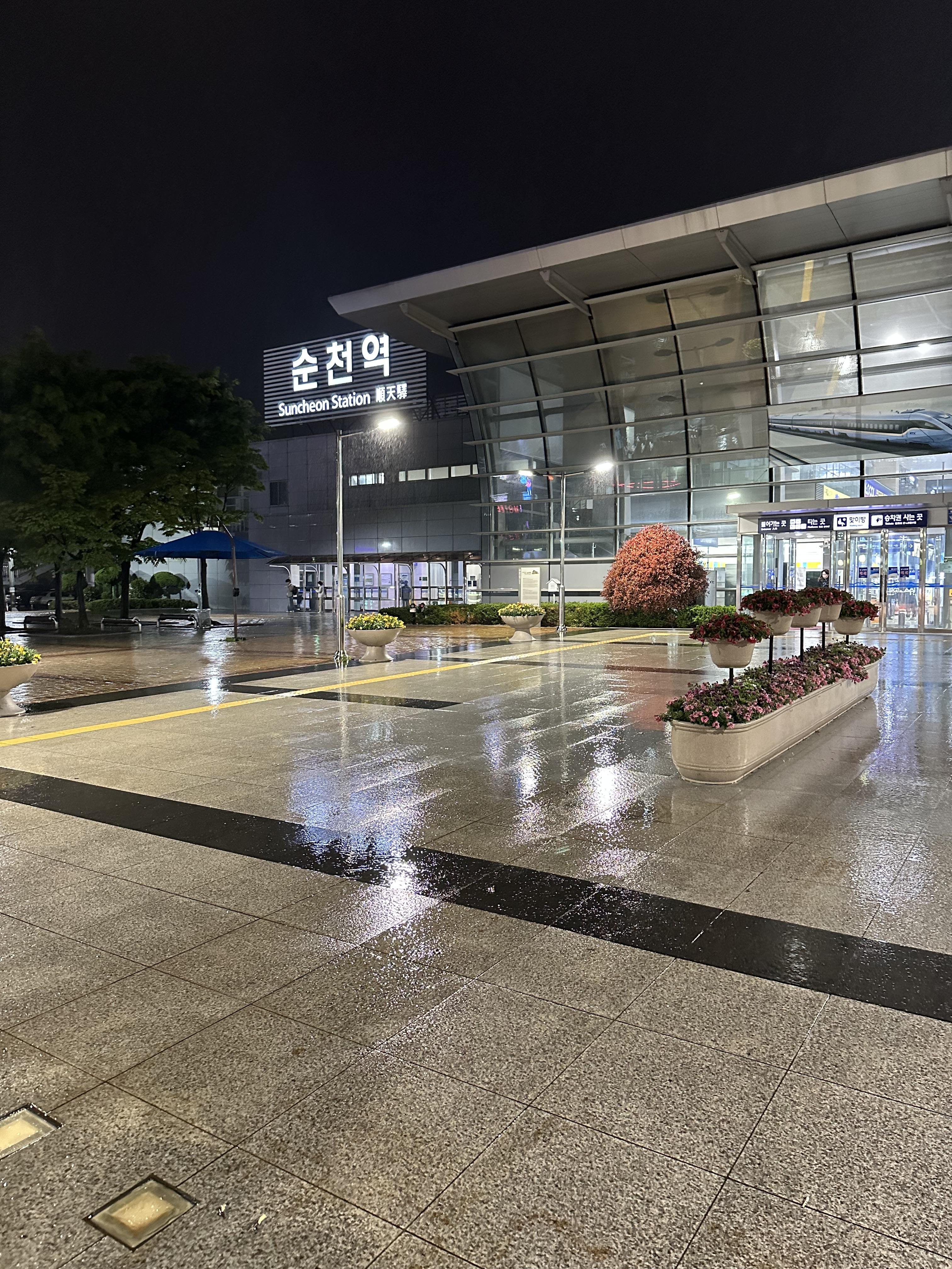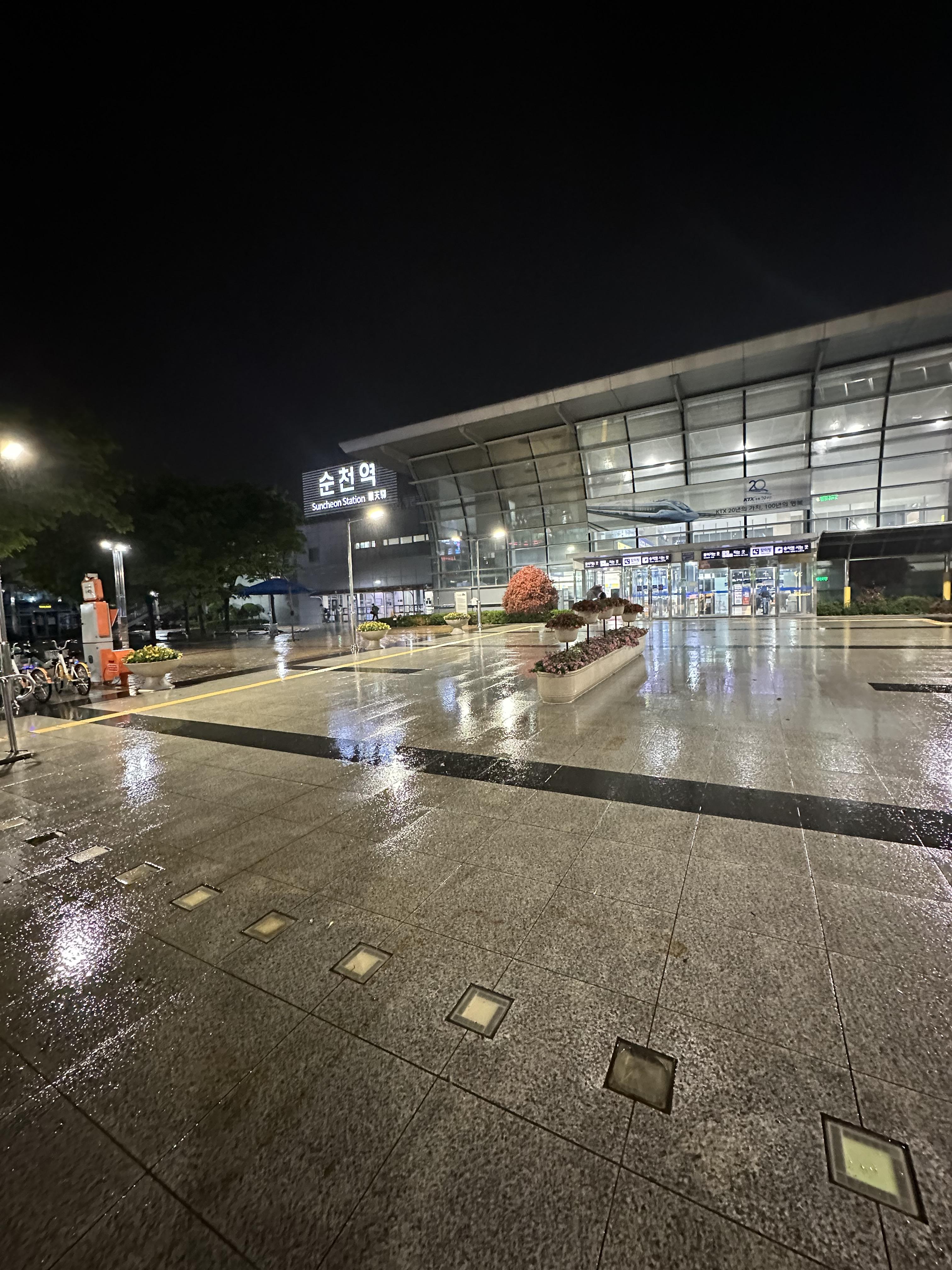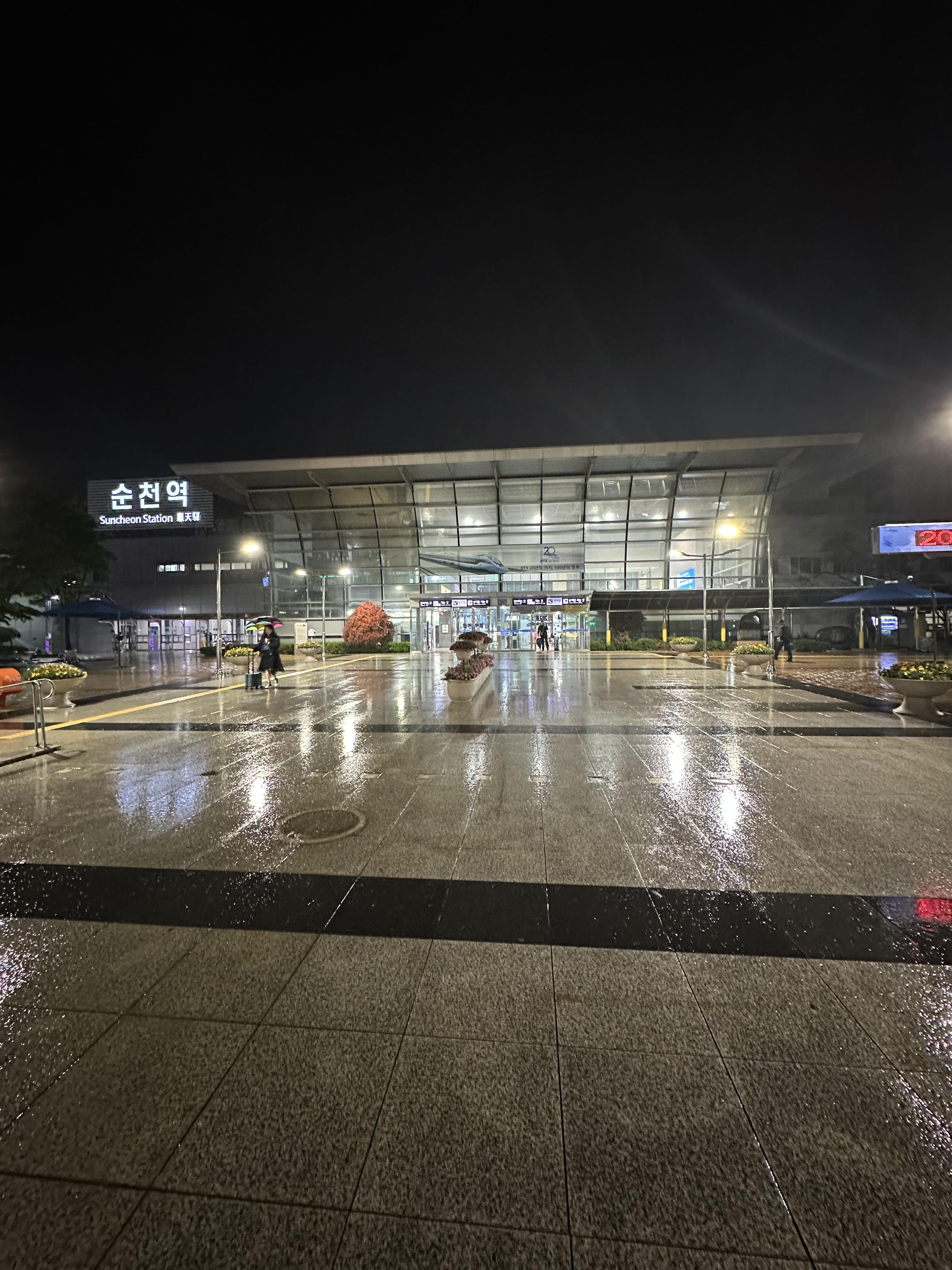 그래서 금요일만 되더라도 지방도시는 물론이고 일부 대도시의 동네시장에서는 야시장을 볼 수 있습니다. 제주도 서귀포 매일 올레시장의 경우 연중 내내 관광객이다보니 평일에도 야시장을 운영하고 있습니다. 시장을 보면 그 도시의 분위기를 알 수 있다고 해요. 그 도시의 먹거리도 먹어볼 수 있다고 하니 가보시면 좋을 것 같습니다. 제가 추천하는 야시장은 전남 순천과 경북 경주 그리고 제주도입니다. 정말 지긋지긋하게 건봉국밥에서 내장국밥을 먹고 나와도 비는 여전히 조금씩 내리고 있었습니다. 여행을 하다보면 이런일들이 있습니다. 특히 직장인들은 자기가 오고싶을때 올 수없고 미리 계획을 세우는데 애써 휴가를 써서 왔는데 비가 오면 정말 실망스럽고 힘빠지기 마련입니다. 그래도 저녁 때는 비가 많이 그치고 조금 내려서 우산없이 먹은거 소화도 시킬 겸 순천역까지 걸어갔습니다. 그리고 순천역의 밤을 보며 순천이마트에 있는 에어비앤비까지 걸으며 2일차의 여정을 마무리 합니다. 다음 포스팅에서는 이틀동안 순천여행을 머물렀던 아파트안에 있는 에어비앤비 후기를 전해 드리도록 하겠습니다.