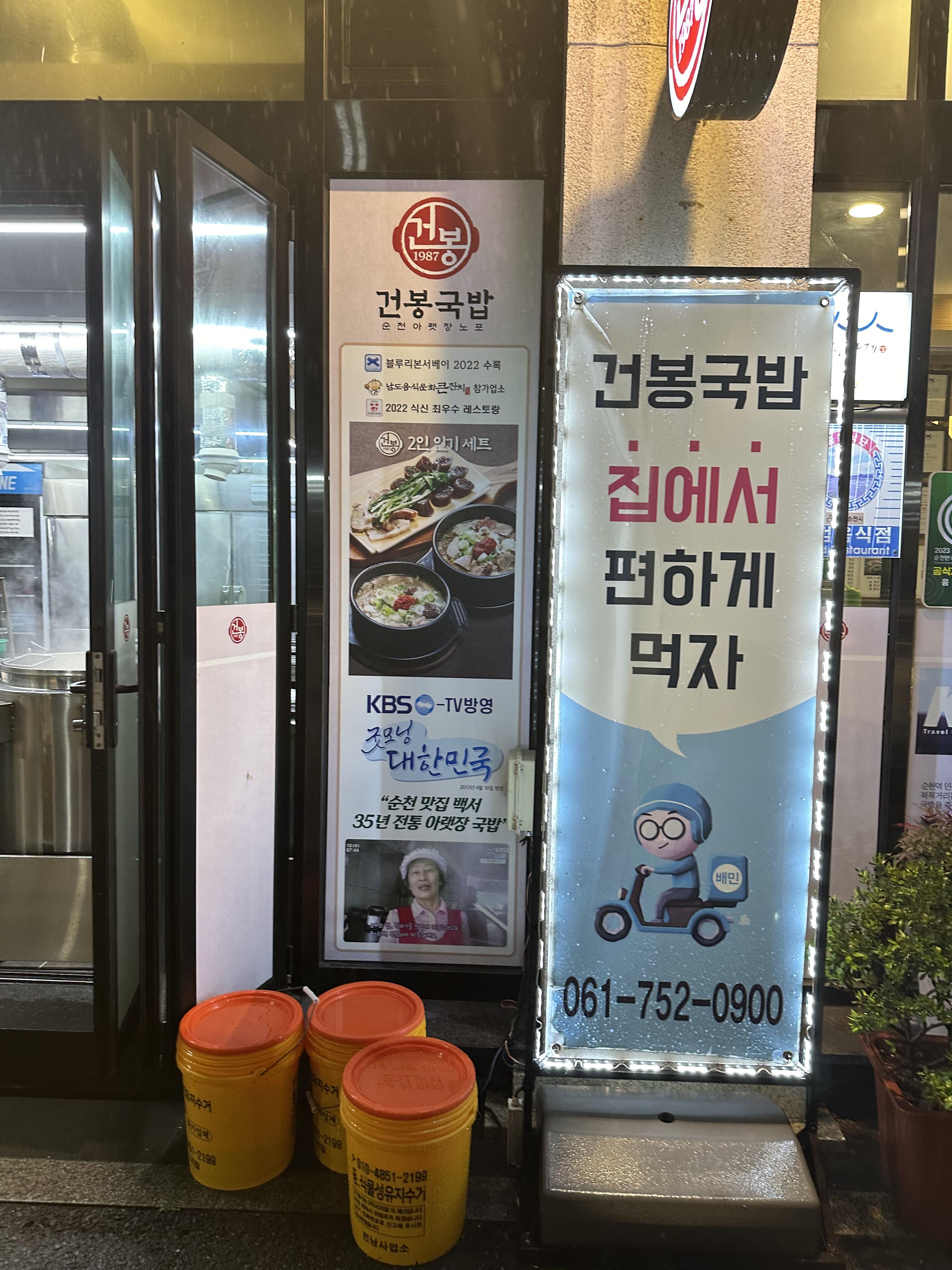 오늘도 즐거운 일요일이 지나가고 있습니다. 제가 사는 경기도 안산에는 가을비가 내리고 있습니다. 기후 위기로 인해서 비가 와도 이것이 정상적인 날씨에 내리는 비가 맞는지 의심이 갑니다. 한참 장마가 내려야 하는 시기에는 장마비가 오지 않고 추석 연휴에 태풍가 비가 오니 좋지는 못하는 것 같습니다. 이번 4월 순천 여행도 한참 날씨가 시원하고 맑아야 할 시기였는데 당시 여행할 때는 비가 하루 종일 오는 날이었습니다. 그리고 포스팅을 하는 10월 초 긍정적인 마음을 가지고 가을비라고 생각 하려고 합니다. 이렇게 가을비가 오면 더 이상 더운 여름은 오지 않는구나 하면서 2024년을 마무리 하며 내년 여름에 대해 대비 해야겠다고 다짐을 하게 됩니다. 그리고 즐거운 주말을 마무리 하면서 순천 여행의 포스팅을 계속 하려고 합니다. 오늘 포스팅은 순천 뚜벅이 여행 2일차의 마지막 여정에 대해 정리 해보려고 합니다. 1일차에 비하면 비가 와서 많이 보지 못했습니다. 비가 와서 우산 쓰고 땅이 좋지 않은 낙안읍성을 돌아다니느라 혹시나 미끄러져 넘어지지 않으려나 조심해서 그런지 유독 더 피곤한 하루였습니다. 1일차에 비해 2일차는 전해드릴 내용도 많이 없습니다. 그래서 오늘 포스팅은 2024년 기준으로 순천에서 국밥집만 37년을 해온 건봉국밥에 대해 포스팅을 해보려고 합니다.