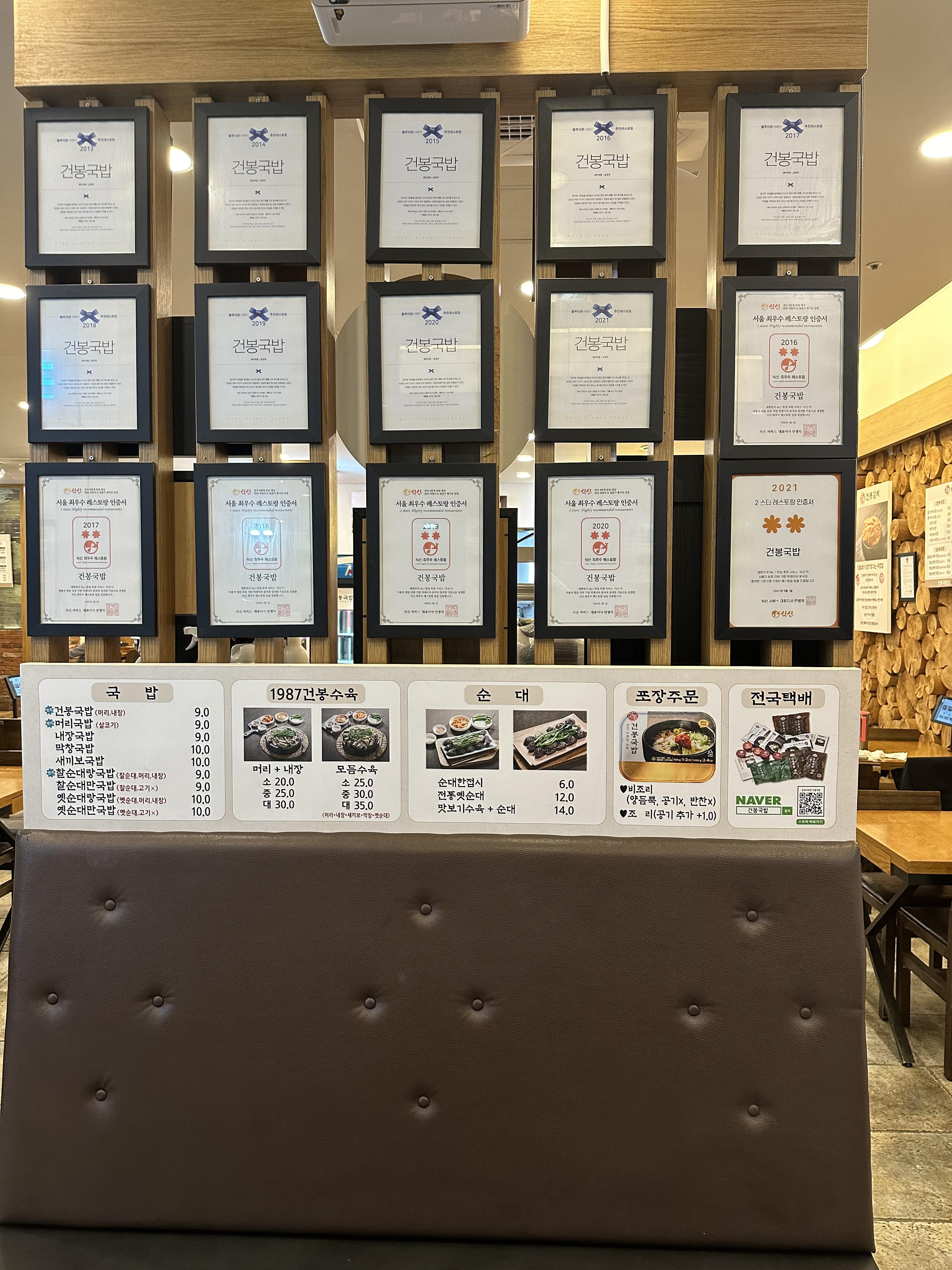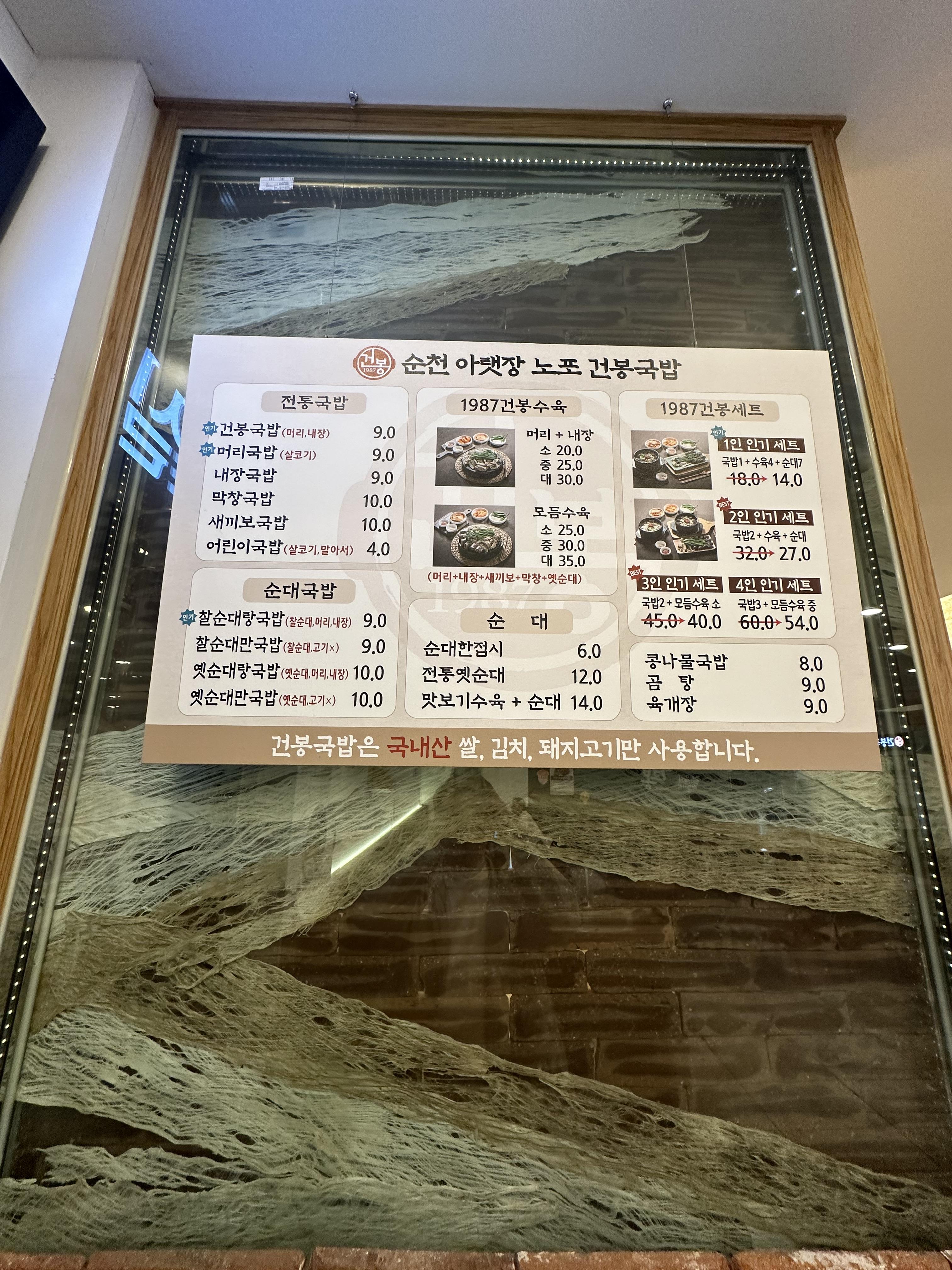 다행히 8시가 다 되가는 시간이라 그런지 한참 바쁜 식사 시간은 끝나고 건봉국밥 안에도 여유로웠습니다. 일부 사람들은 줄 서서 먹는것도 다 그런 이유가 있다면서 그것도 추억이라고 하는데요. 사람마다 다르기 때문에 저는 굳이 줄서서 먹기보다는 좀 더 여유롭게 사람 없을 때 바로 들어가서 먹는 것을 좋아합니다. 바쁘게 돌아가면서 변화하는 세상에서 여행만큼은 여유롭게 보내고 싶은 생각입니다. 건봉국밥에 처음 가신다면 당연히 건봉국밥을 드시는 것을 추천합니다. 저는 내일로때부터 건봉국밥을 왔고 순천에 오면 2박3일 여행중에 1-2번은 꼭 오기 때문에 오늘은 내장국밥을 먹기로 했습니다. 건봉국밥집에서는 메인음식인 건봉국밥과 머리국밥이 가장 인기가 있다고 합니다. 메뉴판에도 그렇게 되어있습니다.