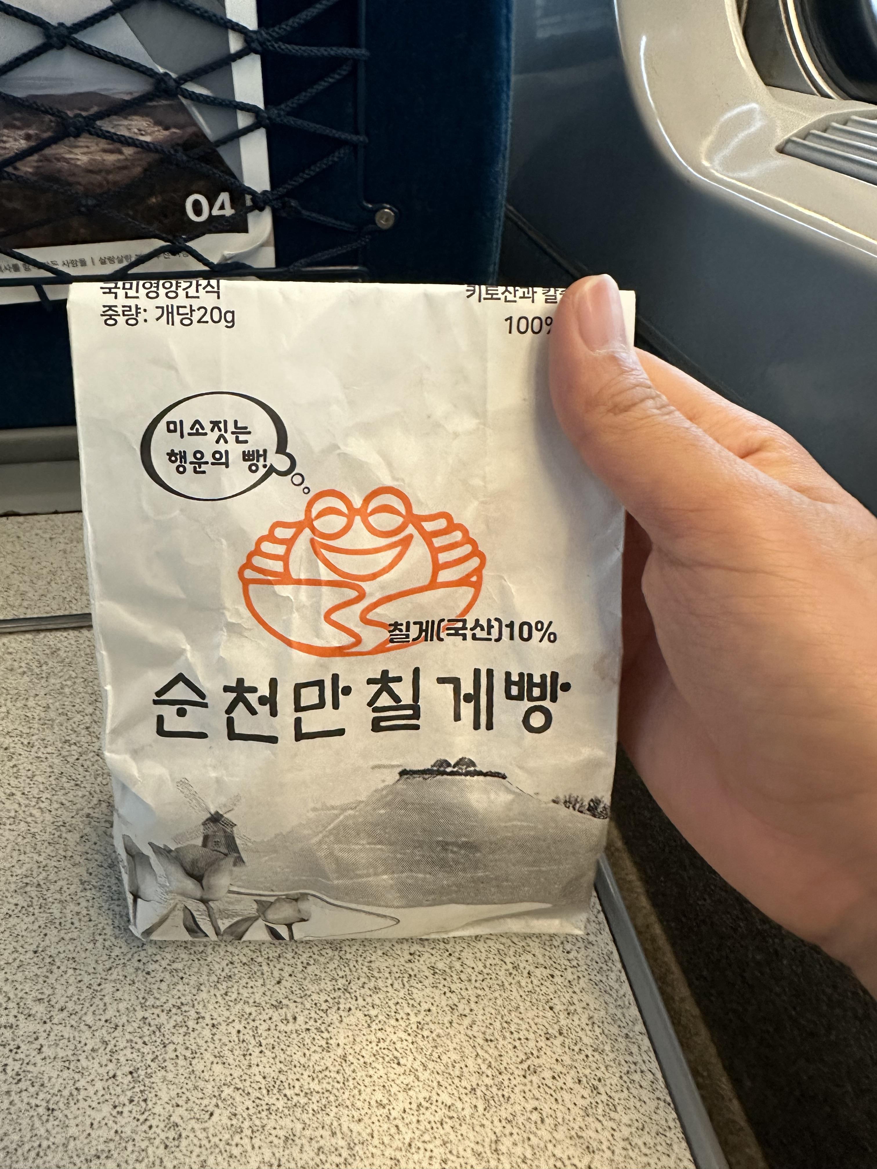 그리고 KTX 열차에 탑승했습니다. 순천에서 용산까지는 KTX 열차나 일반열차나 큰차이는 없긴 합니다. KTX를 타더라도 3시간 정도는 걸리기 때문에 이동하면서 가볍게 먹을 수 있는 순천만 칠게빵을 샀습니다. 순천만습지가 순천만의 대표 관광지로 불릴만큼 유명해서 인지 순천역에도 순천만의 칠게가 그러져있는 빵을 판매하고 있었고 순천만을 기념하기 위해 한보지 구매했습니다.