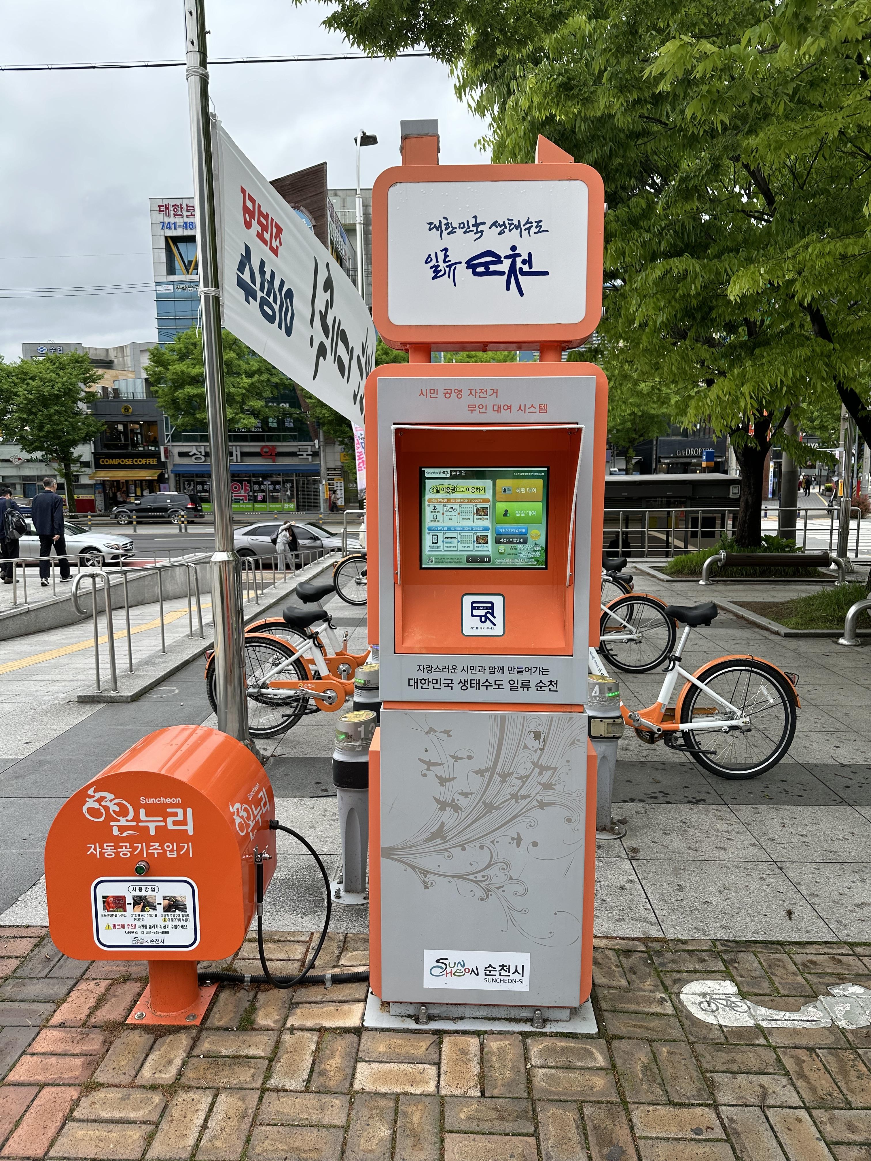 순천역 앞에는 공영 자전거 무인 대여 시스템이 2곳 정도 있습니다. 첫번째로 소개 해드릴 자전거 무인 대여 시스템은 순천 시민을 위한 순천시에서 제공하는 자전거 무인 대여시스템입니다. 공기주입기도 있어서 자전거 타기전에 바퀴 바람을 체크해서 공기도 넣을 수있습니다. 제가 어렸을 때는 무인 자전거는 생각하지 못했습니다. 집앞에 공원에서 자전거 대여소는 있어서 당시 기술이 발달하기전이라 사람이 직접 돈을 받고 빌려주는 정도인데요. 코로나 이후로 무인 비대면 서비스와 같은 기술들이 급속도로 발전하며 등장하게 되었던 것 같습니다. 사람을 직접 보지 않아도 되기 때문에 기어븐 인건비를 줄일 수 있고 서로 얼굴을 보지 않아도 되기 때문에 편해졌습니다. 그러나 한편으로는 사람이 없어서 편한점도 있지만 자전거 상태를 체크하는 부분까지 자전거를 대여하는 사람의 몫이 되었습니다. 저도 집앞에 카카오 바이크를 타는데요. 혹시 모르는 상황을 대비해서 자전거 타기전에 바퀴바람도 체크하고 브레이크는 잘 잡히는지 체크하고 있답니다.