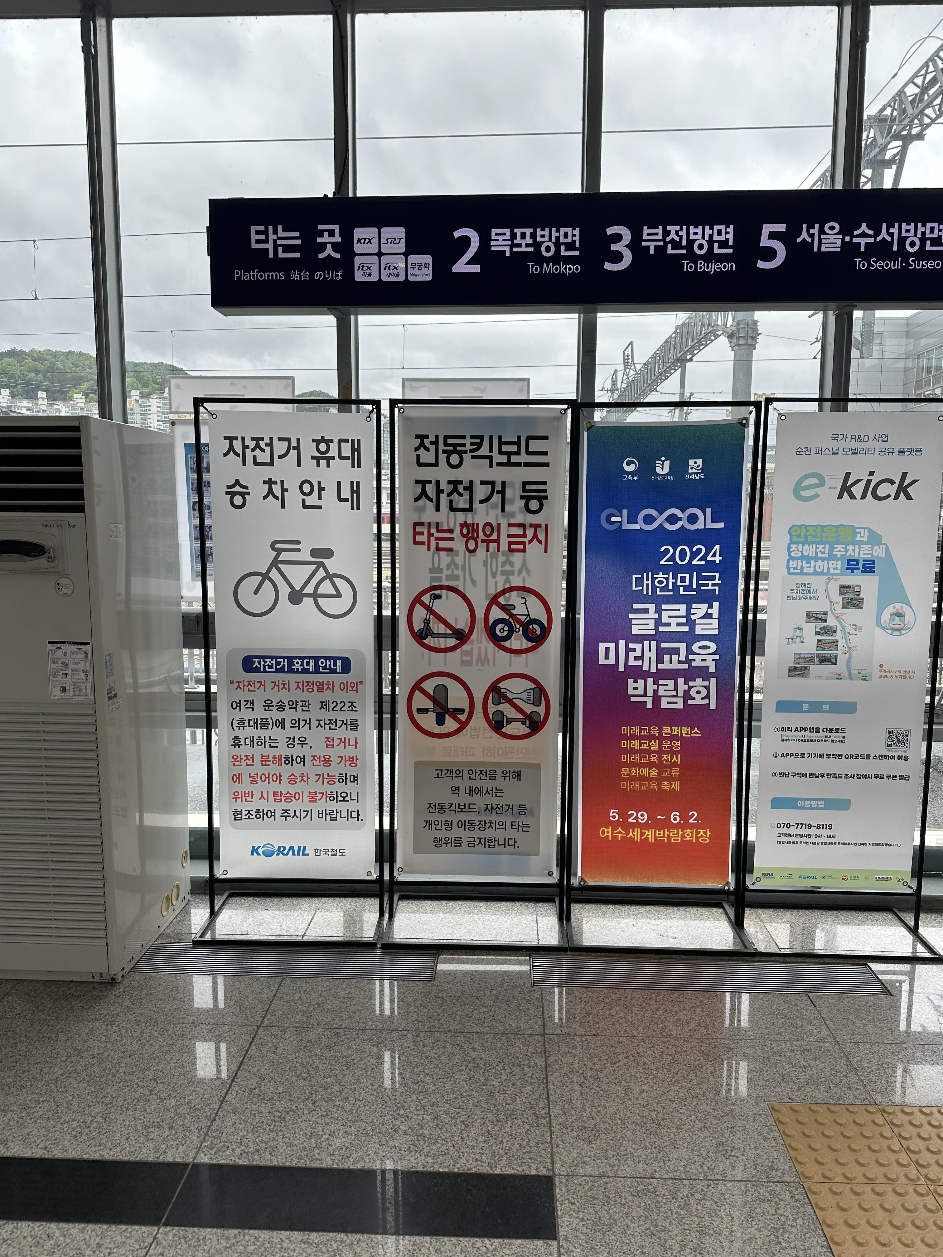 이제 열차를 타려가려고 합니다. 순천역 대합실은 그렇게 넓지 않지만 열차를 타러 가는 승강장은 높은 에스컬레이터를 타고 올라가게 됩니다. 에스컬레이터 앞에는 순천과 그리고 철도에 대한 다양한 정보를 볼 수 있습니다. 순천역 앞에서 e-kick라는 자전거 대여 서비스를 다시 한번 볼 수 있습니다. 지정된 장소에만 반납하면 무료라고 합니다. 지정된 장소가 맞는다면 꼭 타보시는걸 추천합니다. 전동차를 타기전에는 자전거를 접거나 완전 분해하여 전용 가바에 넣어야 승차가 가능하며 위반시에는 탑싀 불가능하다고 합니다. 그 외 전동킥보드나 개인형 이도장치는 타는 행위도 금지되어있다고 합니다.