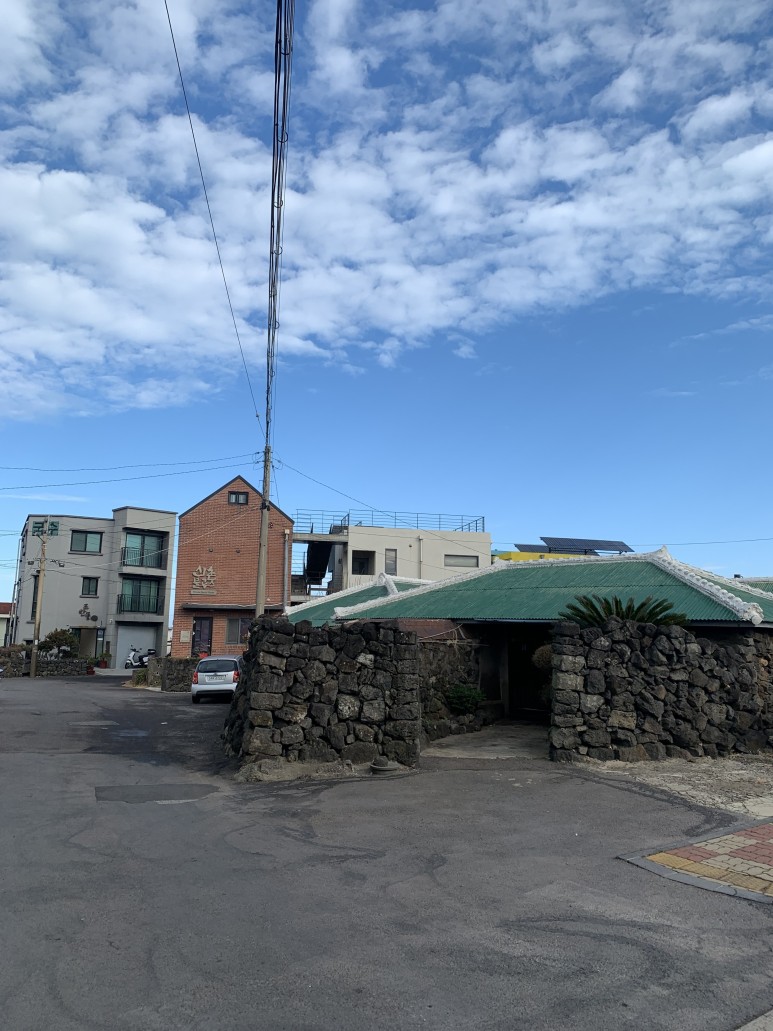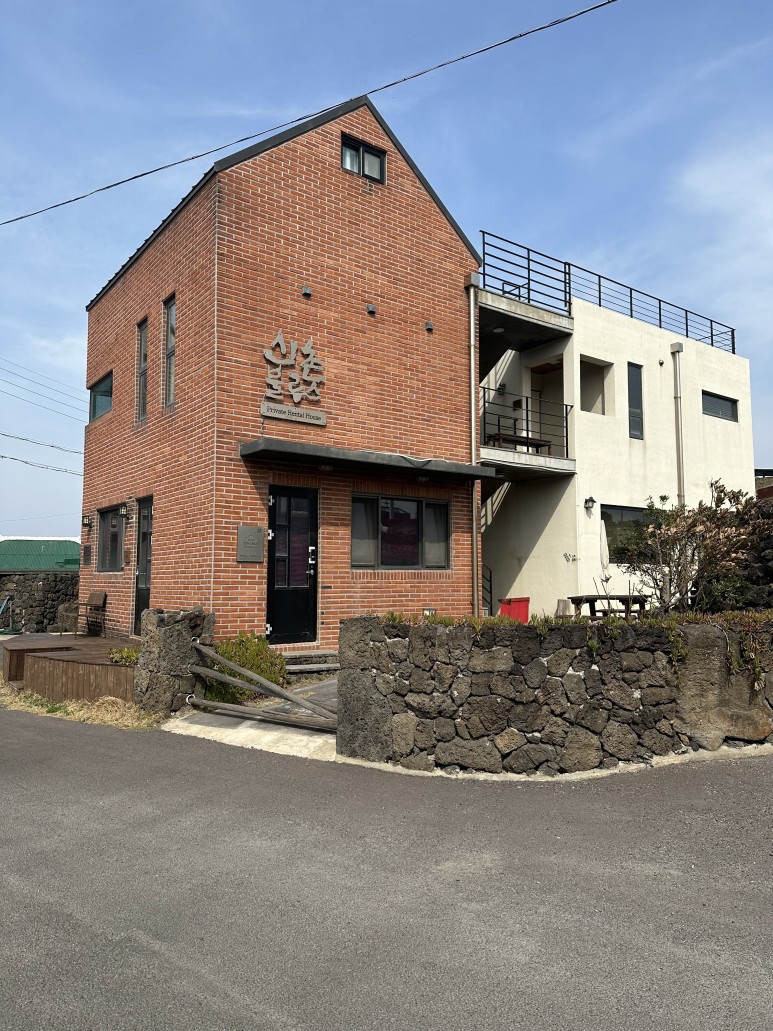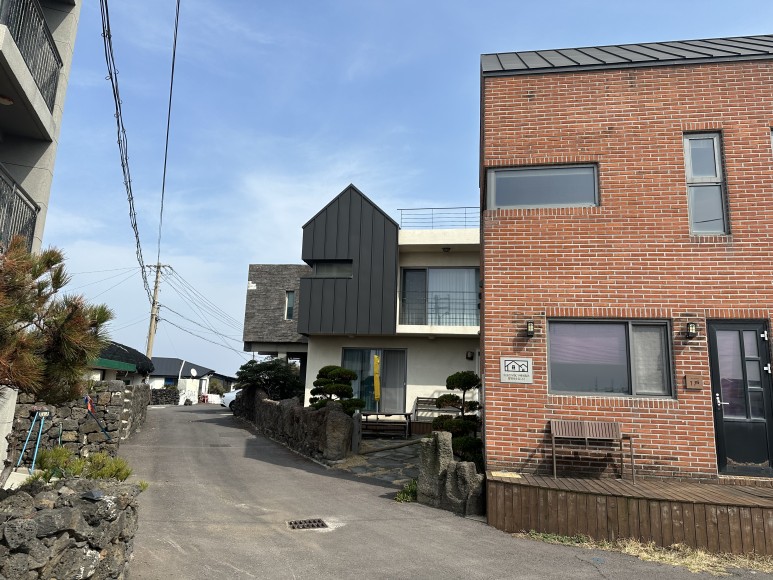 조천읍에 위치한 신촌블루스는 1호동, 2호동, 독채펜션으로 총 3개동으로 구성 되어 있습니다. 위에 사진에서 보시면 우측 앞부분이 제가 머물렸던 1호동이구요. 바로 그 뒤가 2호동, 좌측은 독채펜션인데 시골집 개조해서 정말 마당까지 있는 집이에요.