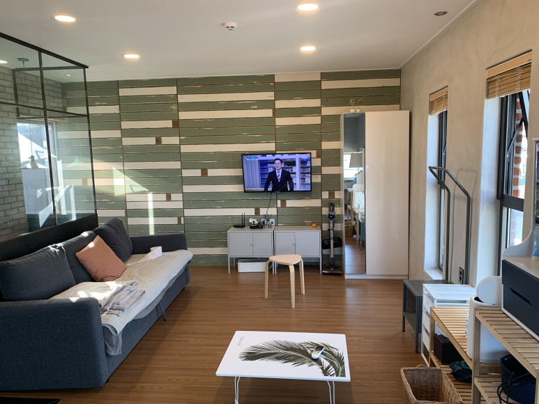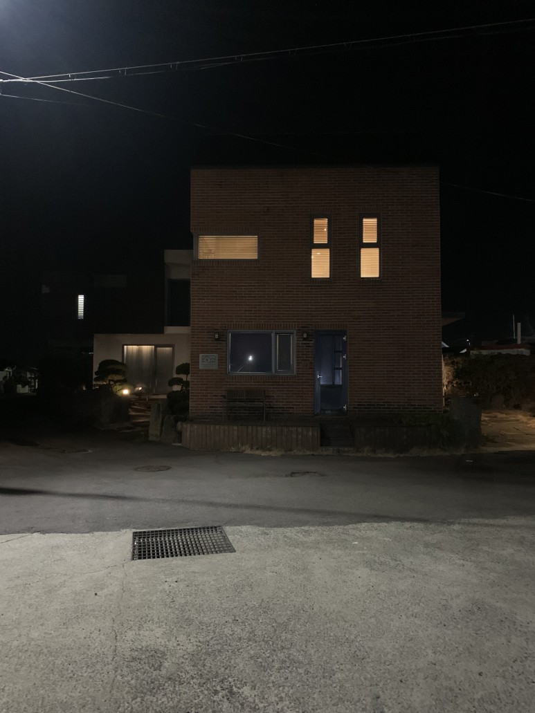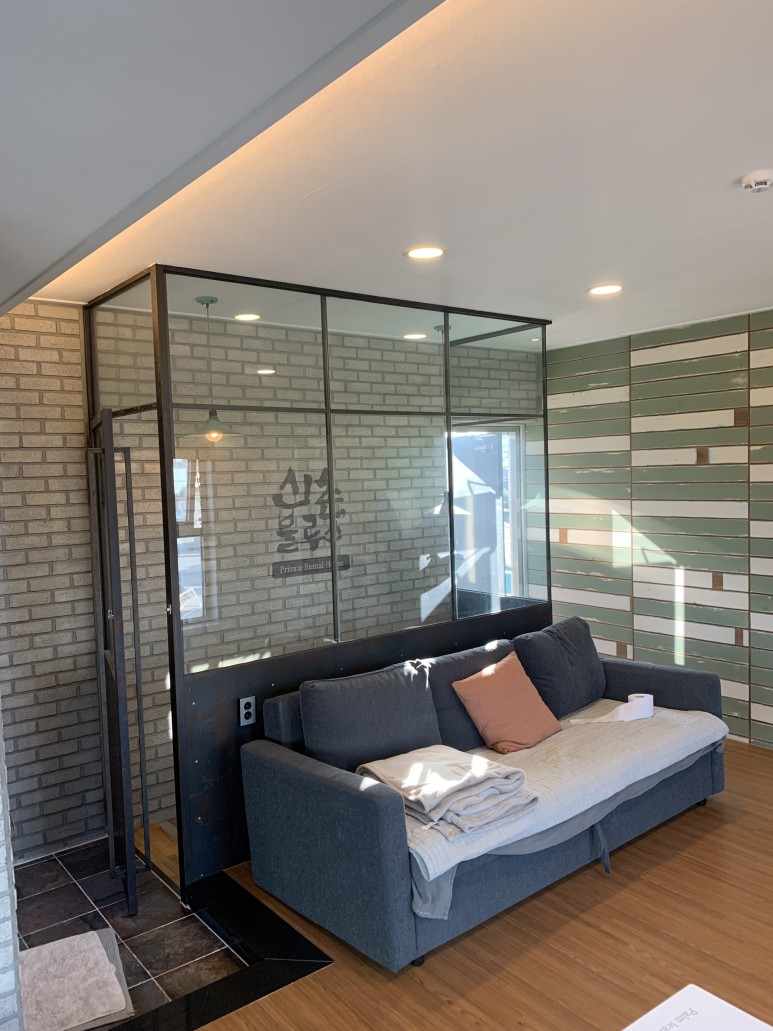 1층으로 내려가면 이렇게 거실이 보였습니다. 밤이라 아무것도 보이지 않았지만 아침에 일어나 블라인드를 열면 바다가 보였습니다. 신촌블루스는 혼자서도 이용할 수있지만 가족, 연인끼리 와도 정말 좋을 것 같습니다.