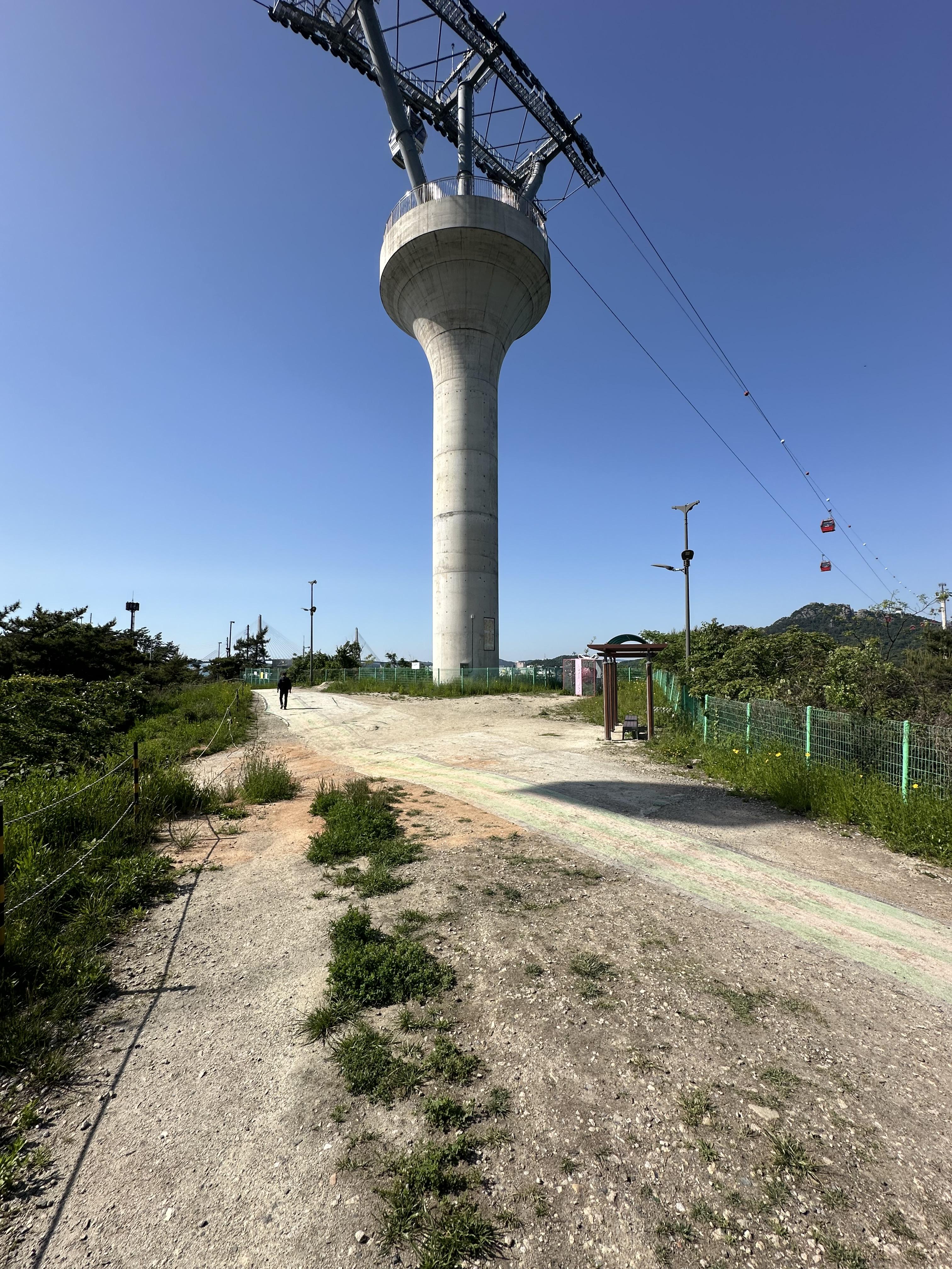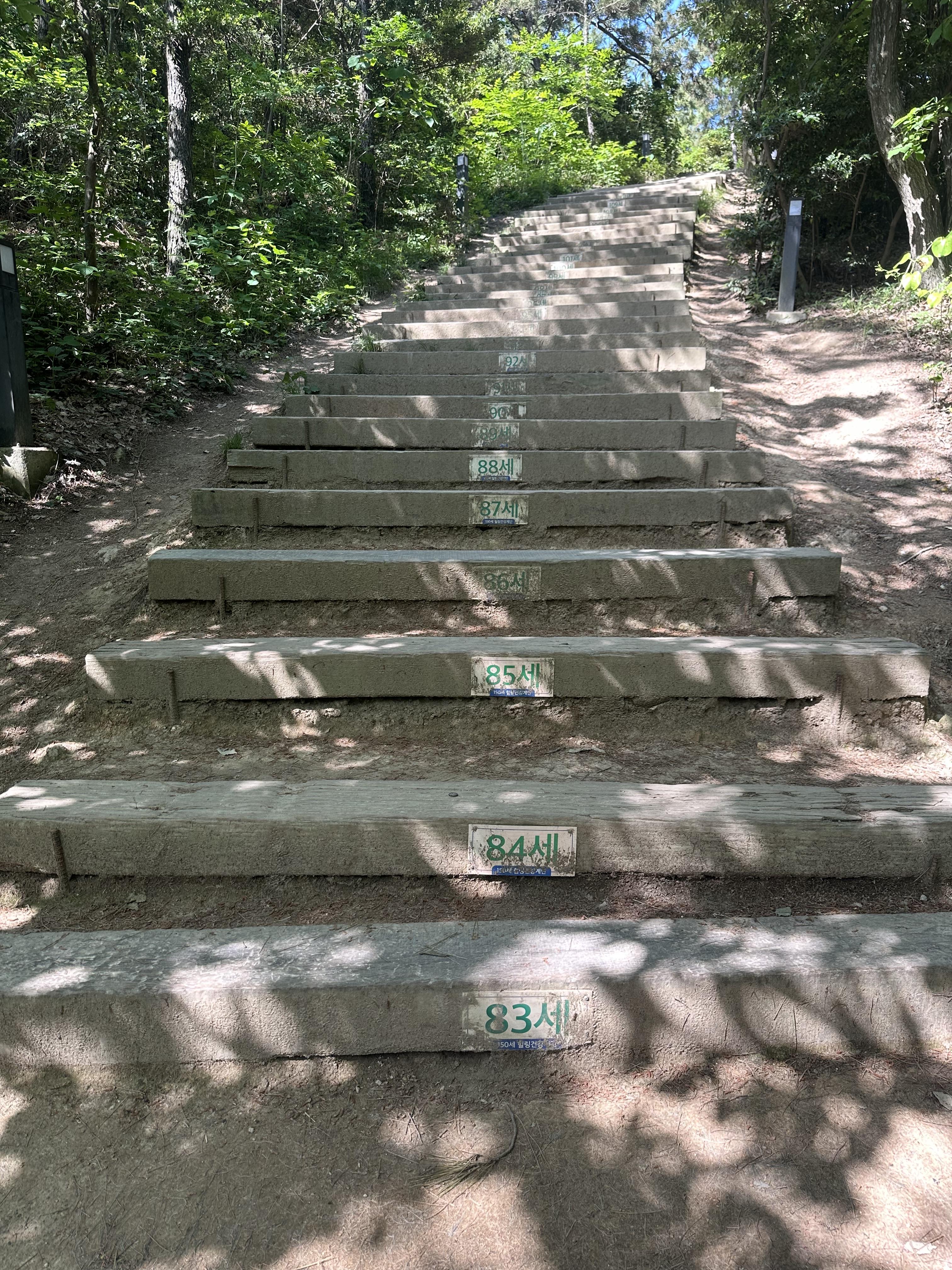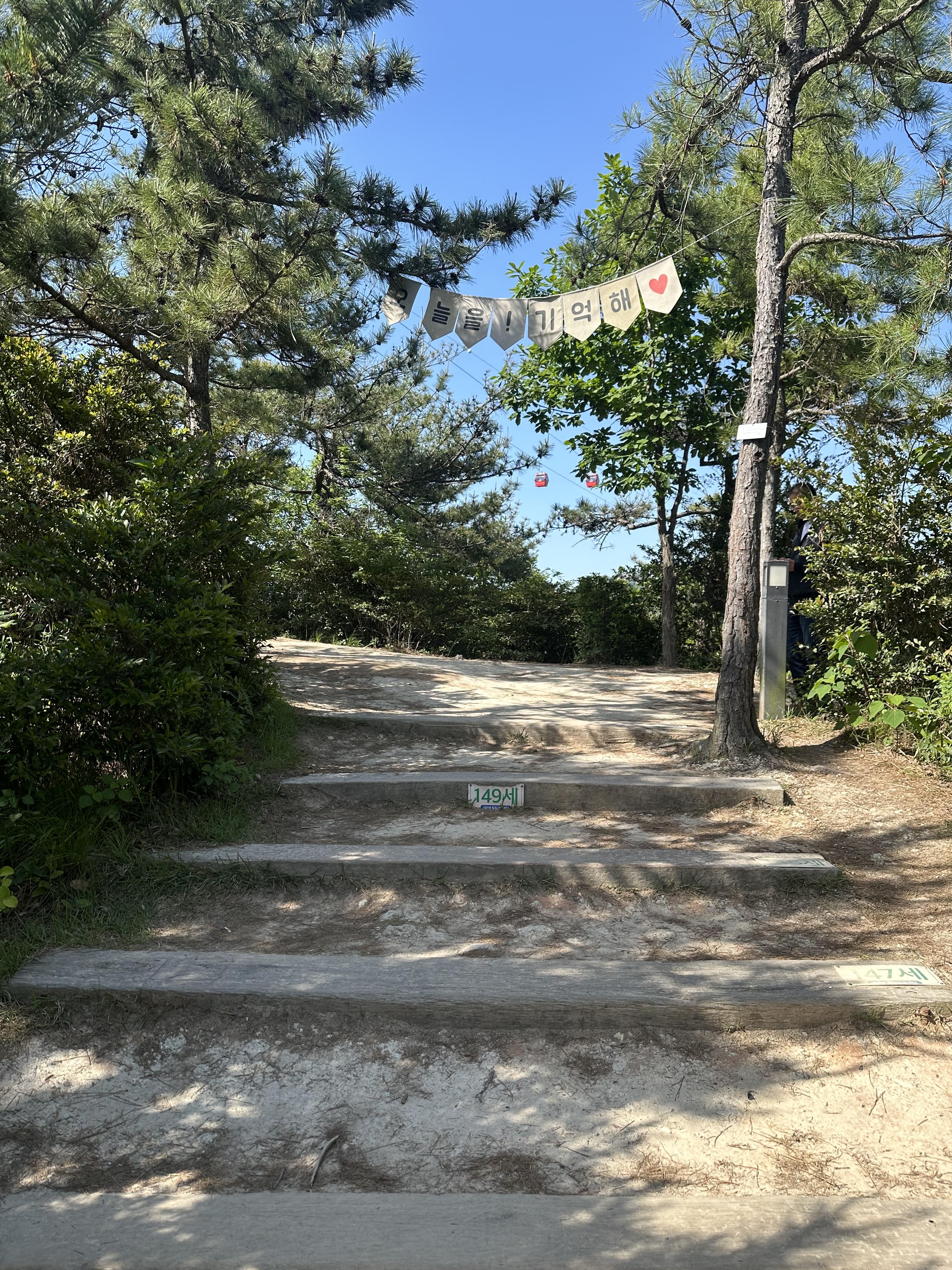 이름은 150세 힐링건강계단이라는 것입니다. 1세부터 150세까지 총 150개 계단을 설치했습니다. 정말 창의적인 아이디어 인 것 같습니다. 일반적인 흙을 밟고 올라가는 산책로는 아무래도 평평한 길이 아니기 때문에 미끄러질 수 있지만 계단이 있다면 좀 더 안정적으로 올라 갈 수 있는 것이 특징입니다. 계단마다 나이가 적혀있어서 올라가는데 정말 지루하지 않았습니다. 그렇게 흥미로운 150세 힐링 건강 계단을 오르면 짧은 등산로가 끝나고 제가 타고 왔던 목포해상케이블카의 탑이 보이게 됩니다.