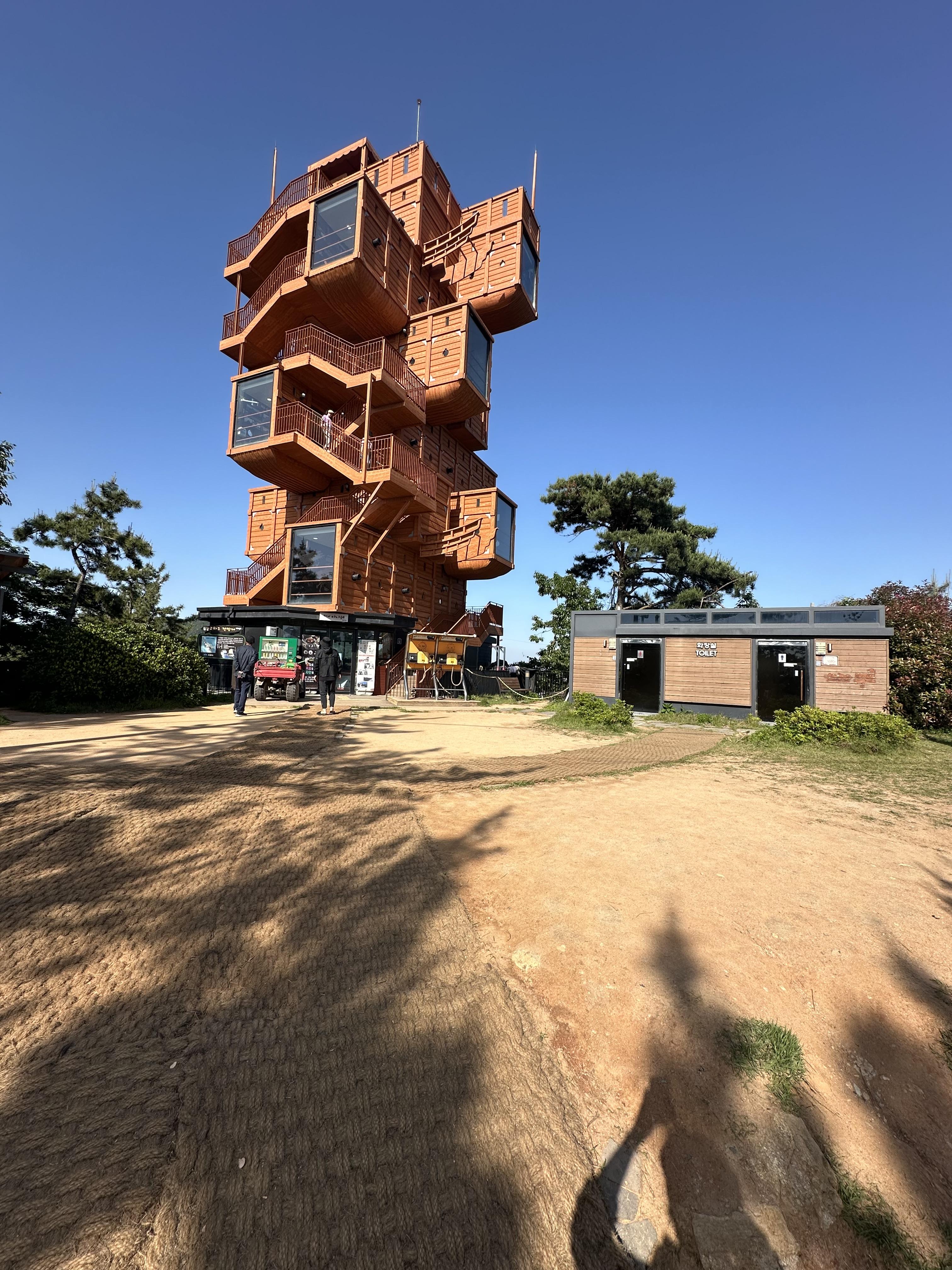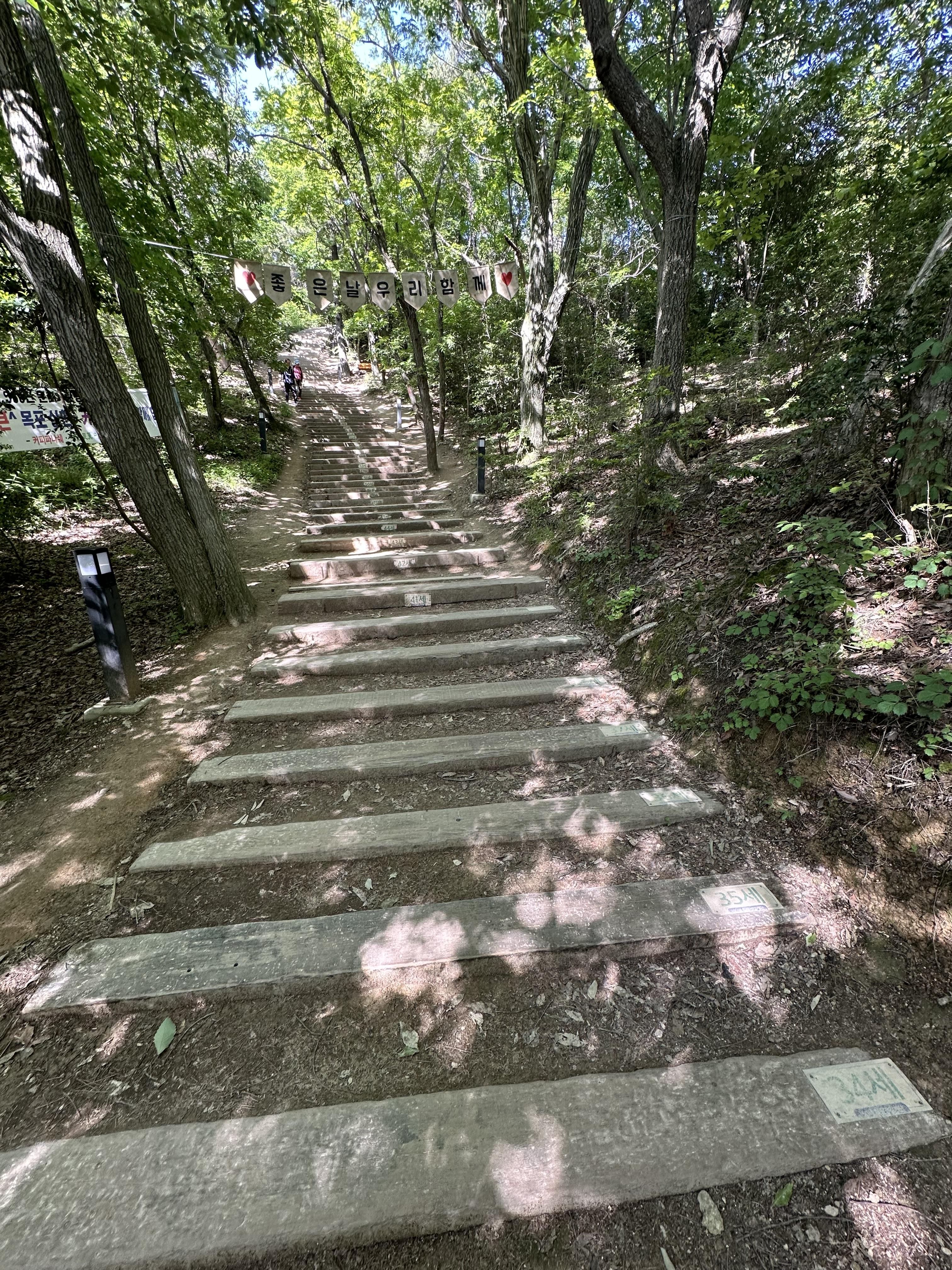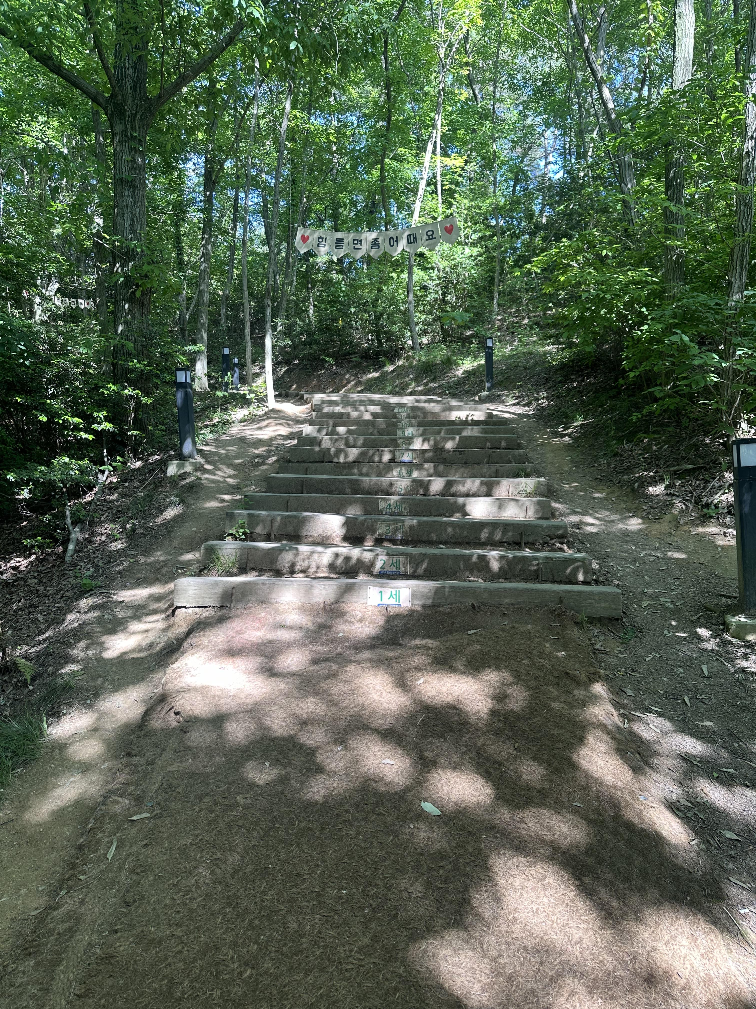 이름은 150세 힐링건강계단이라는 것입니다. 1세부터 150세까지 총 150개 계단을 설치했습니다. 정말 창의적인 아이디어 인 것 같습니다. 일반적인 흙을 밟고 올라가는 산책로는 아무래도 평평한 길이 아니기 때문에 미끄러질 수 있지만 계단이 있다면 좀 더 안정적으로 올라 갈 수 있는 것이 특징입니다. 계단마다 나이가 적혀있어서 올라가는데 정말 지루하지 않았습니다. 그렇게 흥미로운 150세 힐링 건강 계단을 오르면 짧은 등산로가 끝나고 제가 타고 왔던 목포해상케이블카의 탑이 보이게 됩니다.
