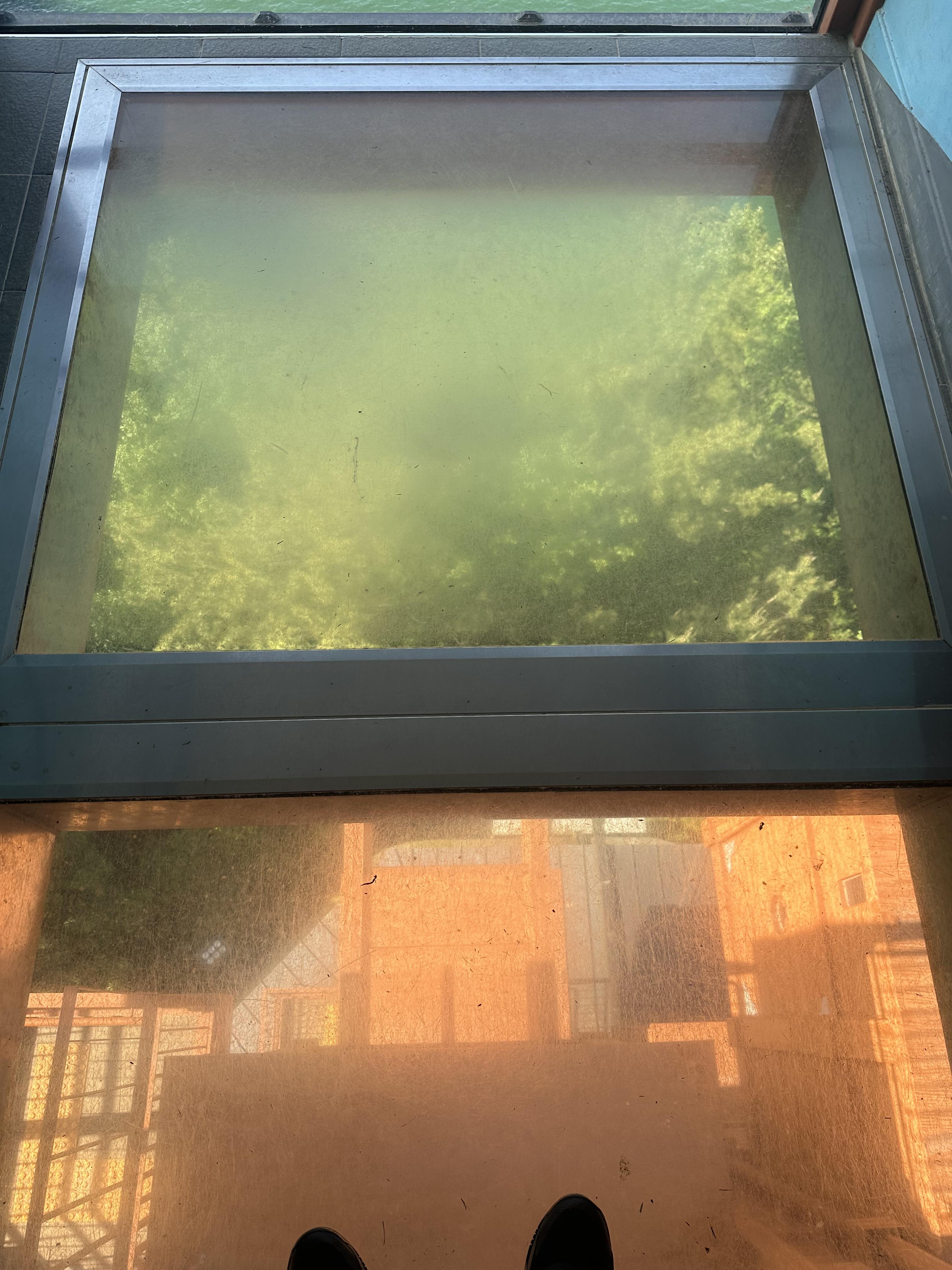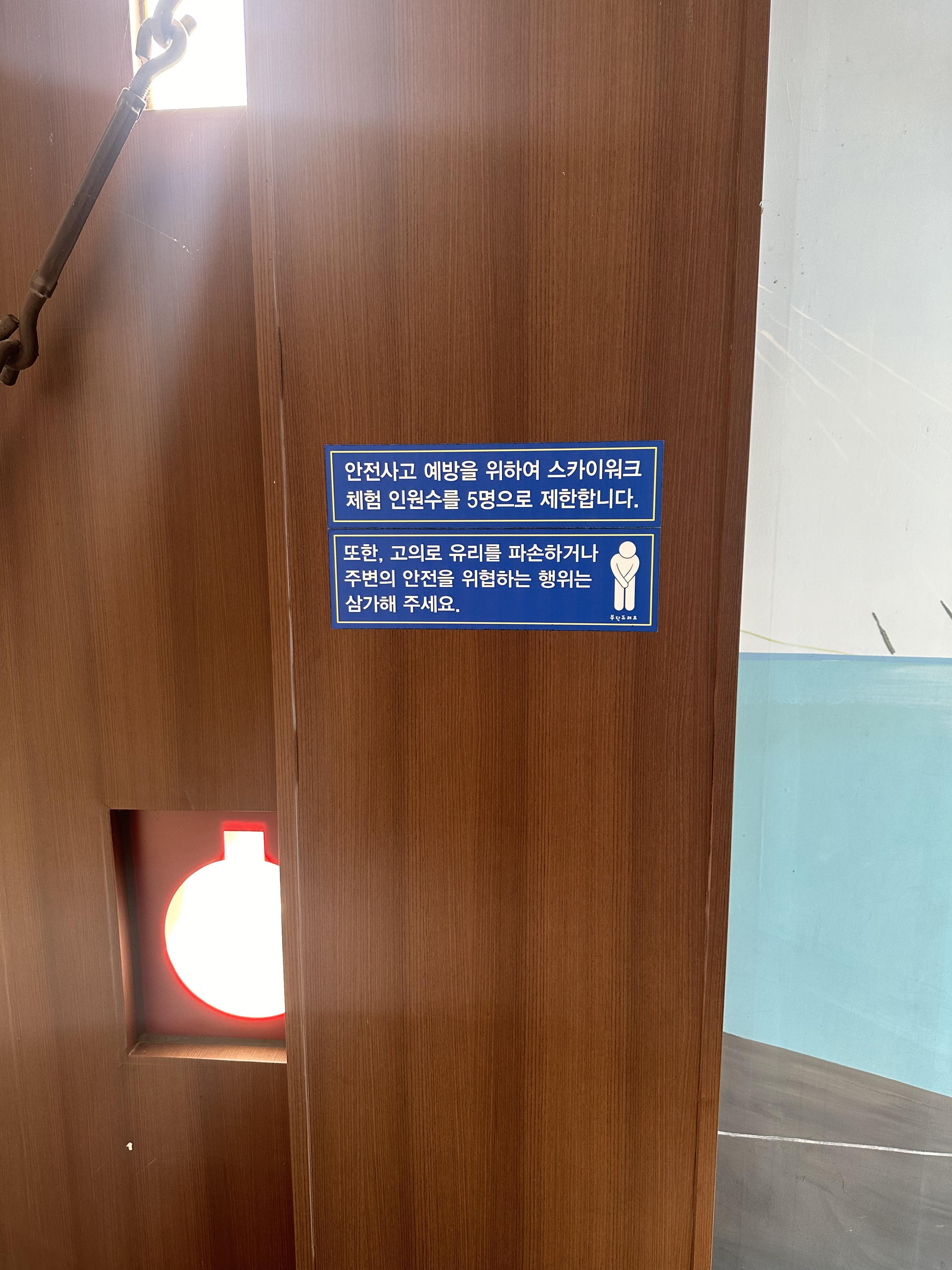고하도 전망대 5층 전맘ㅇ대로 기억하니다. 가장 높은 실내 전망대가 유일하게 유리로 만들어진 스카이워크 형태입니다. 바다가 보이는 것은 아니고 아무래도 고하도 전망대가 산이다보니 산의 숲이 스카이워크를 통해서 보이고 있었습니다. 판옥선 형태로 쌓아 올린 전망대 이다보니 전망대의 일부도 스카이워크를 통해 보여지고 있었습니다.