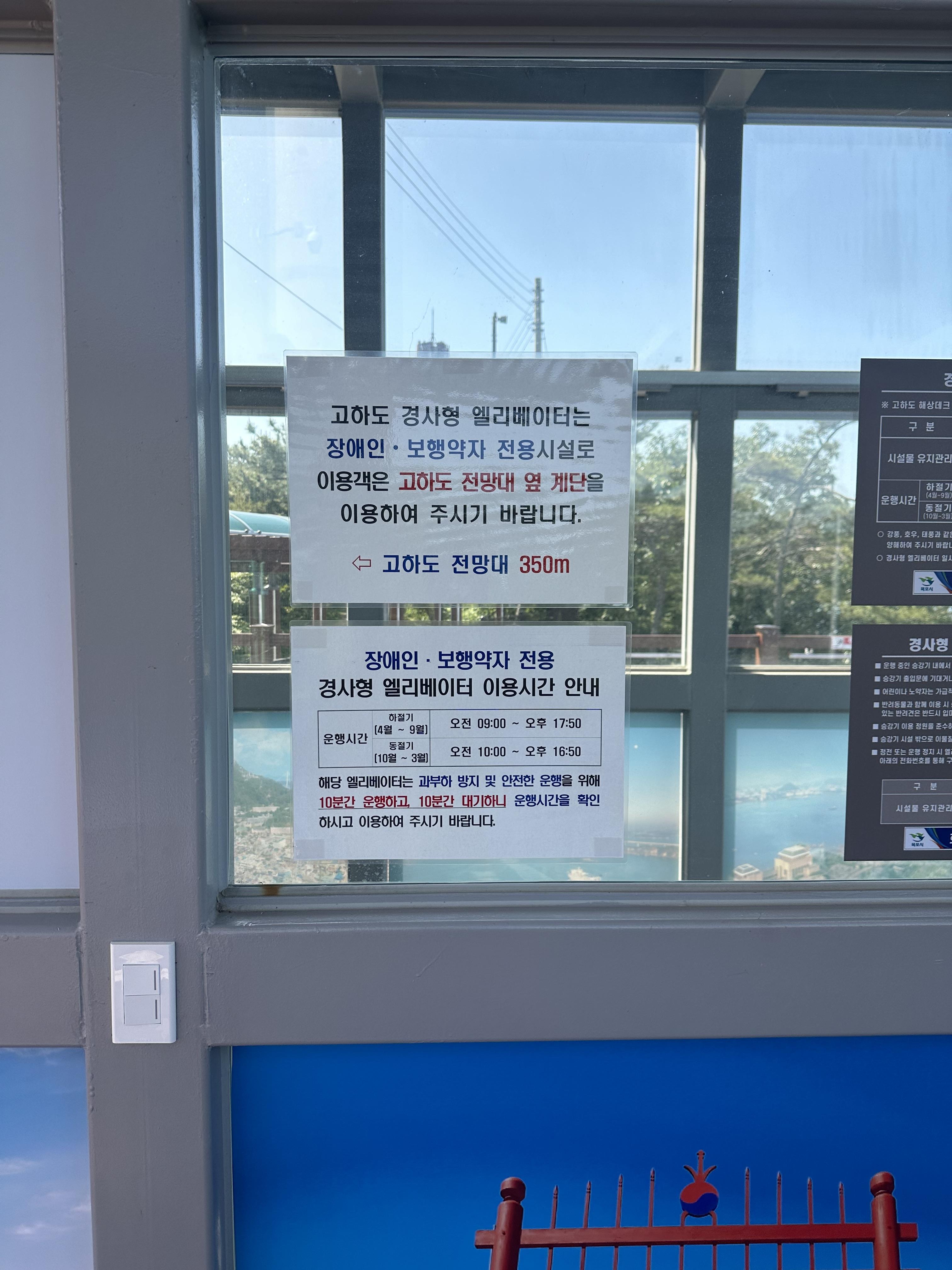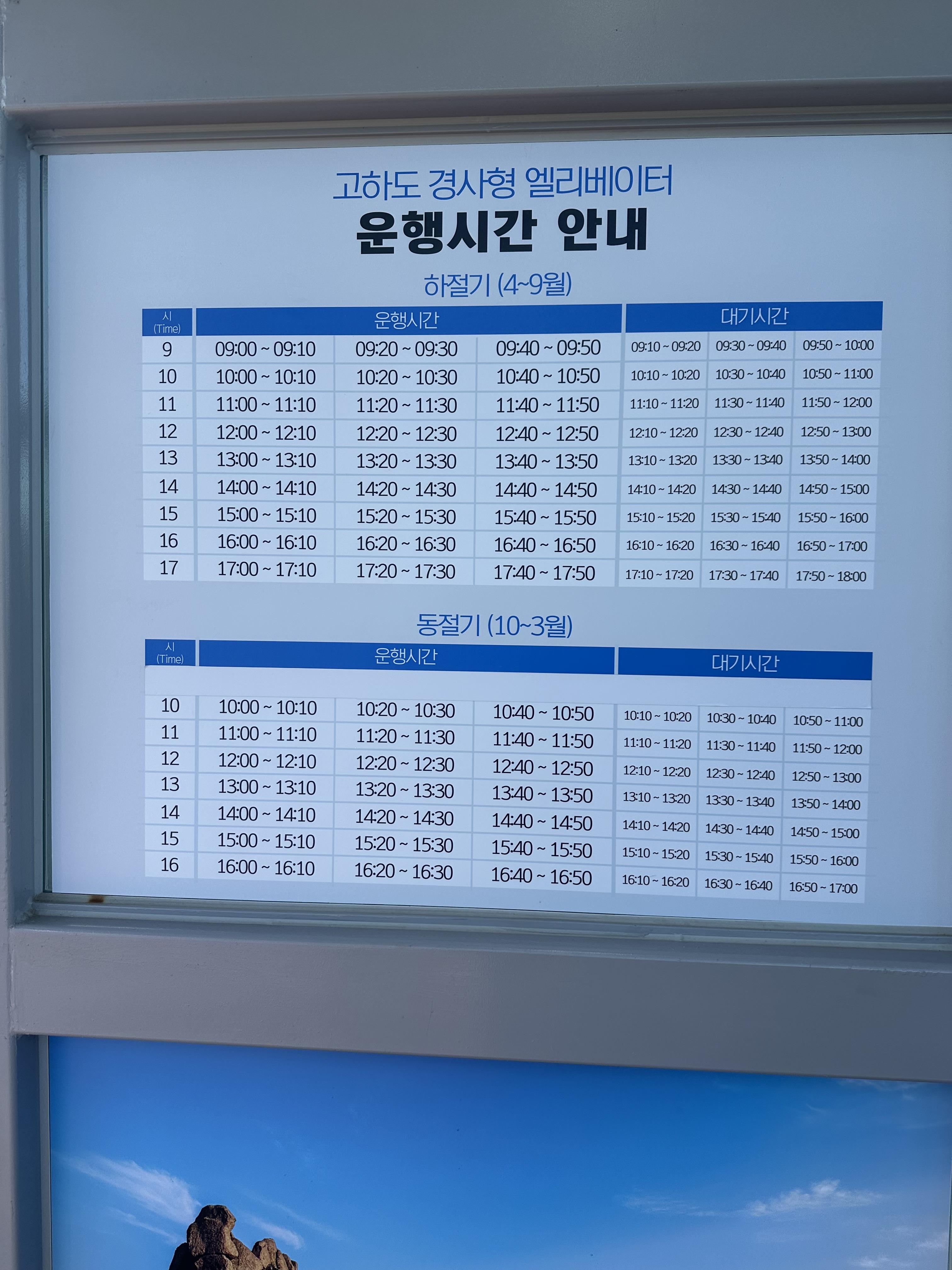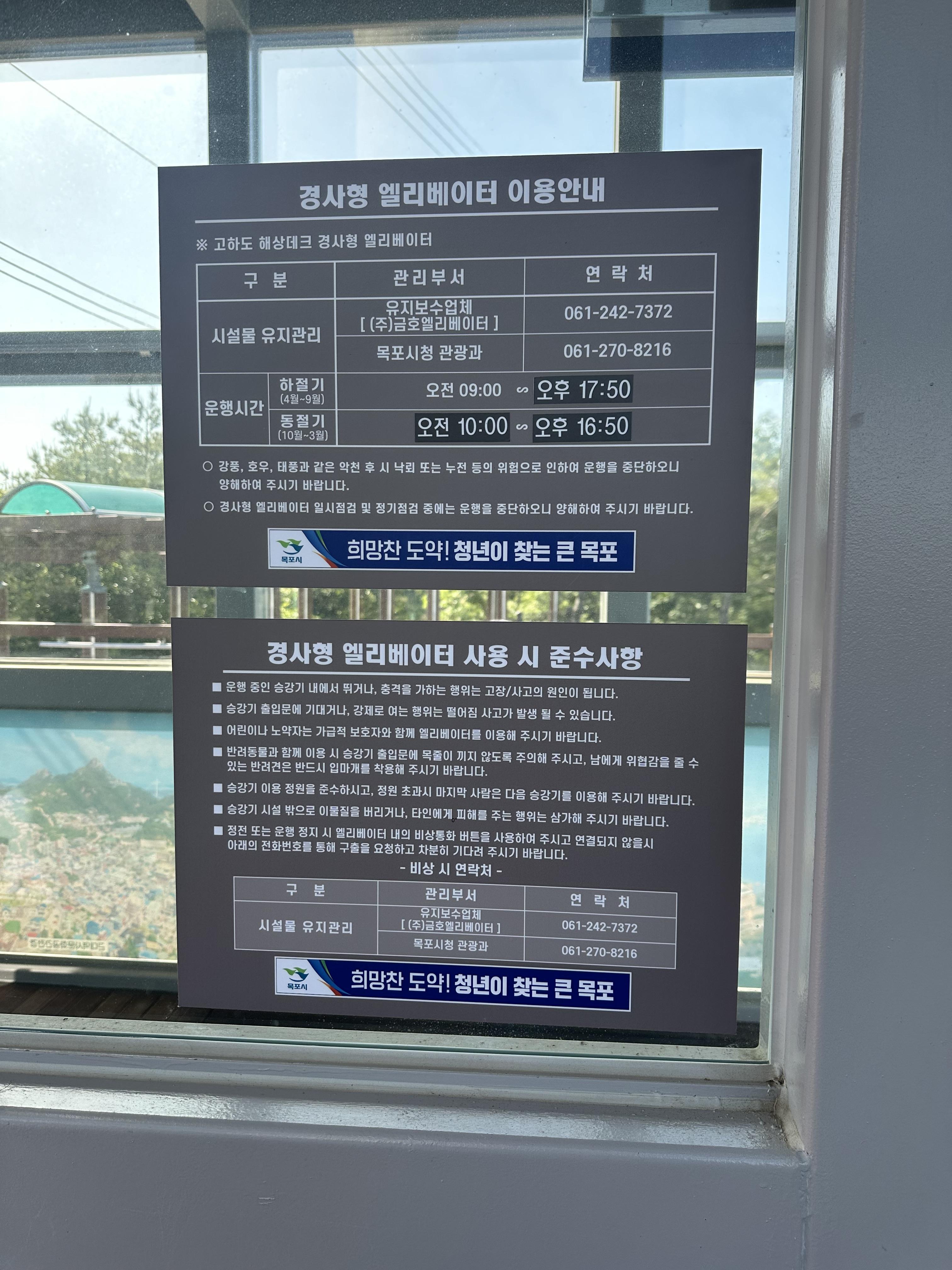 고하도 경사형 엘레베이터에 탑승하면 넓은 다도해 바다뷰가 보이는 전망을 가지고 있습니다. 따뜻한 5월의 날씨라 그런지 목포 고하도에서 바라보는 다도해 바다빛이 정말 이쁩니다. 창문에서 보이는 바다는 사진이 아니라 그림처럼 정말 아름답습니다. 수직이 아니기 때문에 경사형으로 수평으로 내려가기 때문에 내려갈수록 바다가 점점 가까워 보이고 있습니다. 경사형 엘레베이터는 과부하 방지 및 안전한 운행을 위해 10분간 운행하고 10분간 대기하기 때문에 계속해서는 운영하지 않는다고 해요. 그래서 경사형 엘레베이터 타는 입구에는 시간표가 따로 있으며 동절기와 하절기에 따라 다르게 운영하고 있습니다.
