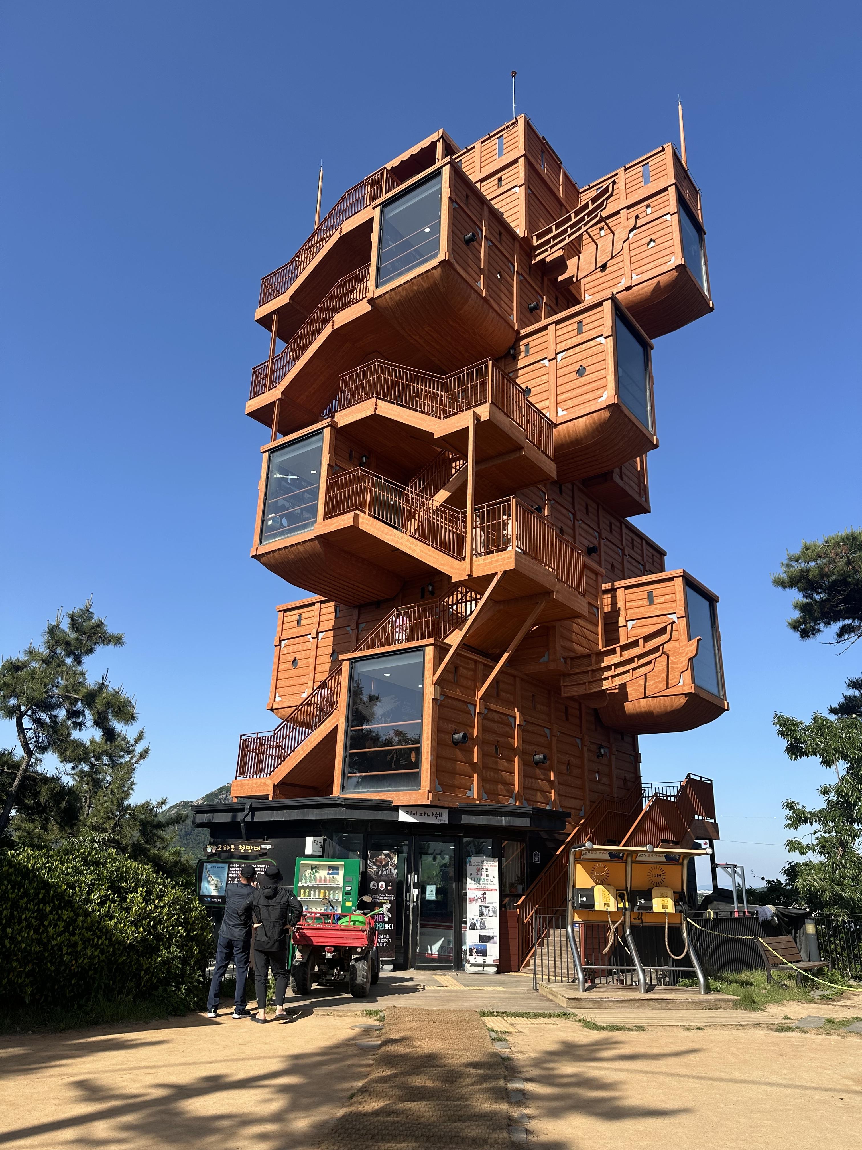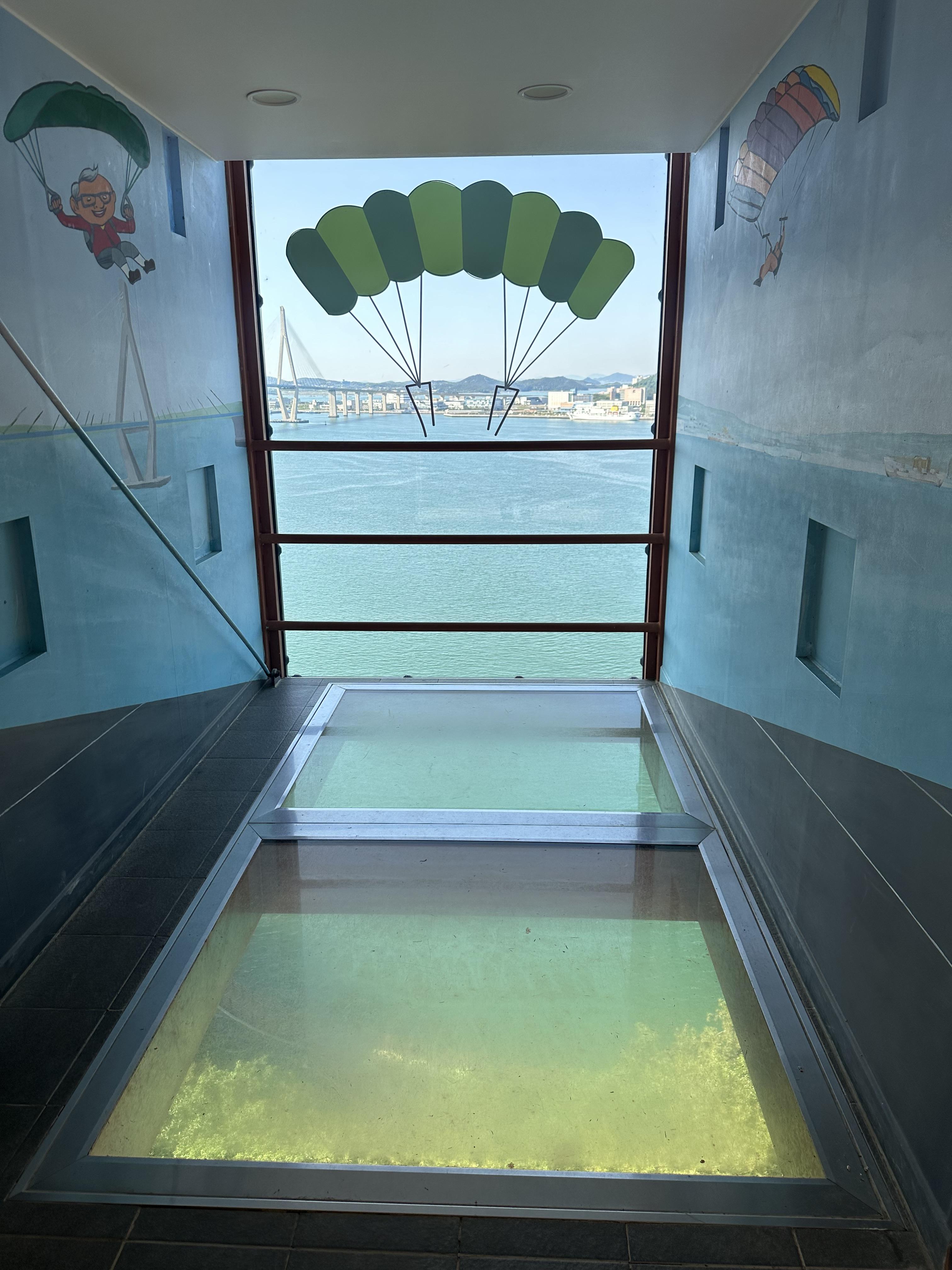2층부터 5층부터는 전망대 겸 목포의역사와 목포의 관광지를 소개하는 공간인데요. 각 층마다 큰 창문이 있어서 고하도 주변을 볼 수도 있었습니다. 고하도 전망대는 판옥선 모형을 가로세로로 번갈아 가면서 위로 올린 전망대로 층마다 고하도를 동사남북으로 살펴볼 수 있습니다. 실내 전망대 바닥은 층마다 다른 형태이고 아마 제 기억상에 가장 위층에는 일반 바닥이 아닌 스카이워크처럼 유리 형태로 되어있었습니다.