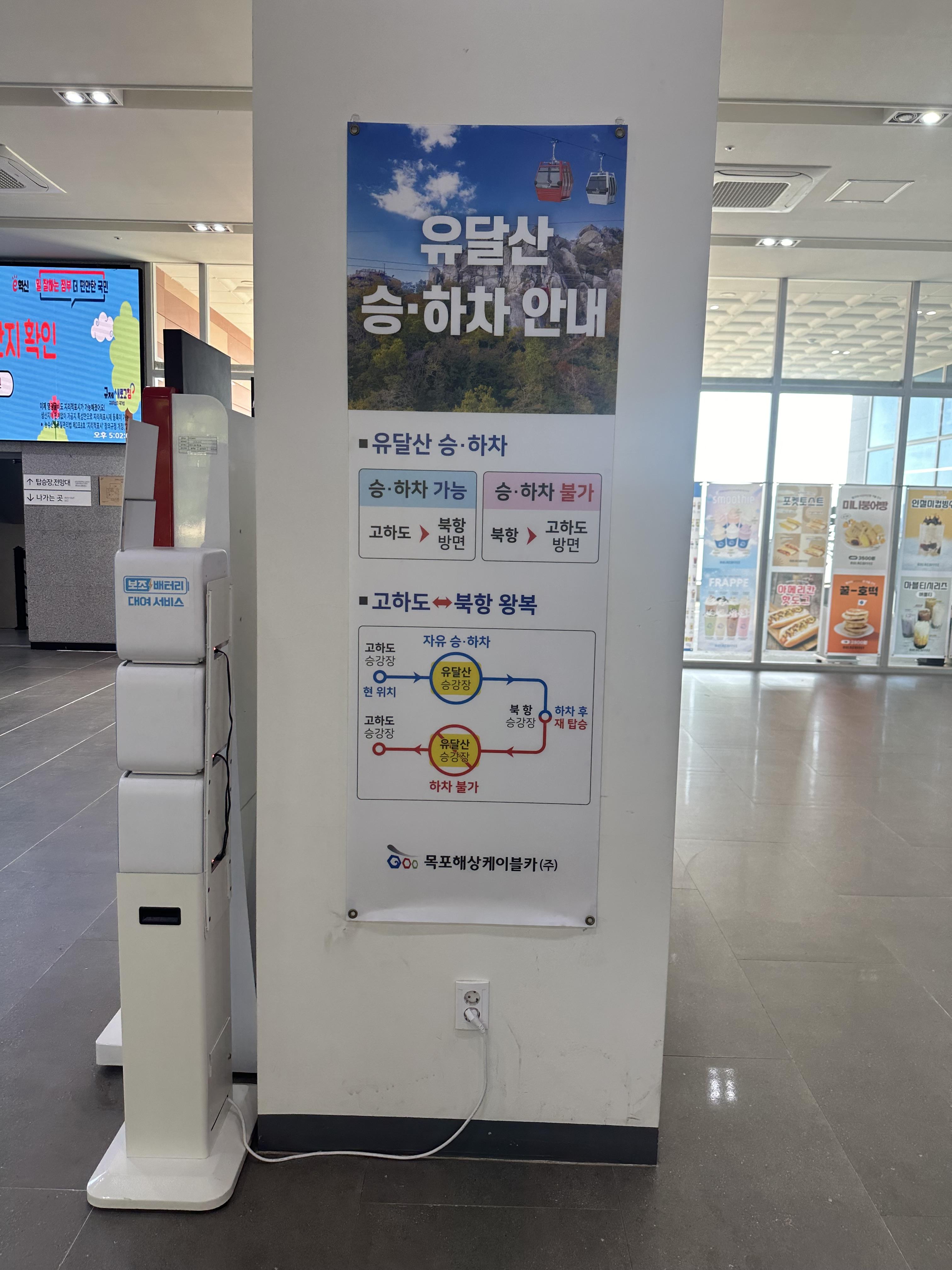 이제 천천히 케이블카를 타러 건물 안으로 진입합니다. 목포해상 케이블카는 국내 유일 케이블 승강장이 3개로 중간 경유지가 가능한 케이블카입니다. 대부분은 목포해상케이블카 북항 승강장에서 타겠지만 고하도 인근에서 놀러왔는데 목포해상케이블카를 타고 싶다면 굳이 북항 승강장까지 가지 않고도 고하도 스테이션에서 이용할 수 있습니다. 고하도 스테이션에 출발지 출발할 때는 북항과는 다르게 유달산은 북항에서 갈 때만 승하차가 가능합니다.