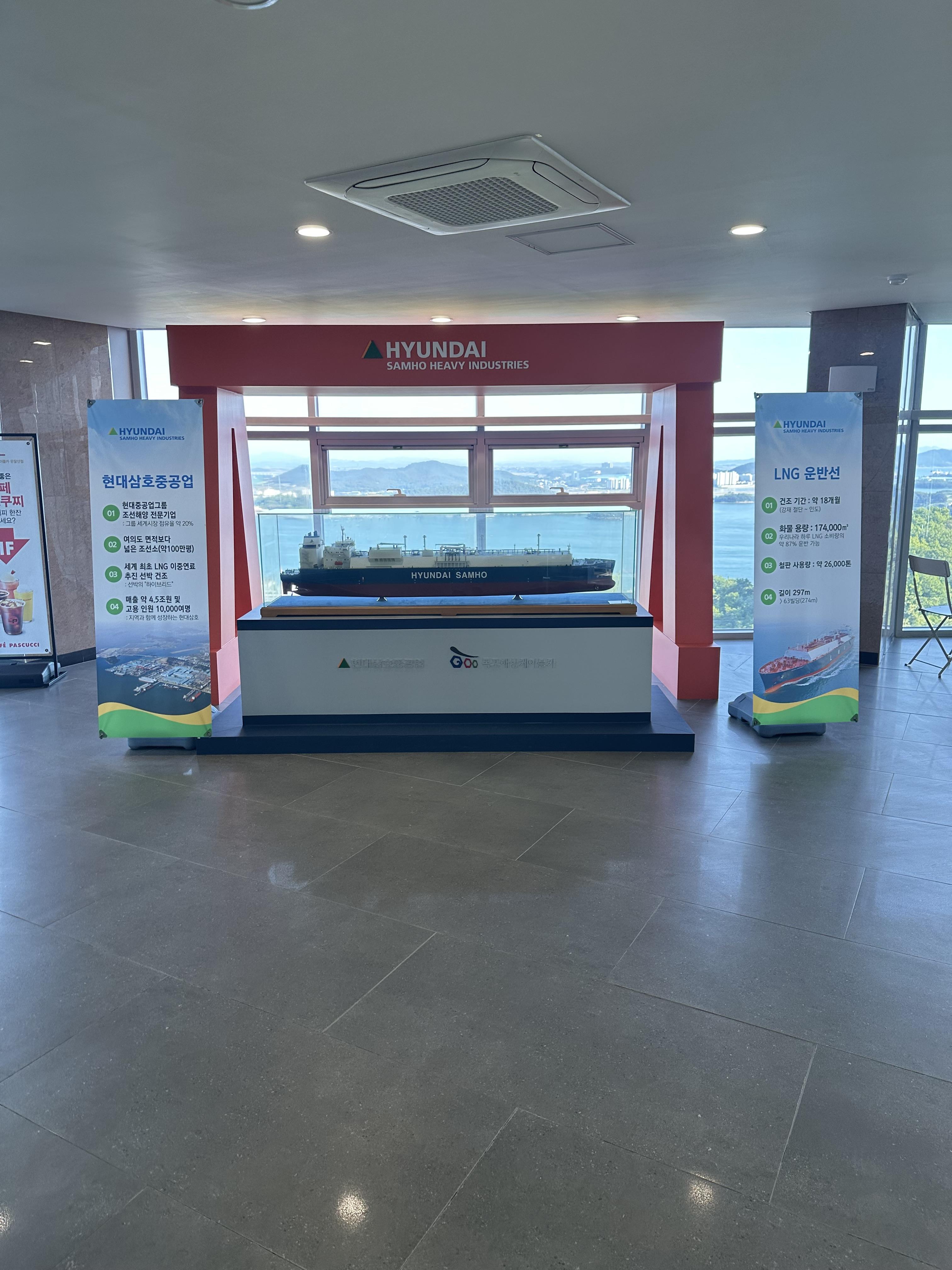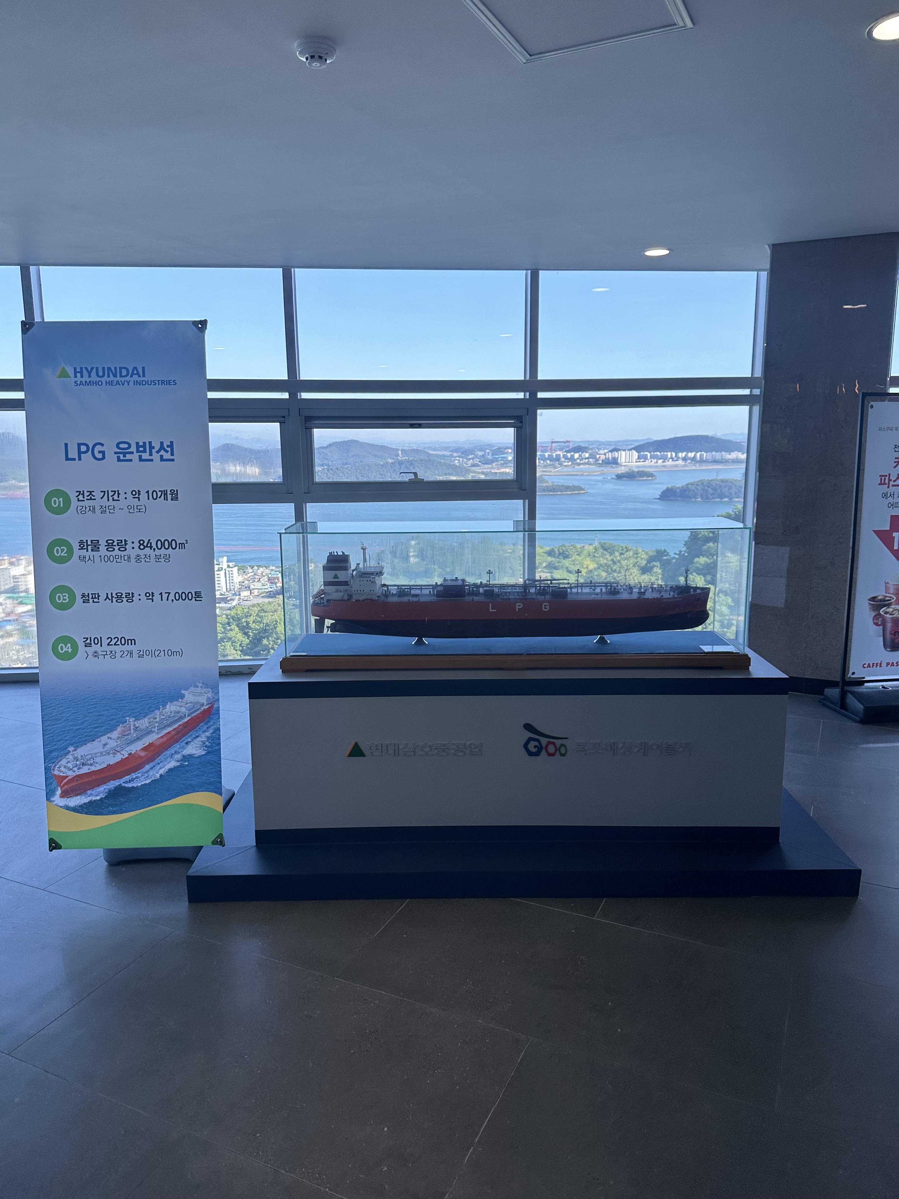 실제로 신기한건 보통 섬 여행은 당일치기에 불가능한데요. 고하도의 경우에도 목포해상케이블카가 없었다면 버스와 같은 대중교통을 타고 한참 갔어야 할것입니다. 그러나 케이블카라는 편리한 수단으로 목포 당일치기가 가능했습니다. 물론 목포 당일치가 더 가능한 이유는 KTX라는 최고속도 300키로 이상의 고속열차가 있기 때문입니다. 유달산 스테이션 건물 1층으로 내려가면 유달산 등산로 방향을 볼 수 있으며 유달산 등산로에는 1등바위, 마당바위, 유달산을 통한 둘레길이 있습니다. 그 외에 유달산 스테이션 건물에도 고하도 스테이션과 북항 스테이션처럼 카페와 편의시설 등이 있습니다. 다만 고하도나 북항만큼 사람이 북적거리지는 않고 상가가 활성화되지는 않았습니다. 주말이 아닌 평일이라 그런지 더 그럴 수도 있습니다. 그 외에 건물에는 다양한 전시시설이 있습니다. 목포는 항구의 도시라는 말처럼 현대상호중공업에서 LPG 운반선이라는 대규모 선박 모형 전시를 볼 수 있었습니다.