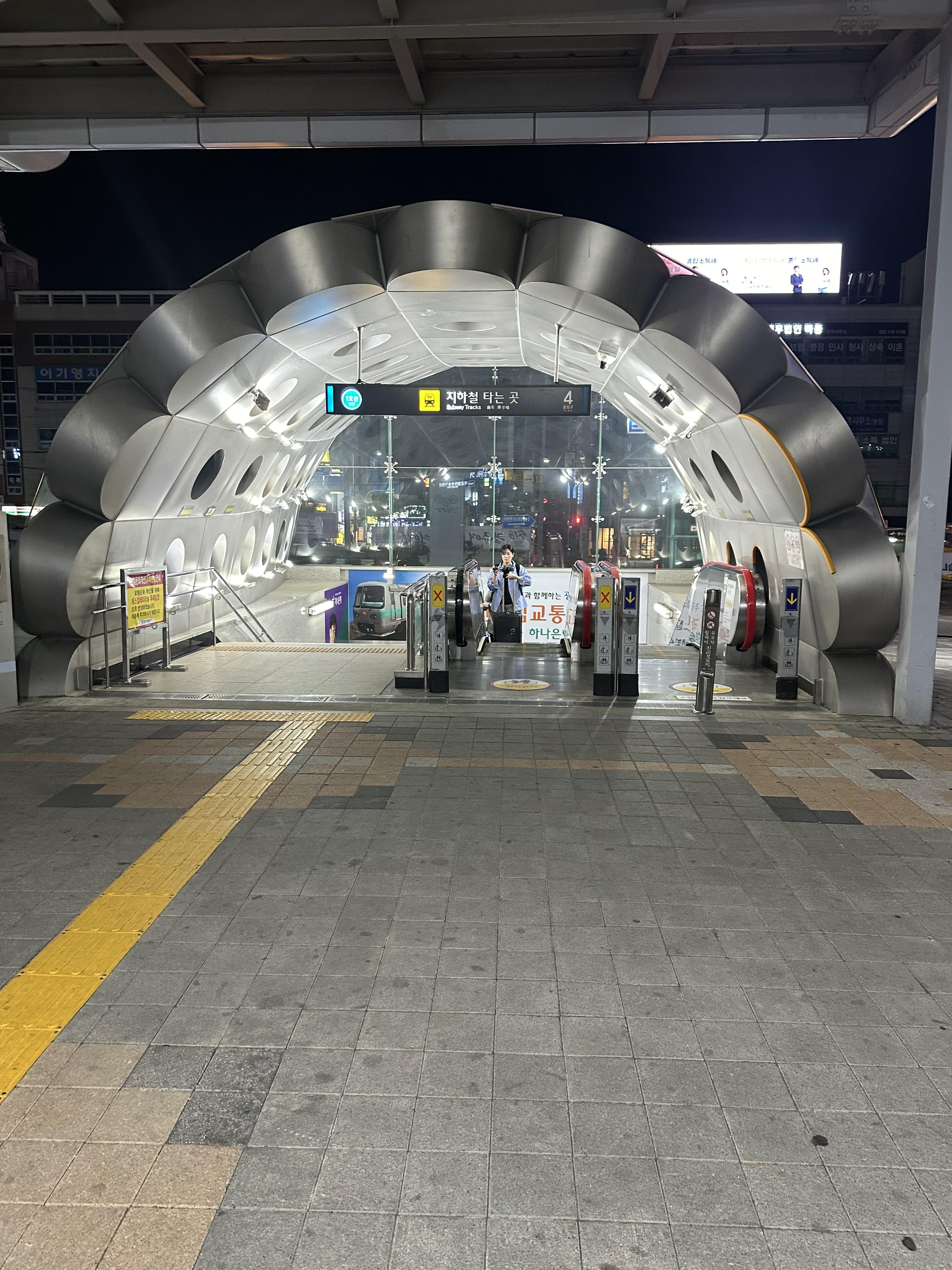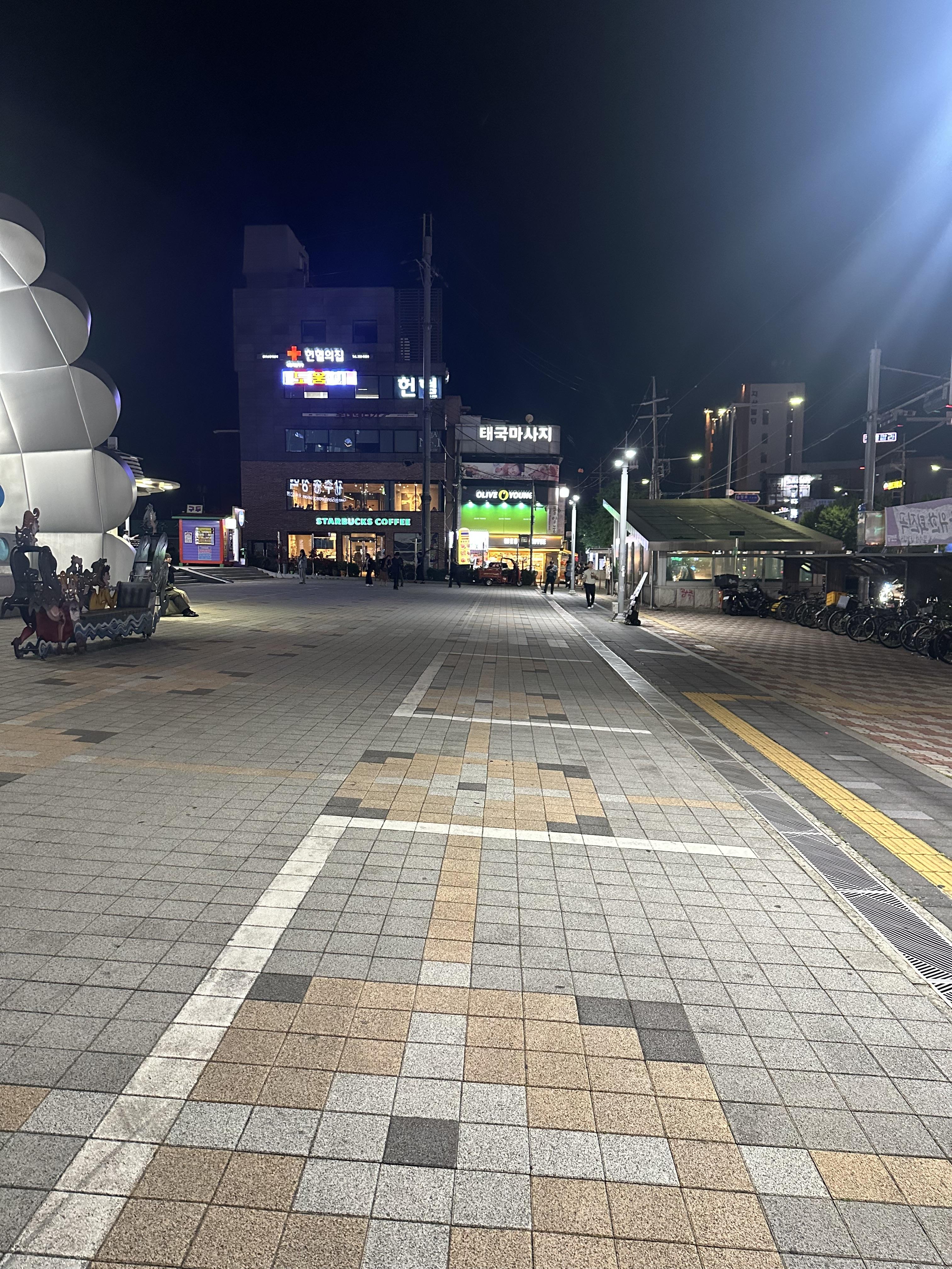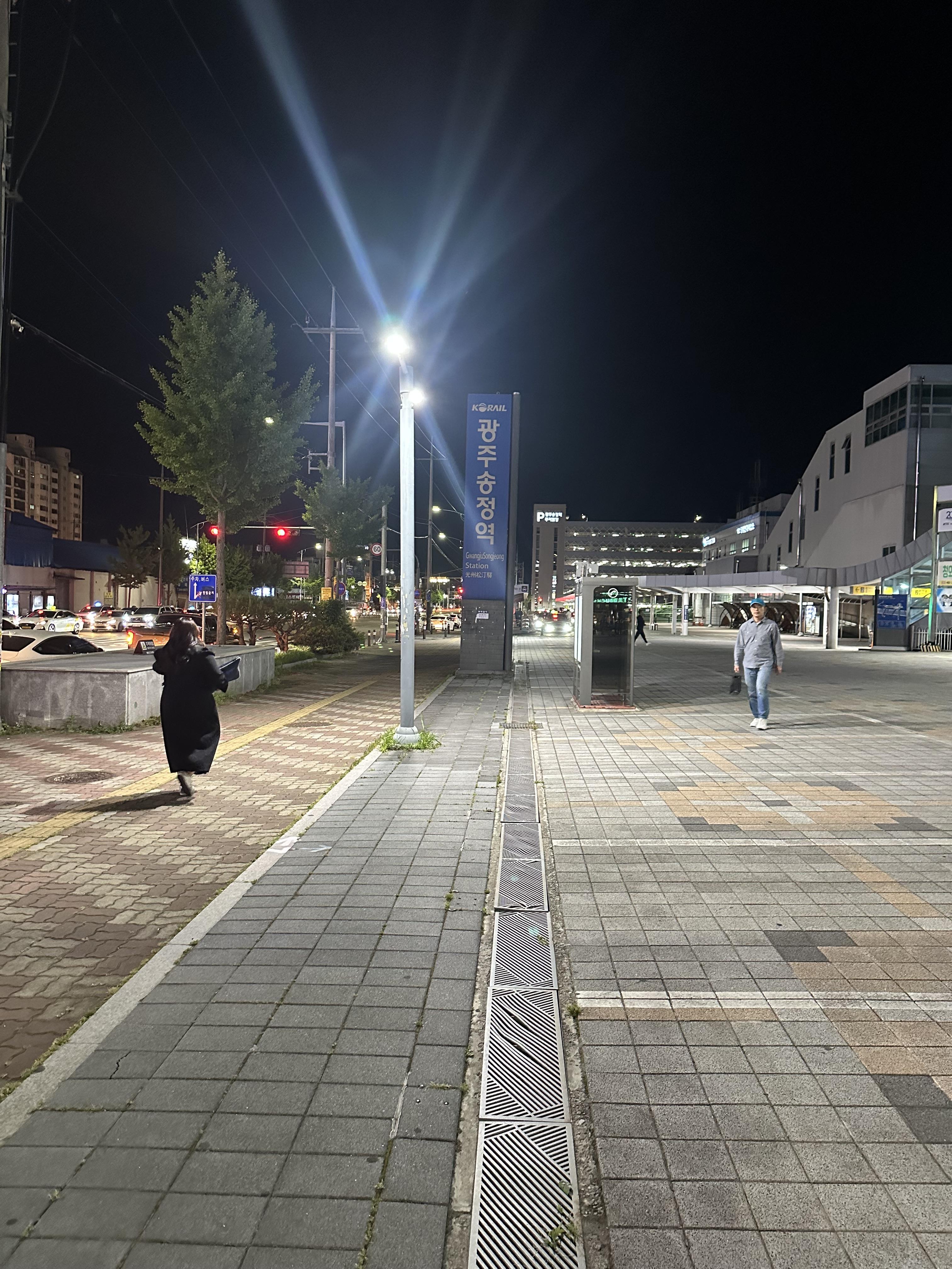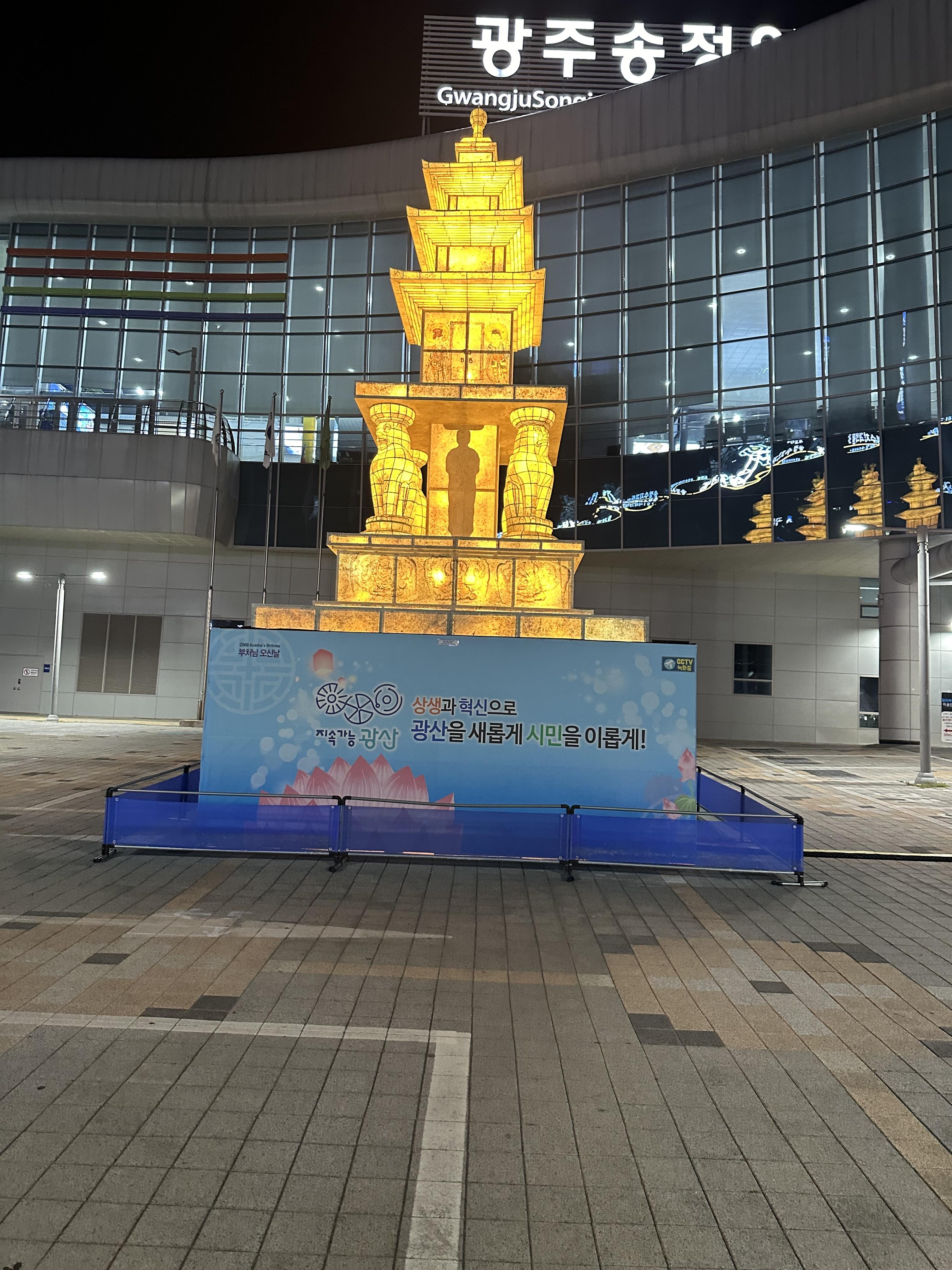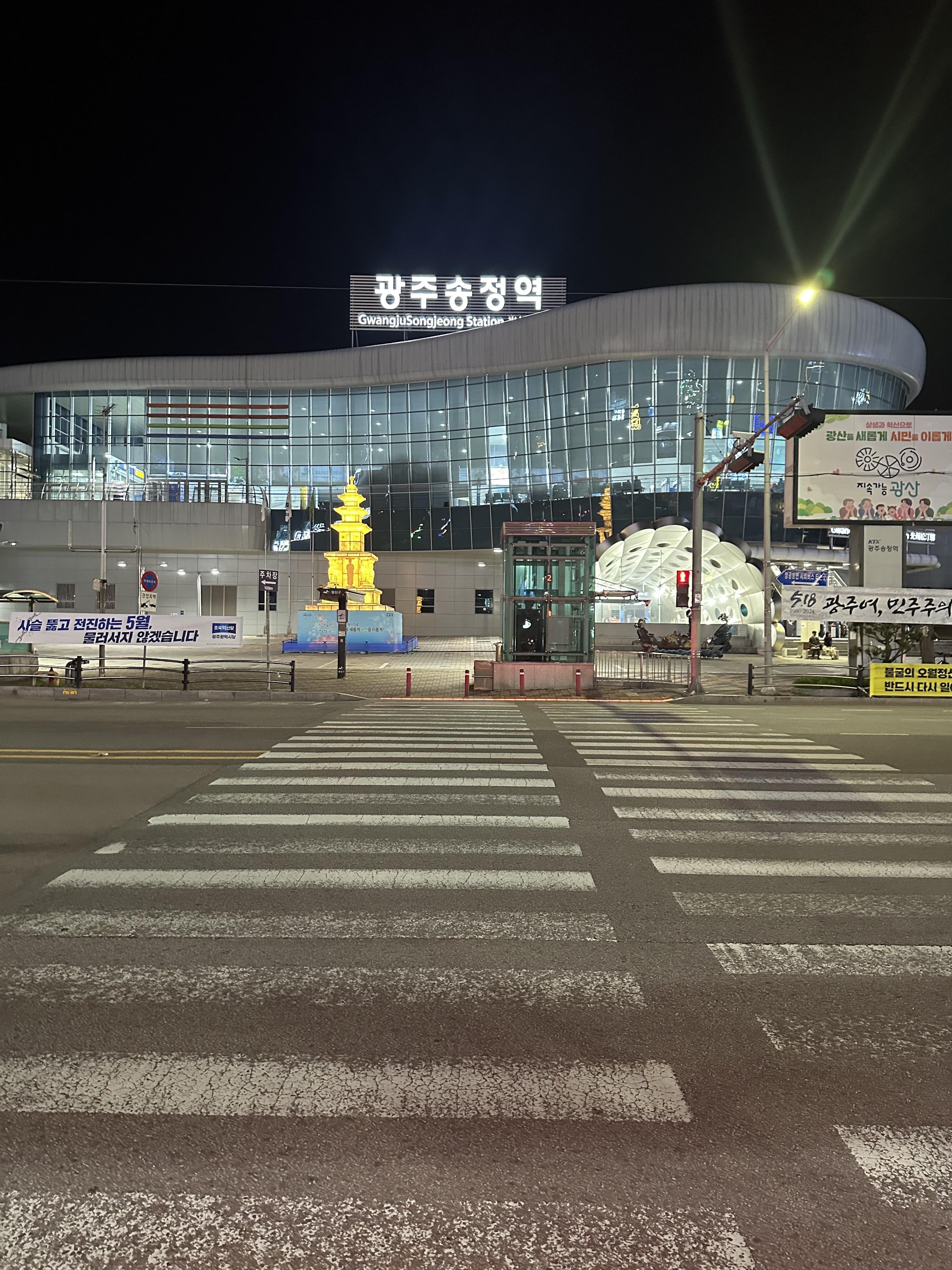 그리고 광주송정에 도착해서 몇년만에 광주송정역 앞에 송정역시장 30년전통 영명국밥집에서 당일치기여행의 마무리로 국밥 한그릇을 먹었습니다. 영명국밥에서 국밥을 먹고 광주송정에서 서울까지 가는 KTX 열차를 타기 까지 시간이 좀 남아 광주송정시장 주변을 걸어다니며 열차 시간에 맞춰서 광주 송정역으로 이동했습니다. 광주송정역 앞에는 경주에서 볼 수 있는 석탑 조형물이 야간 조명을 통해 환하게 비춰지고 있었습니다. 광주송정역도 KTX가 다니는 역이라서 그런지 주위에 스타벅스 카페부터 해서 역세권이 형성되었는 것을 볼 수 있습니다. 경부선의 경우 대전, 대구, 부산역은 서울역이나 용산처럼 역사가 큰 것이 느껴지지만 호남선과 전라선 구간에 있는 순천, 여수, 광주송정, 목포는 KTX 역사중에 작은 모습을 보이고 있습니다.