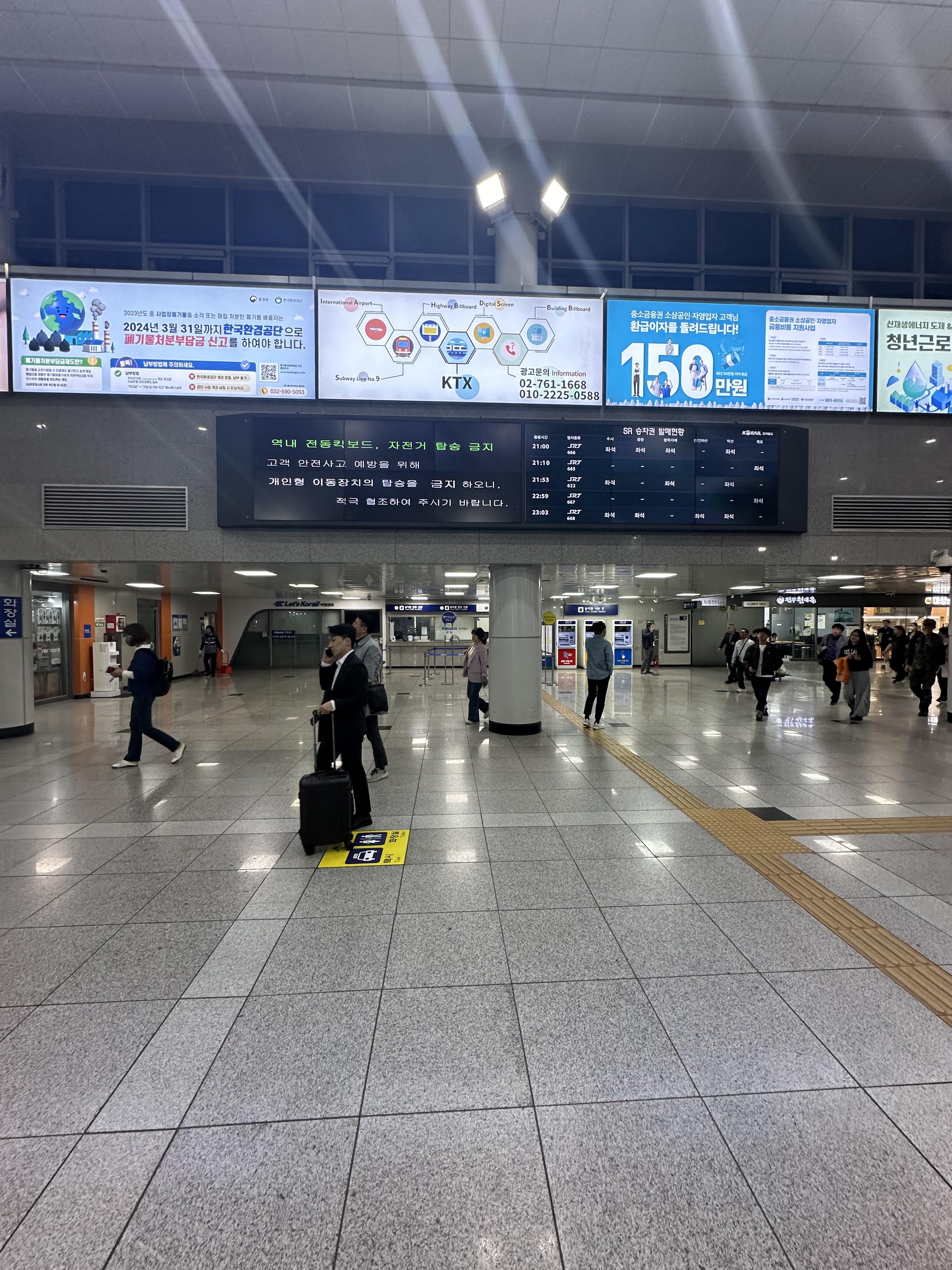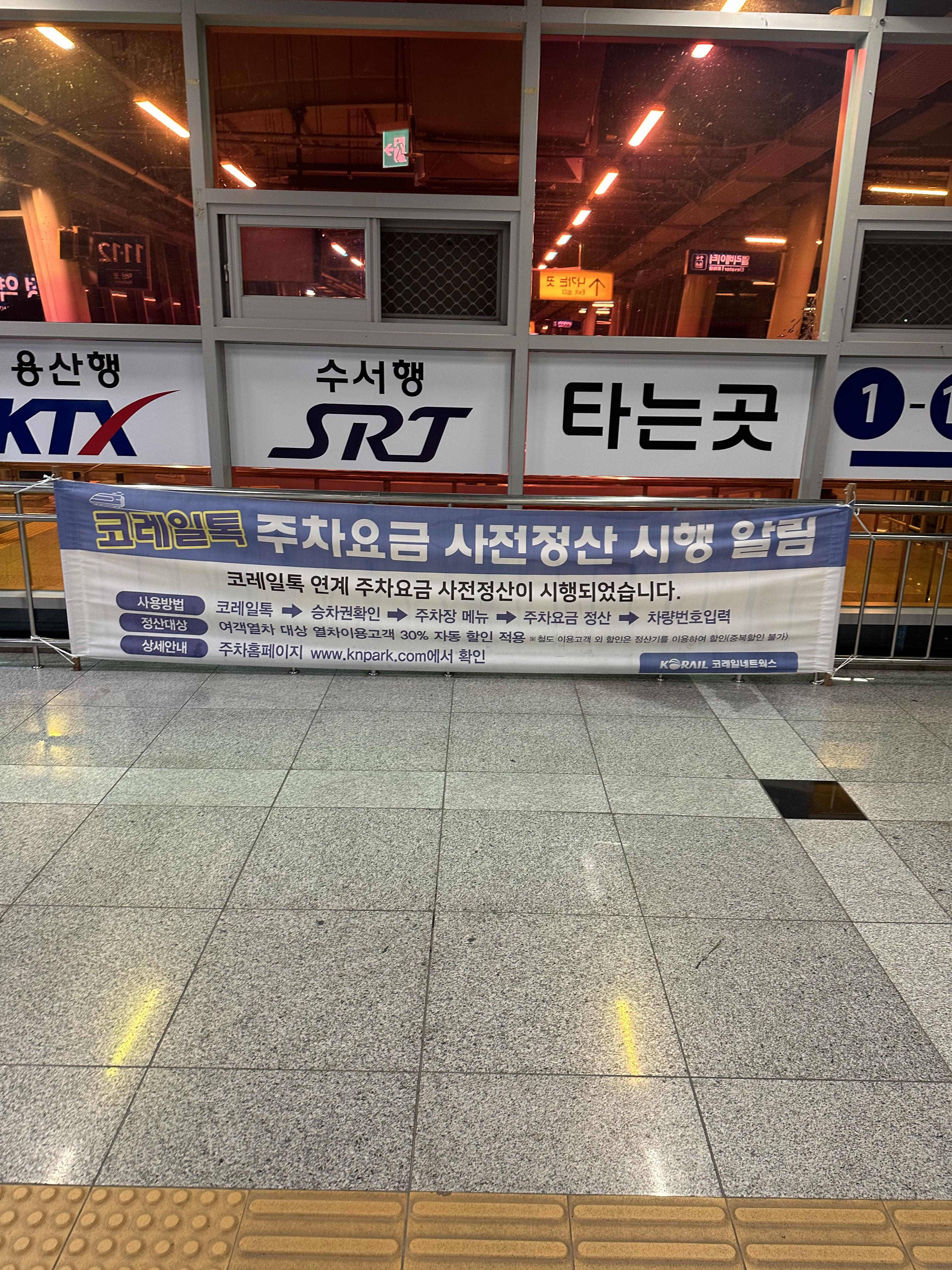 광주 송정역 도보 5분거리에 위치한 1913송정역시장에서 영명국밥을 먹고 송정역시장을 걷고 광주송정역 대합실로 올라와서 오랜 기다림없이 기다리니 역명판에 용산으로 가는 20시 50분 KTX 열차 탑승을 알리는 알림이 떴습니다. 저는 대합실에서 천천히 승강장으로 이동했습니다. 광주송정역 역시 서울 강남 수서로 가는 SRT가 정차하고 있습니다. SRT가 2016년에 국내에 도입이 되었는데요. 도입 당시에는 호남선은 광주송정과 경부선 구간만 다녔는데요. 최근 몇개월전에 SRT도 호남선 목포역과 전라선 여수엑스포역, 경전선,포항까지 확대되어 운행되고 있습니다. 그러나 코로나 여파, 러시아 우크라이나 전쟁 등으로 인해 열차 출고가 늦어지는 문제로 인해 노선 확대된 SRT 예매가 하늘의 별따기입니다. 보통은 주말과 성수기를 제외하면 예매가 쉬운데 열차 출고 지연으로 노선 확대가 되다보니 발생한것 같습니다.