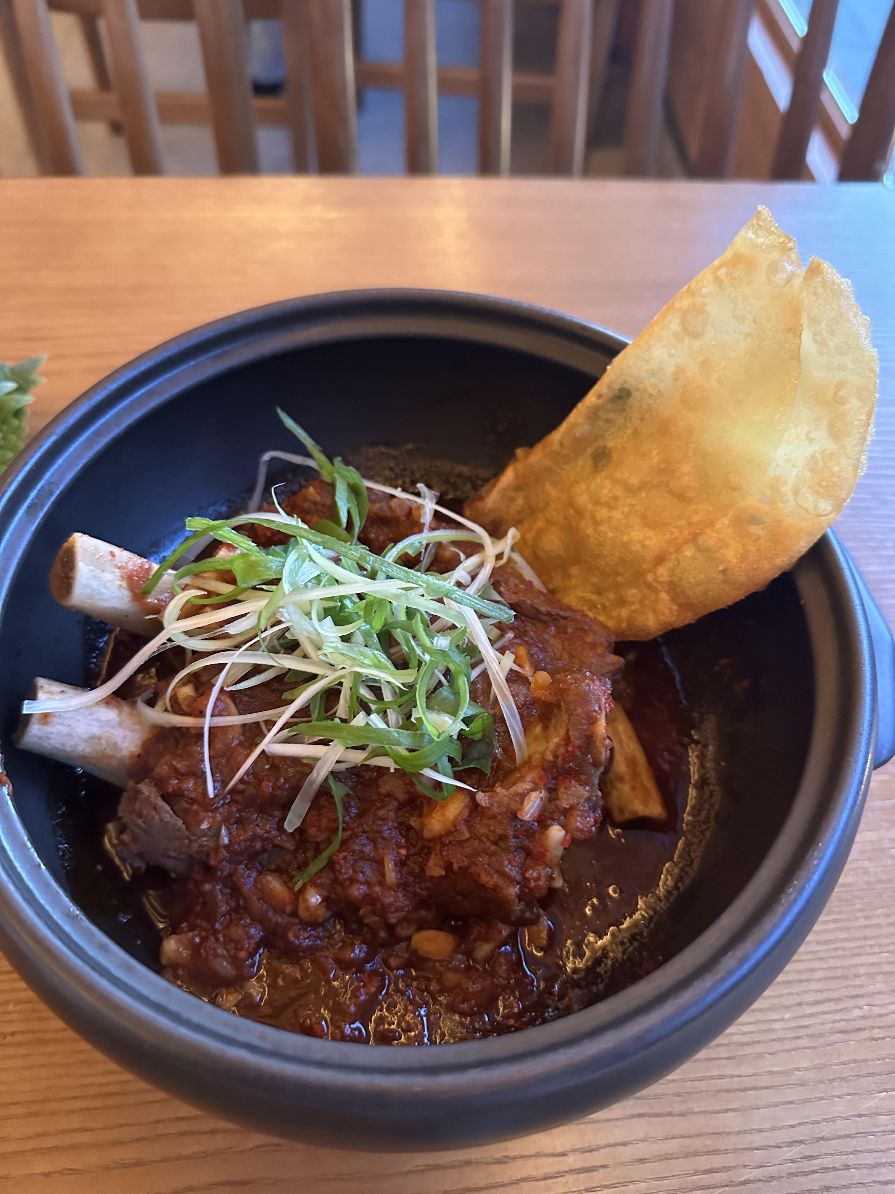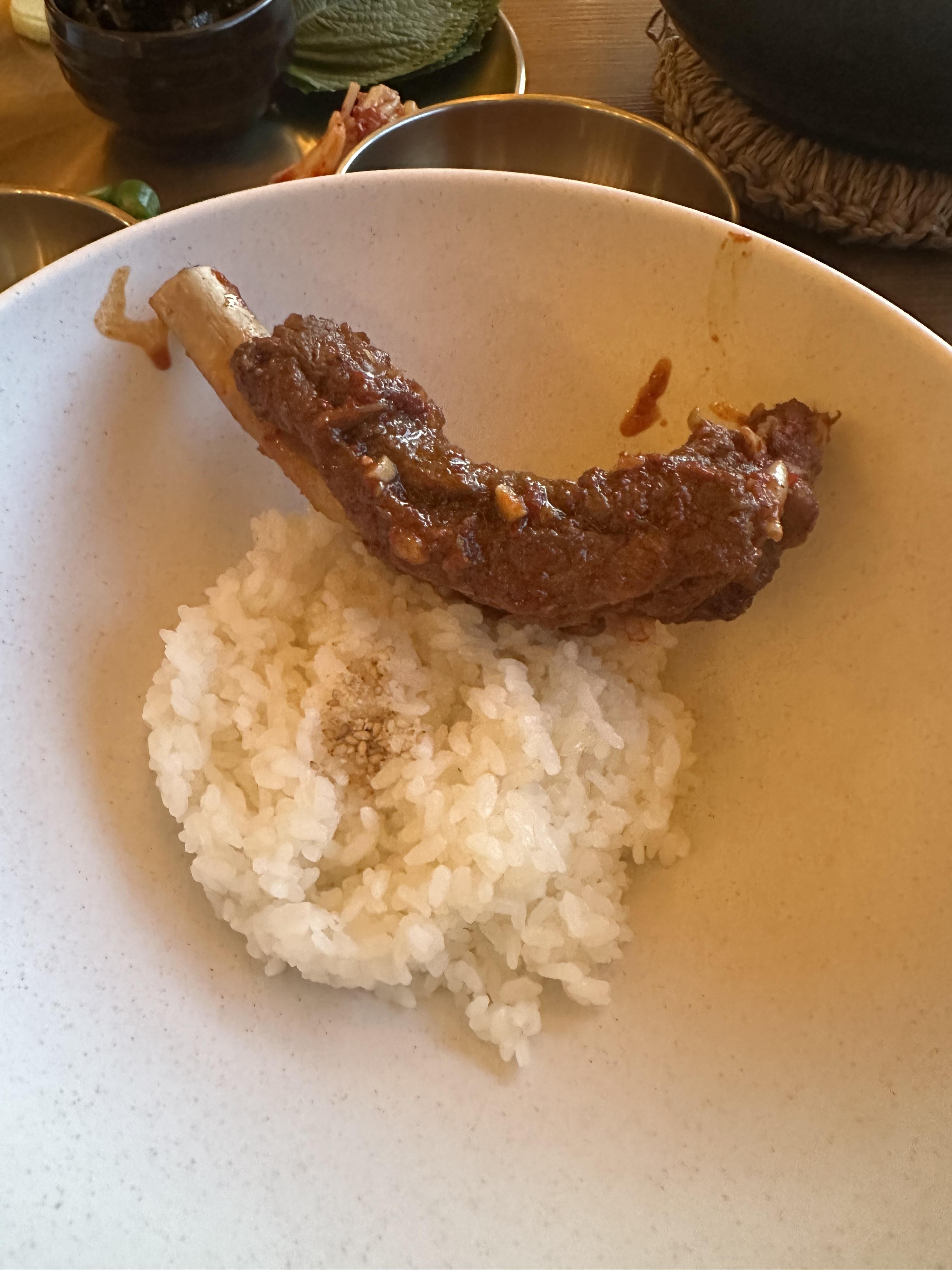 드디어 돼지갈비찜이 나왔습니다. 돼지 갈비찜에는 기본적으로 납작만두 2개가 함께 들어 있는데요. 돼지갈비찜 매운맛 선택한 경우 정말 매워요. 그런데 납작만두와 밥과 함께 먹으면 그나마 덜 맵긴한데요. 아무튼 맵습니다. 돼지갈비가 두개가 들어있어서 이거 왜 이렇게 양이 적은거야 라고 느낄 수 있는데요. 작아보이기는 하지만 막상 먹으면 배부를정도로 딱 1인분 크기였습니다.