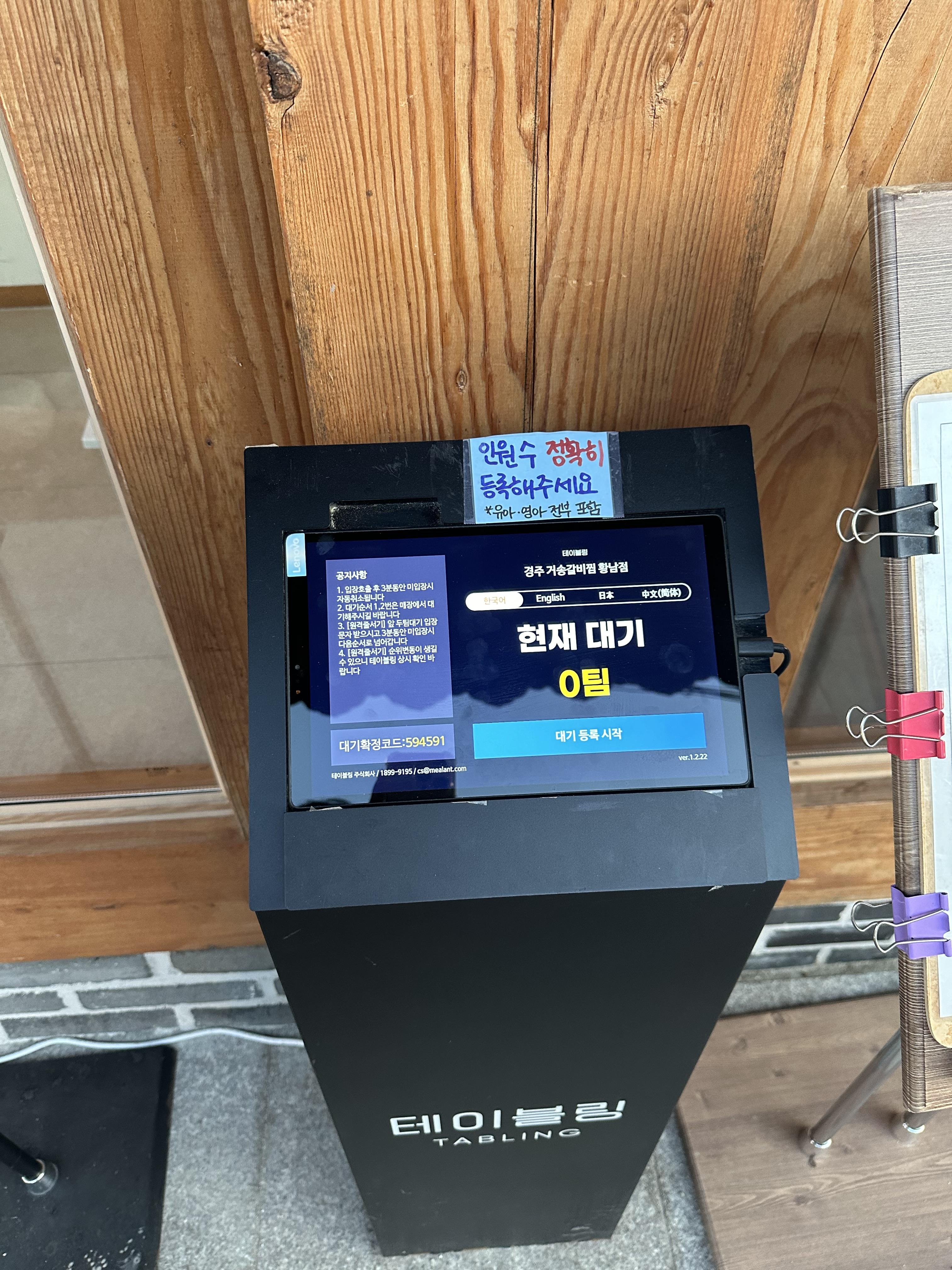 올해 2월 묵호 여행 갔을 때 기억이 납니다. 묵호라는 바다가 보이는 작은 논골담길 앞에는 거동탕수육이 있었습니다. 거동탕수육과 오늘 소개해드리는 거송갈비찜 뭔가 발음이 비슷한데요. 거동탕수육도 매장에 입장이 아닌 미리 키오스크를 이용해서 대기를 등록하고 입장 신호를 앱으로 보내는 방식이었는데요. 거송갈비찜도 마찬가지 방식이었습니다. 다행히 일요일 여행이라 그런지 대부분 관광객들은 다 집으로 돌아가서인지 대기인원 1명에 얼마 안있어서 바로 입장했습니다.