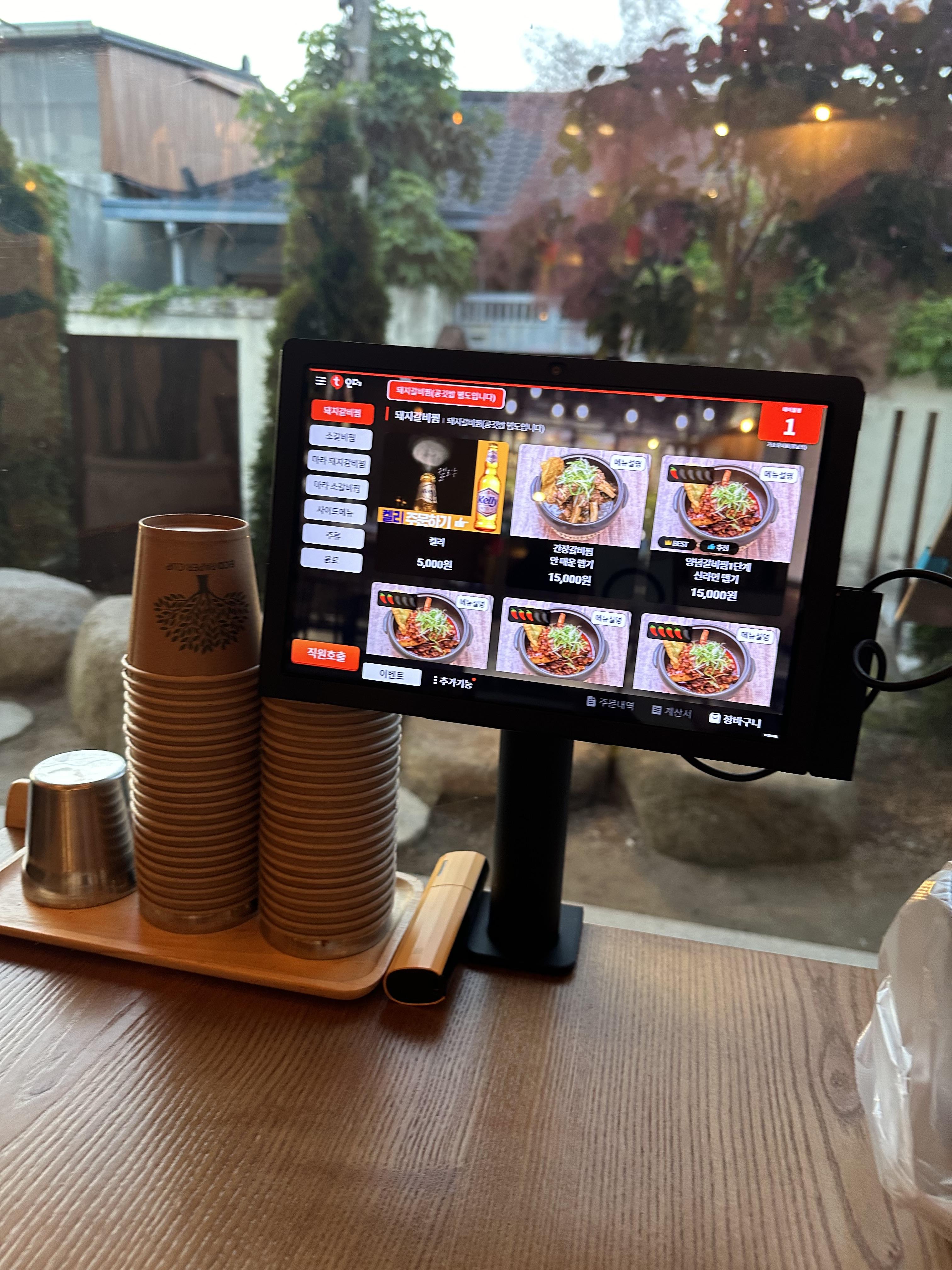 대기중이 팀이 없어서 곧바로 입장할 수 있고 혼자서 식사하는 저였지만 4인 식탁에 앉았습니다. 그리고 키오스크를 이용해서 돼지갈비찜과 공기밥도 함께 주문했습니다. 요즘은 식당이나 숙박업소나 환경개선을 위해서 종이컵 사용을 안한다고 하는데요.