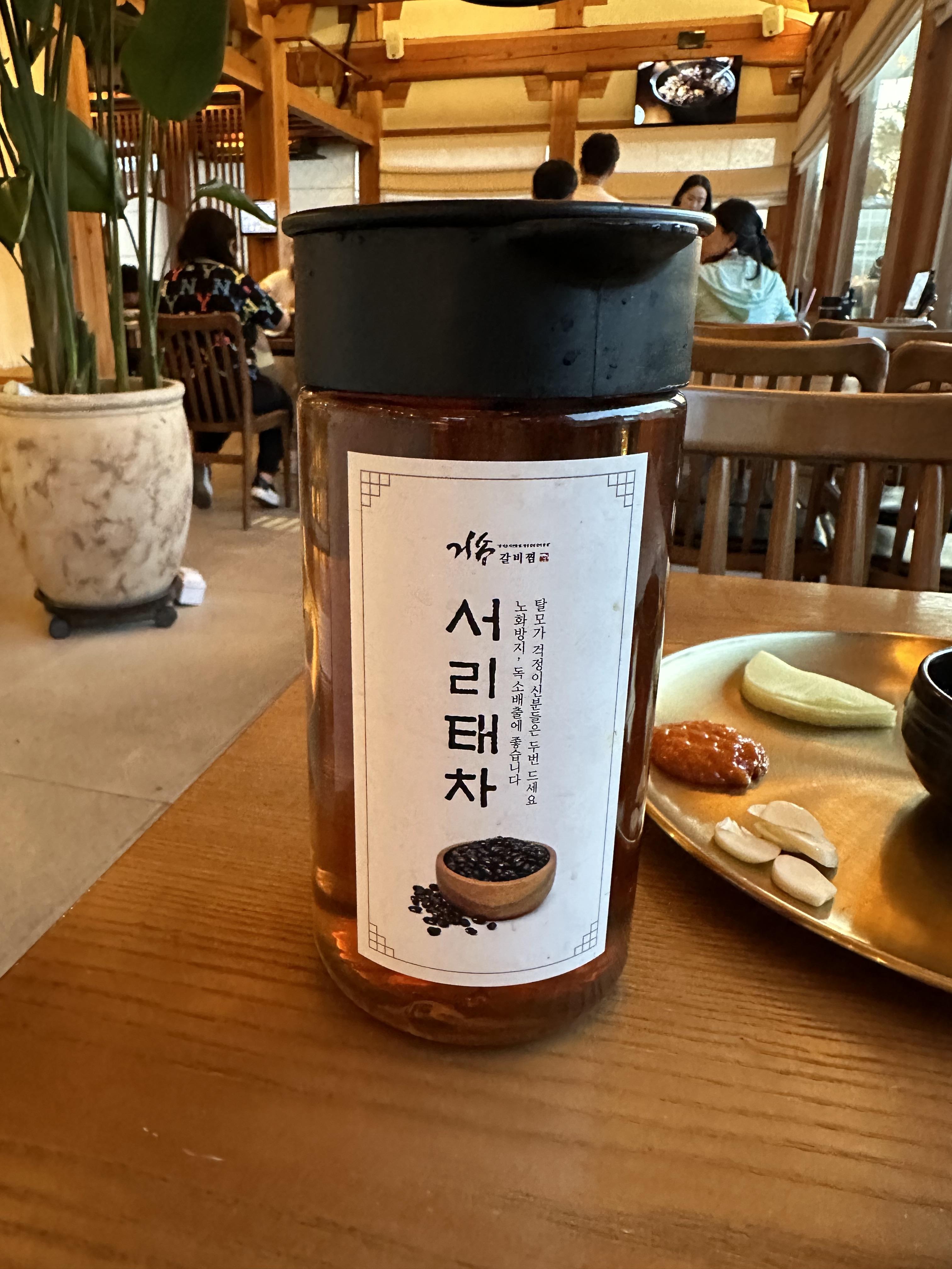 주문을 하고 기다리니까 반찬과 물을 가져다 주었습니다. 보통 식당에서는 생수 한병을 가져다 주는데요. 거송갈비찜 황남점에서는 서리태차라는 생소한 물병을 전달받았습니다. 서리태차 플라스틱병에는 서리태차에 대한 정보가 적혀 있었는데요. 서리태차는 탈모가 걱정이신 분들은 두번 마시라면서 노화방지와 독소배출에 좋다고 적혀있었습니다.