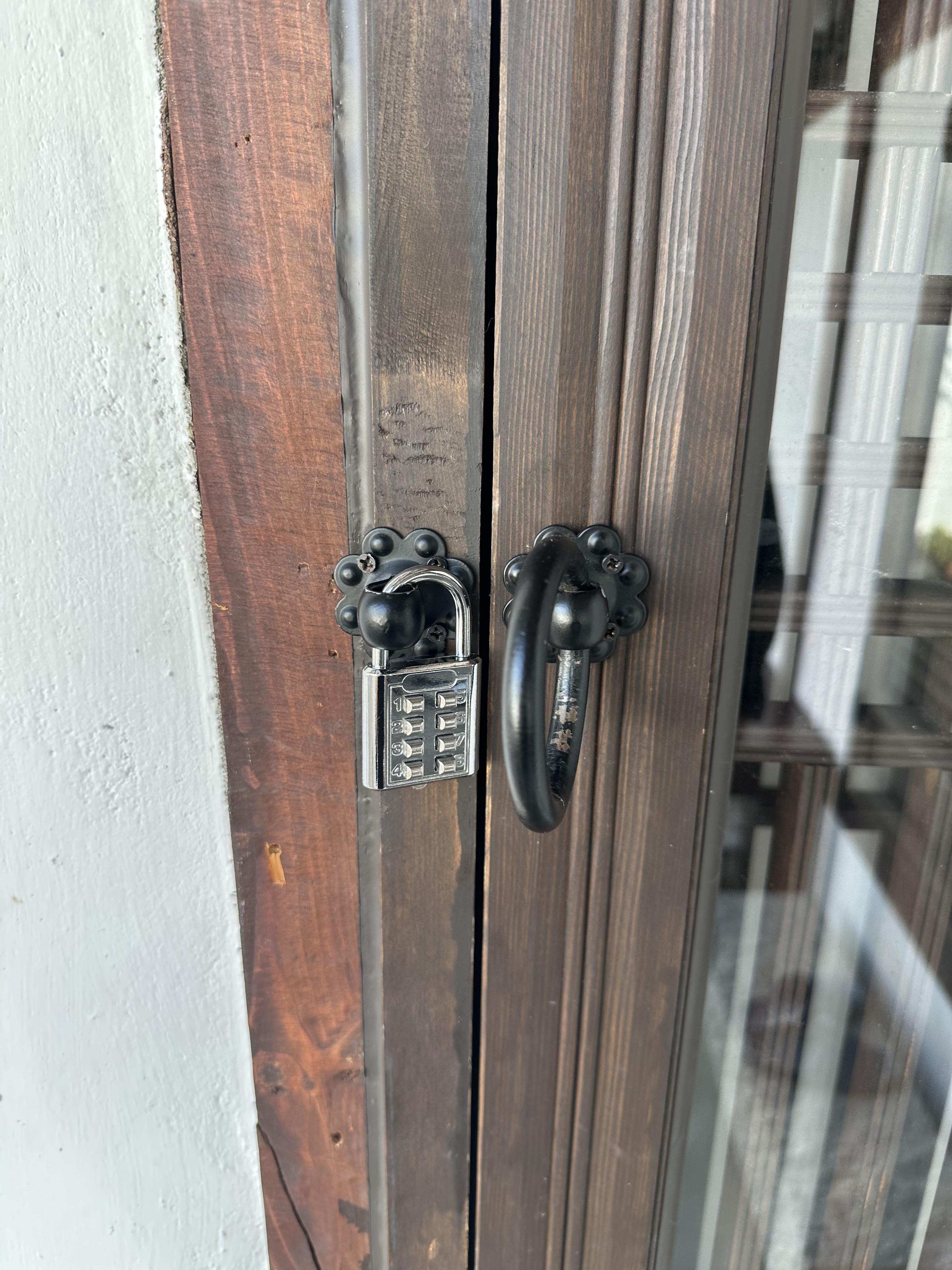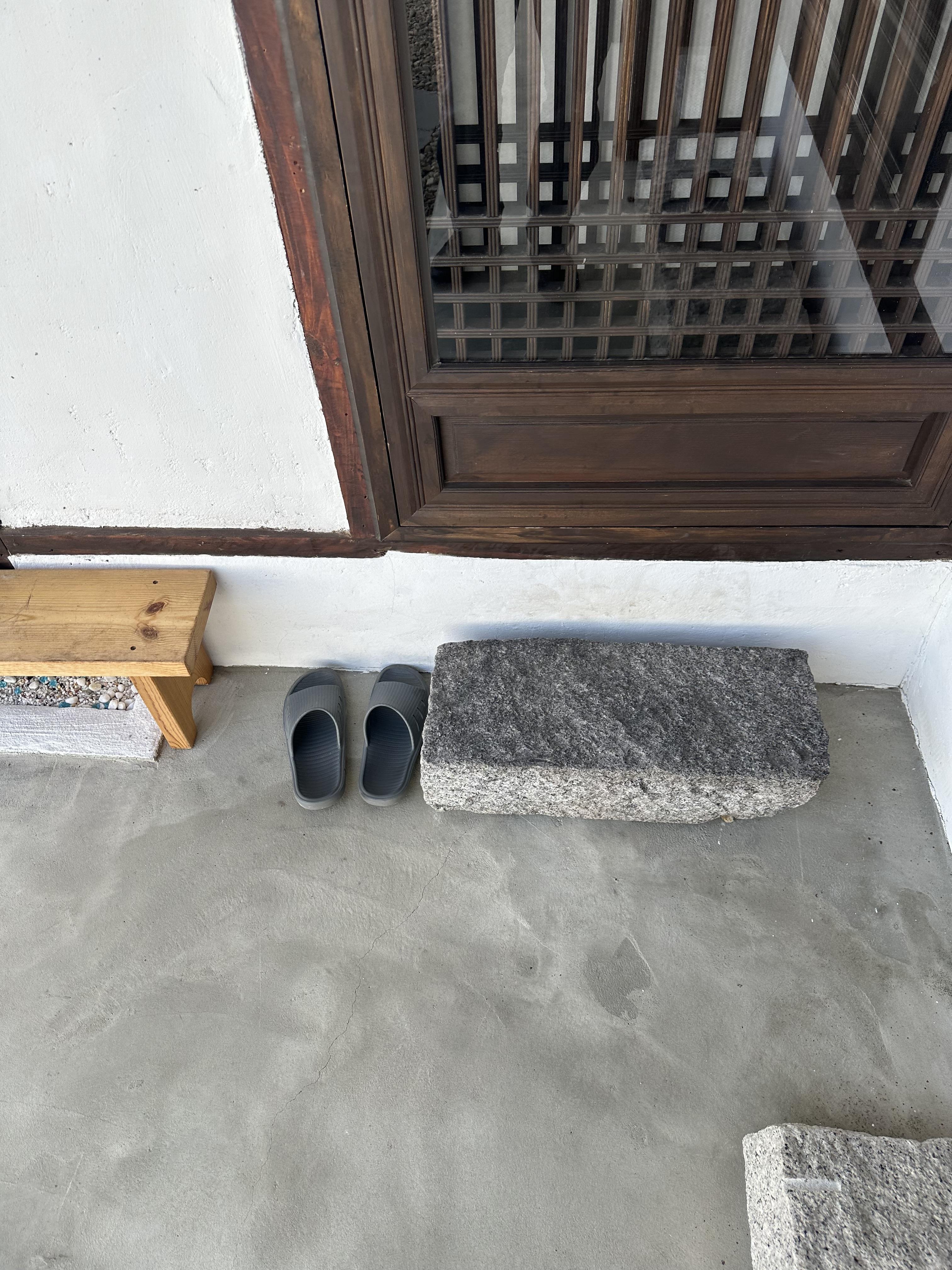 출입문에는 이중 잠금장치로 비밀번호를 누르는 자물쇠가 있었습니다. 저도 어렸을 때 할머니 집이 종이로 되어있어서 손가락으로 구멍낼 수 있는 문이었는데요. 아무래도 숙박업소이다보니 문 위에 유리로 한번 더 작업이 되어 있었습니다. 숙소 출입문에 비밀번호 잠금장치가 있지만 아무래도 혼자 머무르는 한옥 숙소가 아니다보니, 혹시 함께 머무르는 게스트가 옆방에 있다면 분실물 없도록 자물쇠로 잠가주시면 좋을 것 같습니다. 그리고 눌러진 번호는 다시 원래 상태로 돌려놓으면 보안에 안전할 듯 싶습니다.