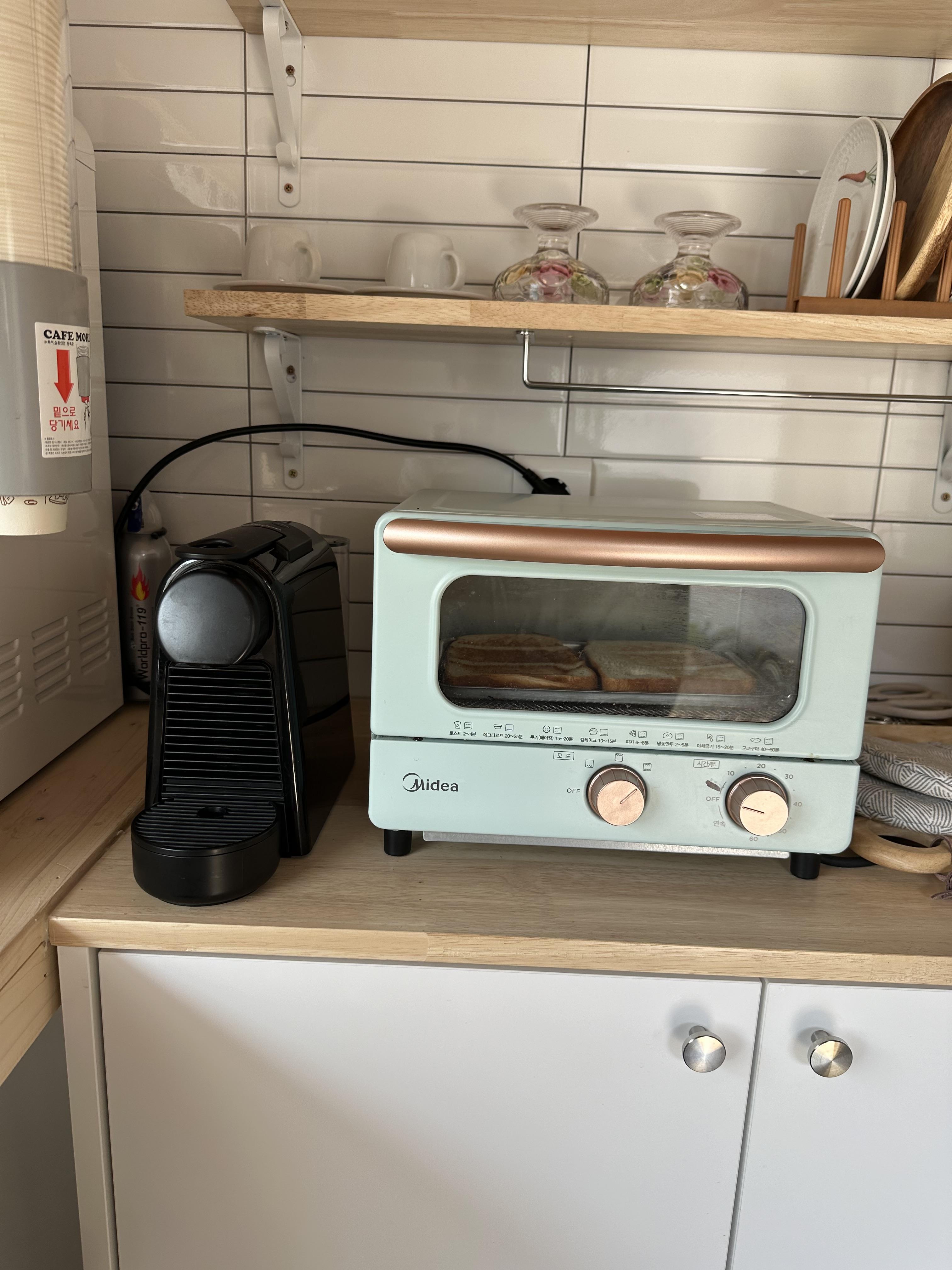 다음 날 아침에 한옥에서 편하게 잠을 자고 깨어났습니다. 일요일에 떠난 여행이고 깨어난 날은 월요일이었습니다. 평소같으면 출근하느라 정신없는데요. 여행온만큼은 즐겁고 편안한 월요일이었습니다. 6월 중순에 떠난 여행이라 그런지 아침 햇살도 뜨겁고 더웠습니다. 한옥 공용 주방은 에어컨 켜지 않으면 무지 뜨겁고 더웠습니다. 사장님께서 게스트들을 위해 준비한 토스트와 컵라면 그리고 쥬스로 간편하게 아침을 해결했습니다. 커피머신도 있어서 토스트와 라면을 먹고 나서 디저트로 아메리카노도 한잔했습니다.