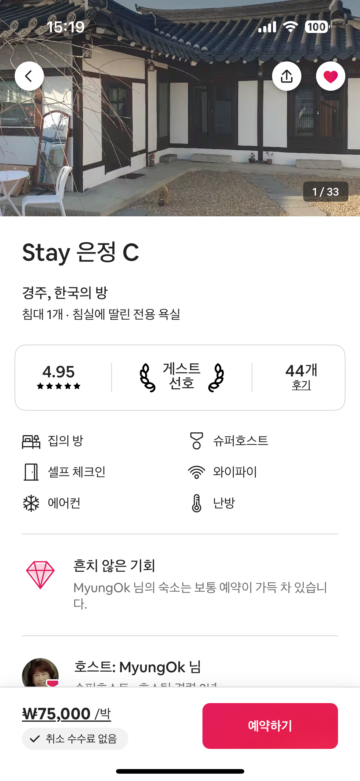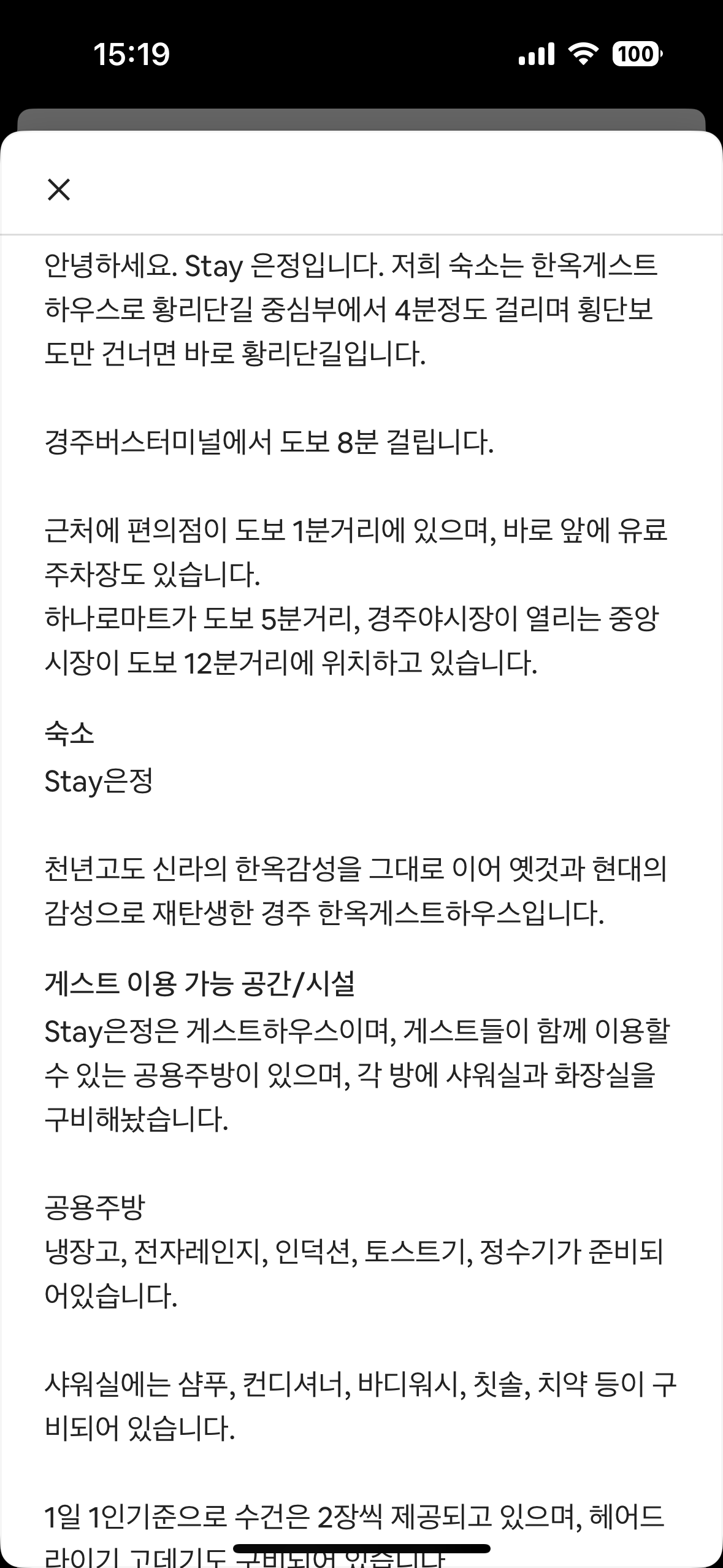 경주 황리단길에서 머무르고자 하는 숙소는 에어비앤비 앱에서 찾아보게 되었습니다. 경주 황리단길에 있는 숙소 대부분은 한옥 숙소가 많았습니다. 황리단길에서 시외버스터미널 건너편 시내방향에는 한옥보다는 일반 원룸형 건물이나 게스트하우스가 많이 있고 황리단길부터는 대부분이 한옥입니다. 한옥이다보니 가격이 비싸다는 점이 문제였습니다. 또한 오래된 시설일수록 샤워공간이 공용인 곳과 낙후된 곳이 있었습니다. 특히 네이버나 카카오에서 예약할 때는 오래된 한옥 숙소를 볼 수 있었습니다. 그렇지만 오래된 한옥 숙소의 경우 황리단길 안쪽에 있어서 한옥거리의 느낌을 바로 느낄 수 있는점도 있습니다. 하지만 황리단길이 관광객들이 늦은시간까지 돌아다니고 하기 때문에 개인적으로 황리단길 안쪽 숙소의 경우 수면에 예민하신분의 경우 추천하지 않습니다. 황리단길에 속해있지만 은정스테이처럼 황리단길과 약간 떨어진 숙소가 조용하면서 좋을 수도 있습니다. 아무래도 한옥의 느낌을 그대로 느낄 수 있는 낙후된 곳이 좋을 수 있지만 도시에서 살았던 저라서 혹시 화장실이나 샤워공간이 공동인 경우 불편할 수 있었습니다. 그래서 저는 모던 분위기의 한옥 숙소로 보였던 은정스테이를 예약하였습니다. 비록 제가 모두가 떠나는 일요일부터 월요일까지 숙박하는 것에도 불구하고 1박에 75000원정도로 저렴한 가격을 자랑하고 있습니다. 경주의 대부분 한옥 숙소는 금요일과 주말 성수기에는 10만원이 넘기 때문에 뚜벅이 여행객에게는 부담이 될 수 있습니다. 그러나 10만원 이하로 부담이 덜했습니다.