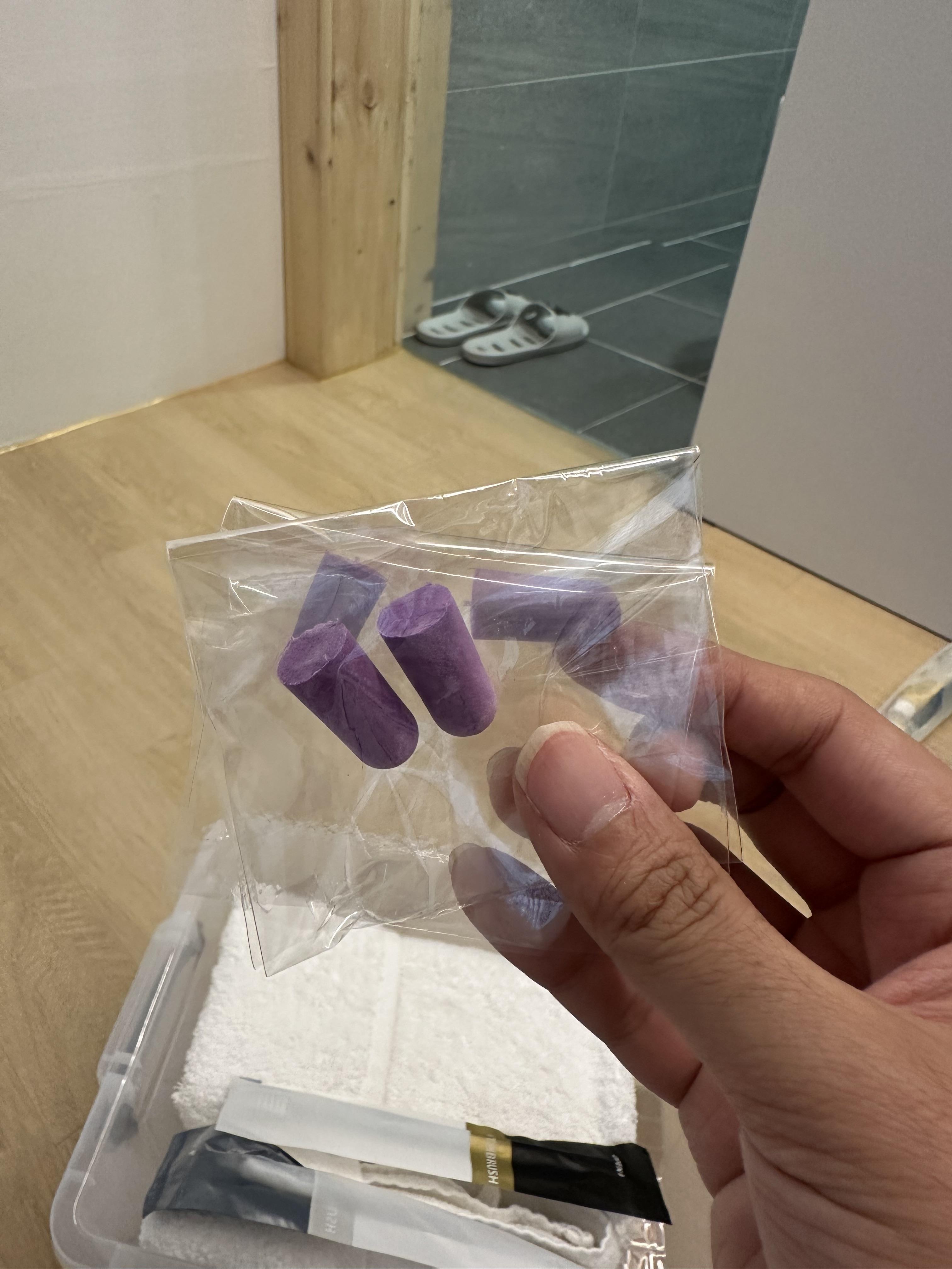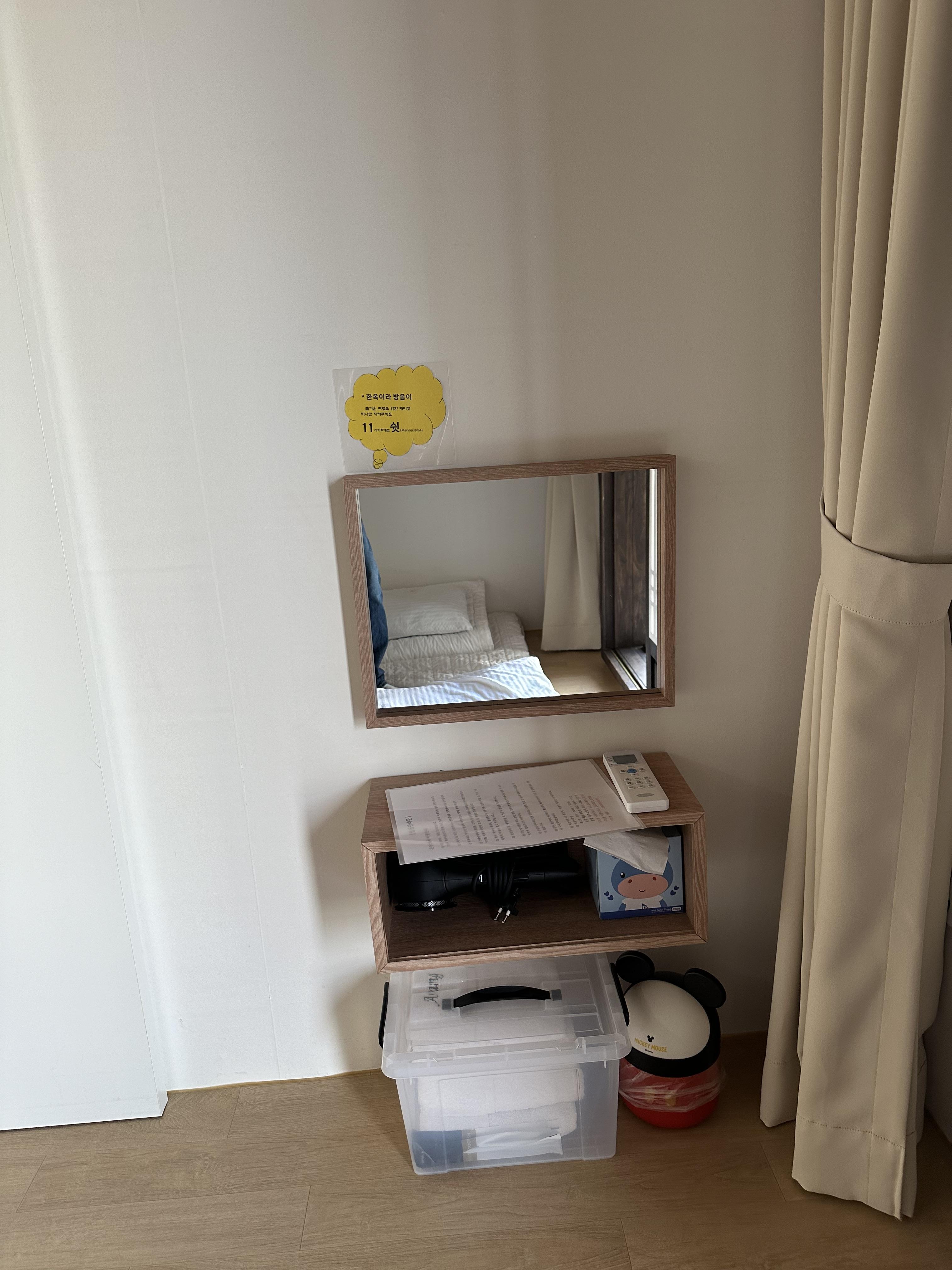 화장대 아래에는 플라스틱 통이 하나 있었습니다. 그리고 수건과 일회용 칫솔과 귀마개가 함께 담아져있었습니다. 당시에는 여행객들이 다 떠나간 일요일 숙박이라 조용하게 편안하게 잤지만 여행객이 많은 금요일과 토요일은 당연히 시끄러울수 밖에 없기때문에 사장님이 게스트들을 배려해서 준비해주신것 같습니다. 여행 마지막날에 11시에 맞춰서 체크아웃 하는데 우연히 사장님을 뵈었는데요. 나이가 있으신 분이었습니다.