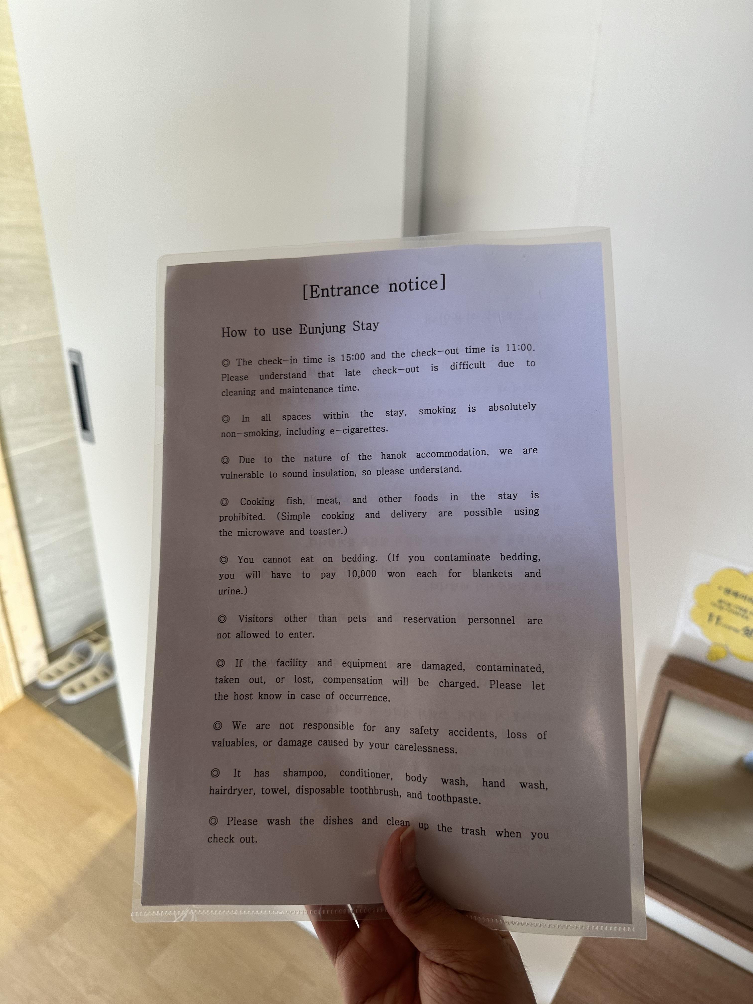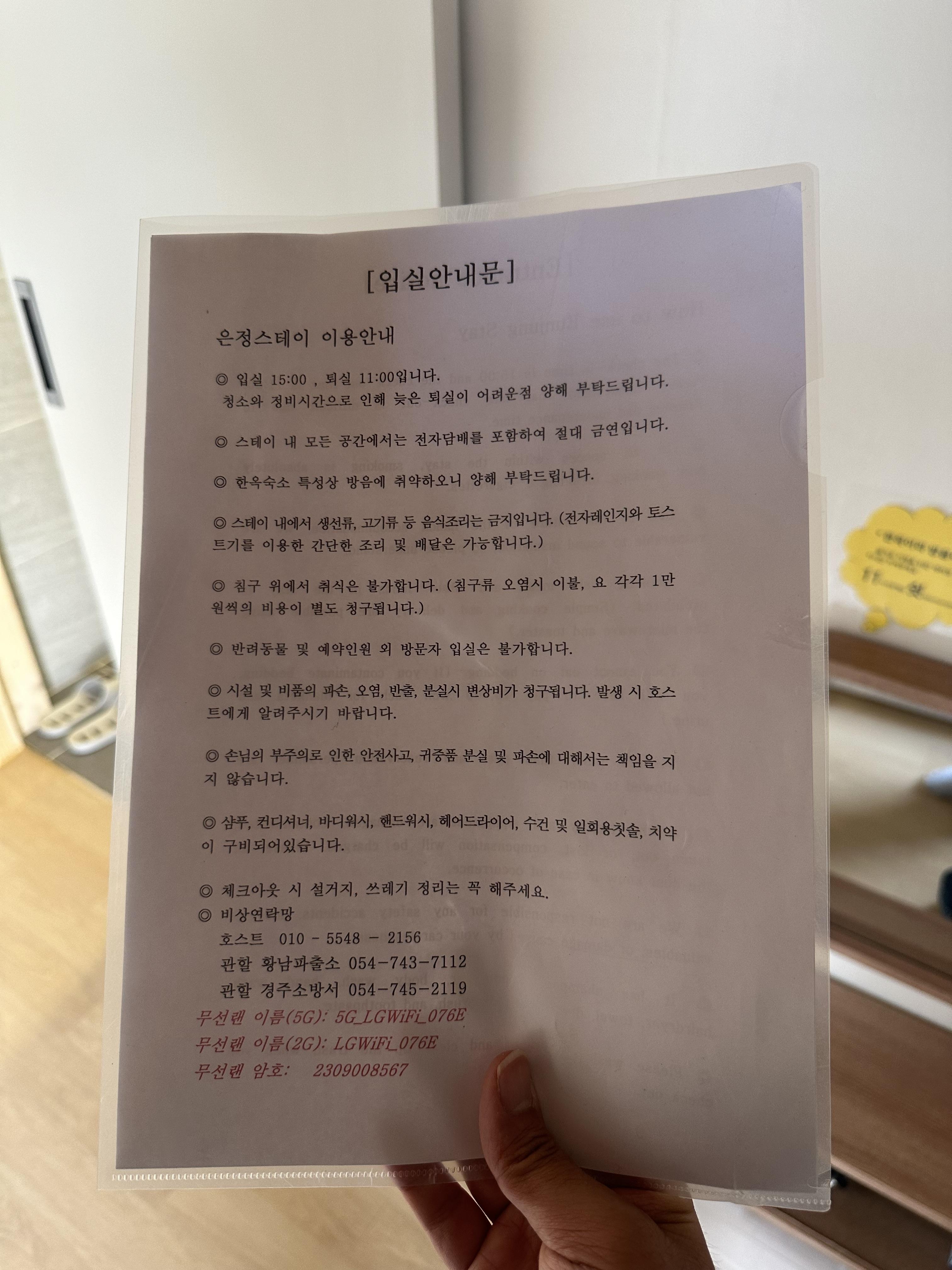 경주 황리단길은 내국인 뿐만 아니라 외국인도 자주 찾느 곳이다보니 입실 안내문이 앞뒤로 한글과 영어로 되어있었습니다. 미국인들만 오는지 한국어와 영어로 된 입실안내문만 있었습니다. 입실안내문에서 한가지 특이한 것은 하단에 관할 파출소와 소방서가있다는 것입니다. 혹시라도 주변에 소음이나 시끄러울 경우나 화재 등 위급한 사항을 위해서 호스트(사장님)께서 상세히 적어두신 것 같습니다.