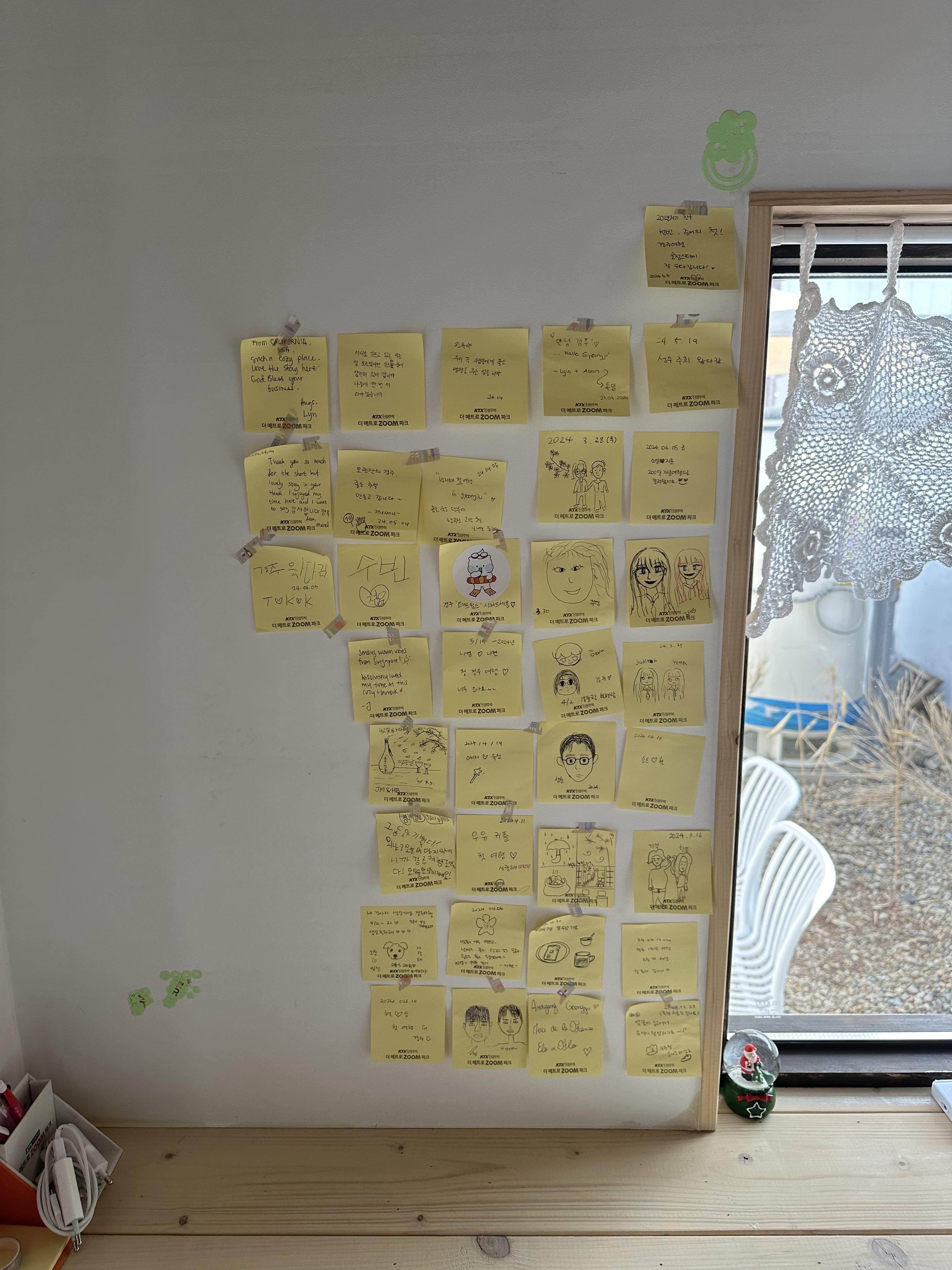 사장님이 게스트들이 배고플때나 혹은 조식으로 간편하게 먹을 수있도록 컵라면과 냉장고에 식빵과 잼을 비치해놓았습니다. 보통은 조식만 챙겨주는데 배고플 때 먹을 수 있도록 컵라면도 비치해두었습니다. 거실에서 대문방향으로는 작은 창문으로 한옥의 모습과 게스트들이 포스트잇을 이용해서 숙소에 흔적을 남긴 모습도 볼 수도 있었습니다.