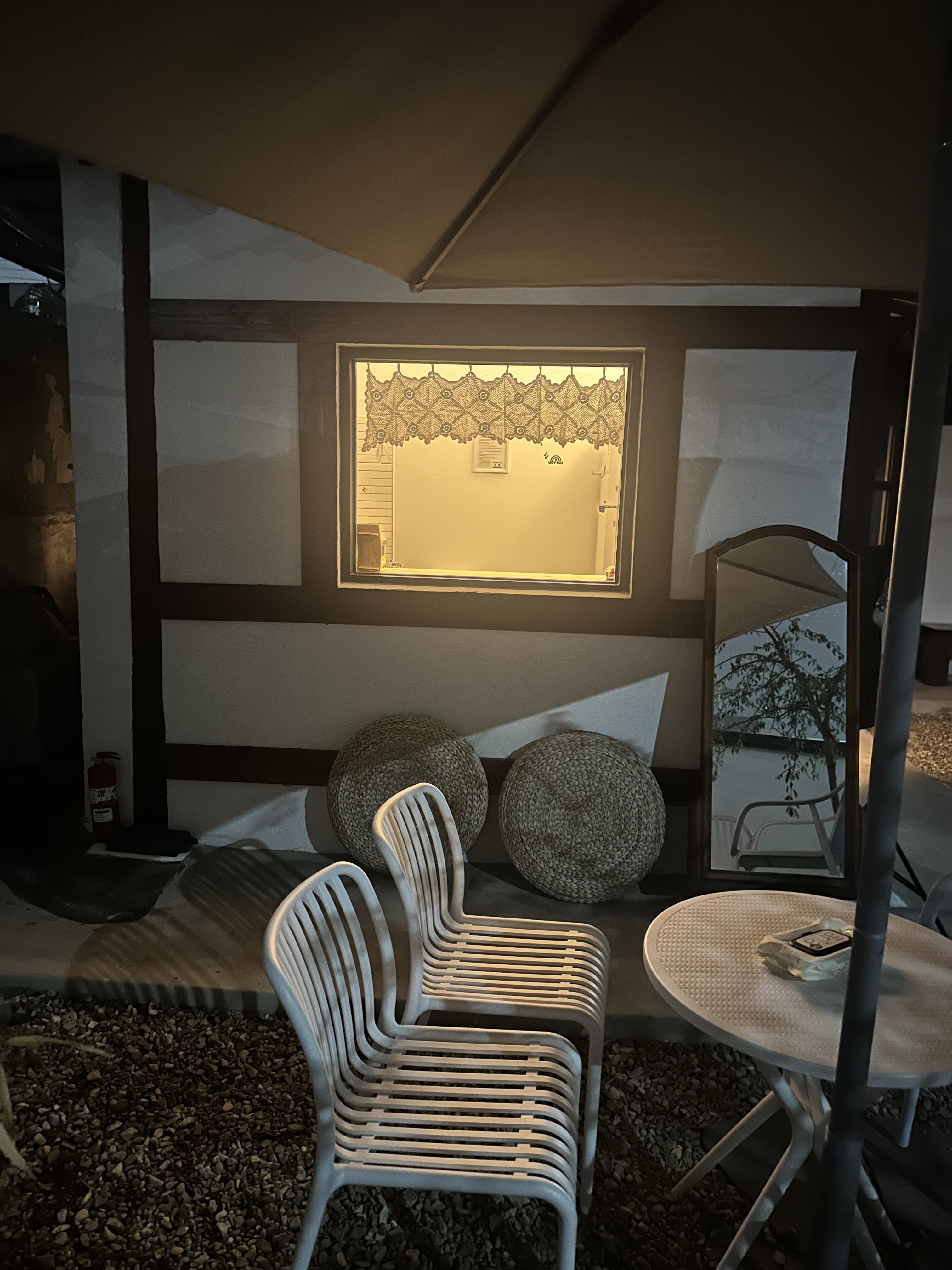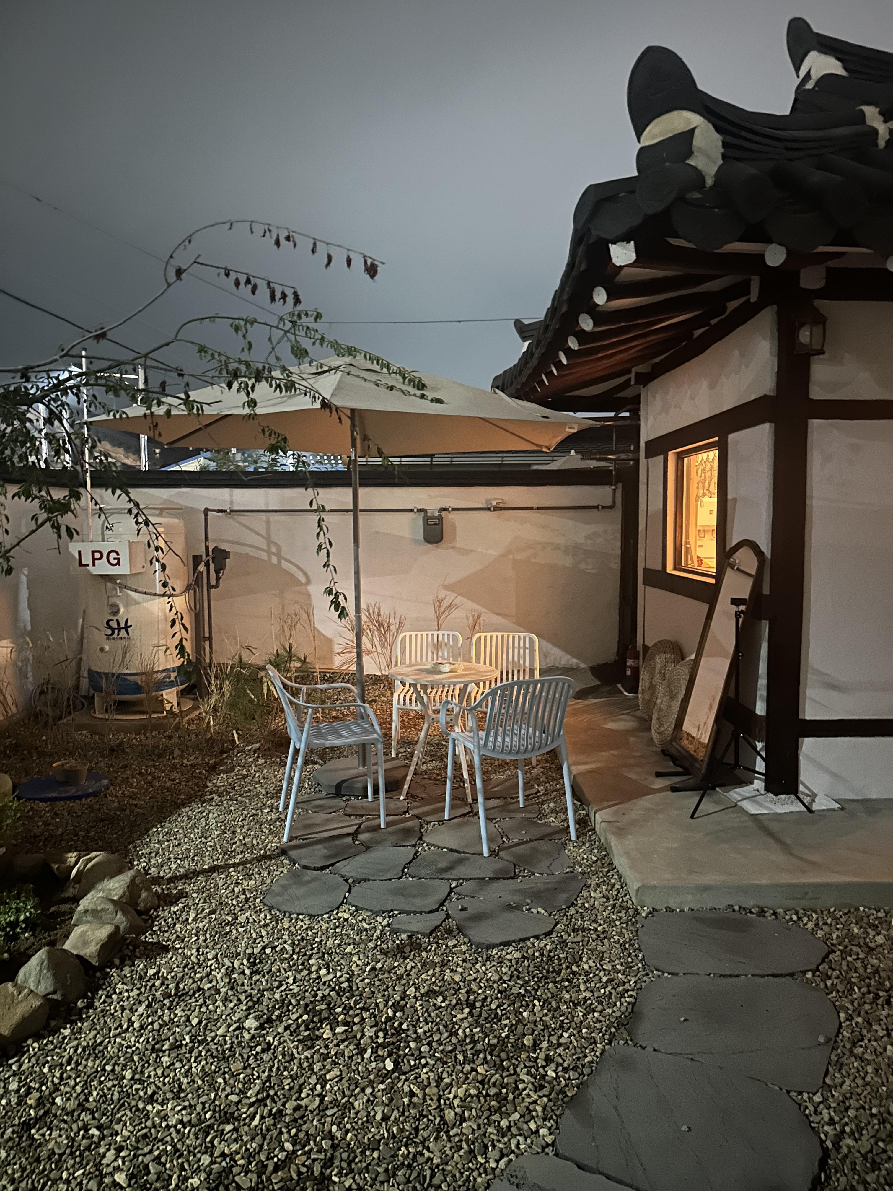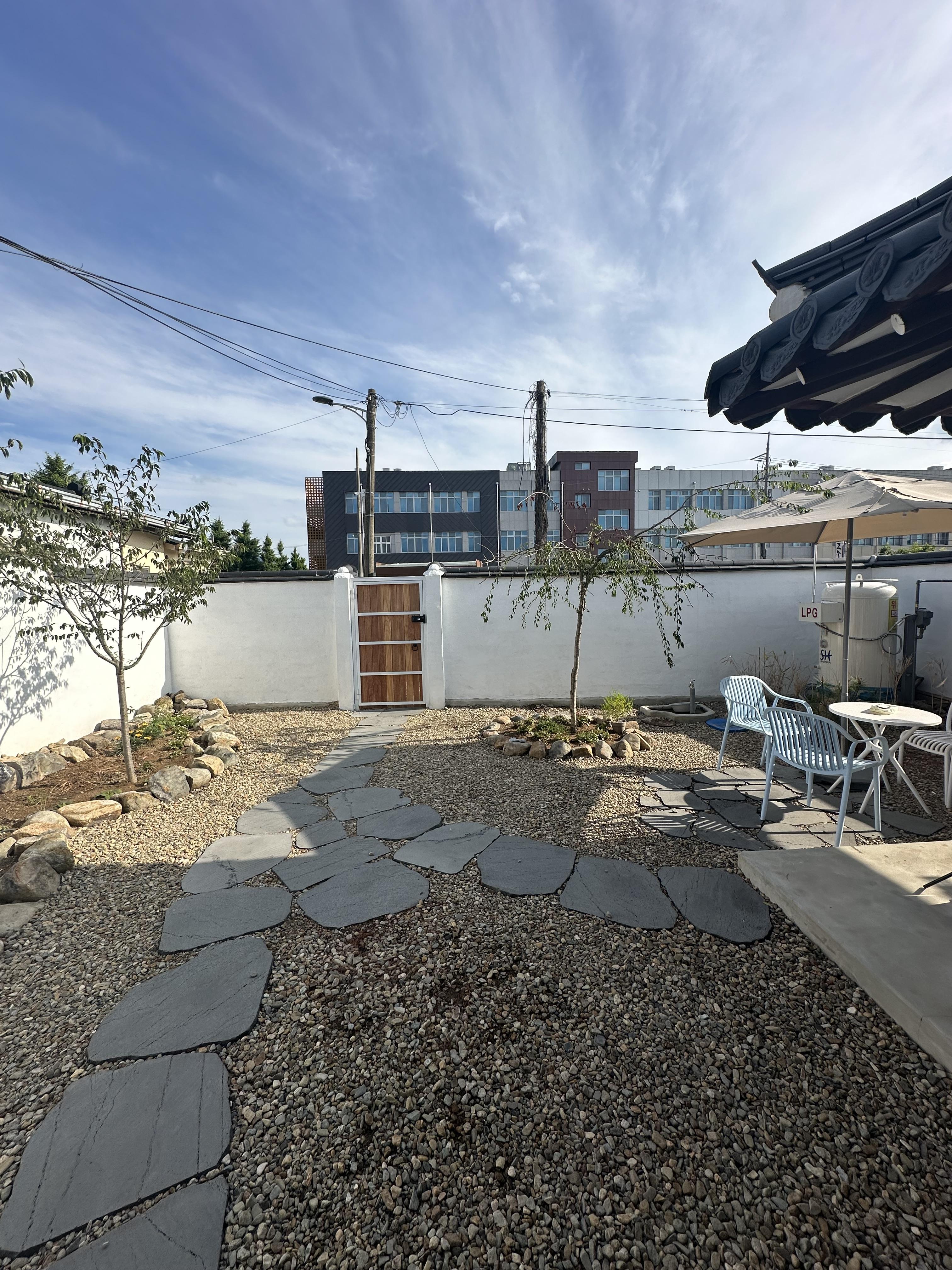 마당이 있고 마당앞쪽에는 흰색 테이블과 의자가 갖추어진 테라스도 있었습니다. 한옥 숙소를 여행하는 경우는 그렇지 많지 않은데요. 가장 큰 이유는 가격면입니다. 내일로 여행때부터 전주 한옥마을 갔지만 대부분 사람들이 한옥에서 머무르지 않은 것은 아마 비용면에서 일 것입니다. 또한 대부분 인기 있는 여행지는 교통과 숙박이 좋은 대도시라는 점에서 부산과 여수, 서울로 여행 다니는 사람이 많기 때문에 한옥 숙박은 흔치 않는 것 같습니다. 저도 일반 원룸 형태의 숙박 건물이나 최근에는 오피스텔이나 생활형숙박처럼 고층 숙소를 이용하다가 이렇게 마당이 있고 돌담길이 있는 숙소를 이용하니 색다른 기분이였습니다.