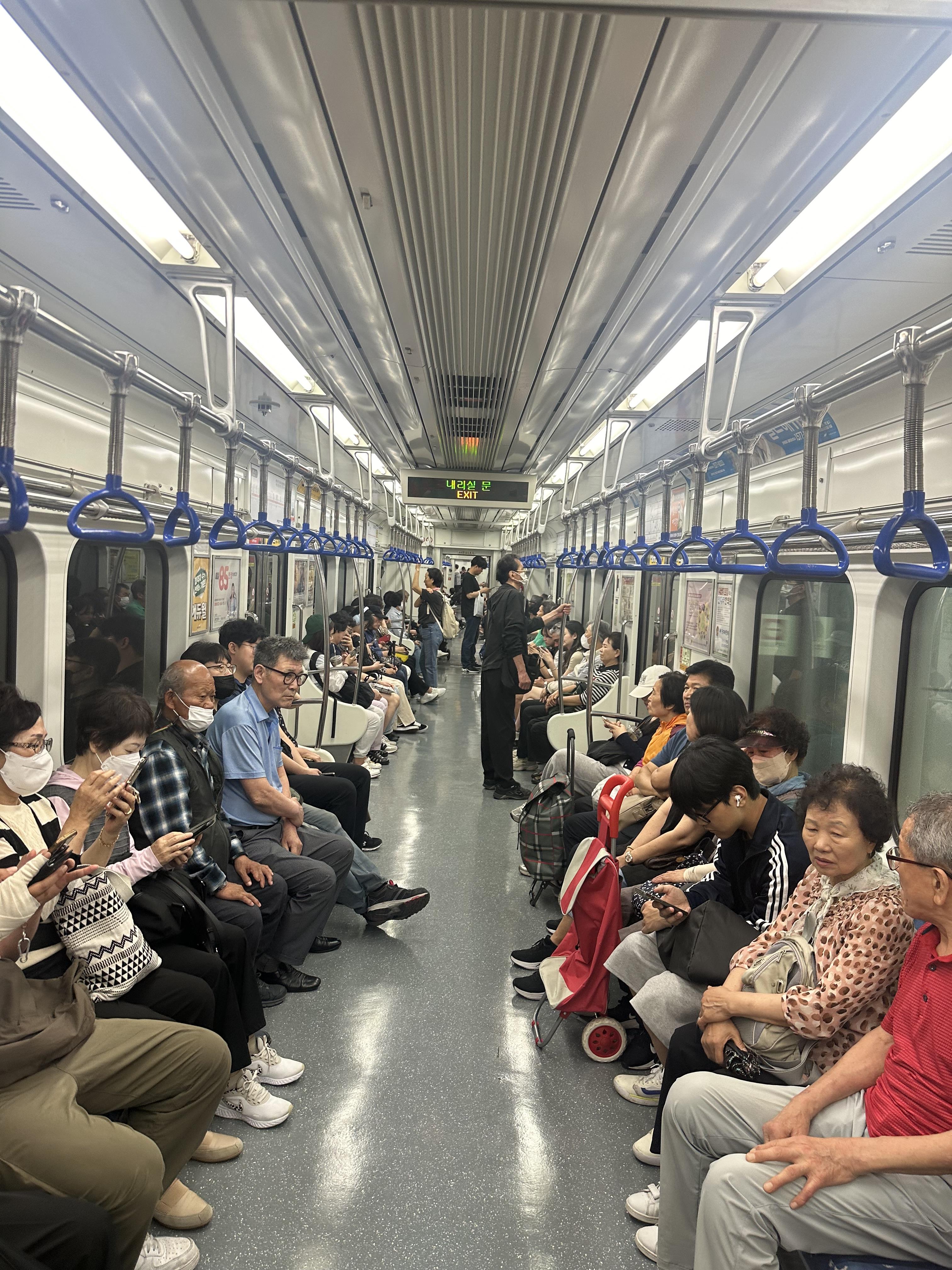 - 서울 지하철에 비해 지하철 안에 통로 폭이 좁습니다. 위와 같이 개발한 이유는 서울에 비해서 부산 인구도 적고 건설비를 줄이기기 위합니다.