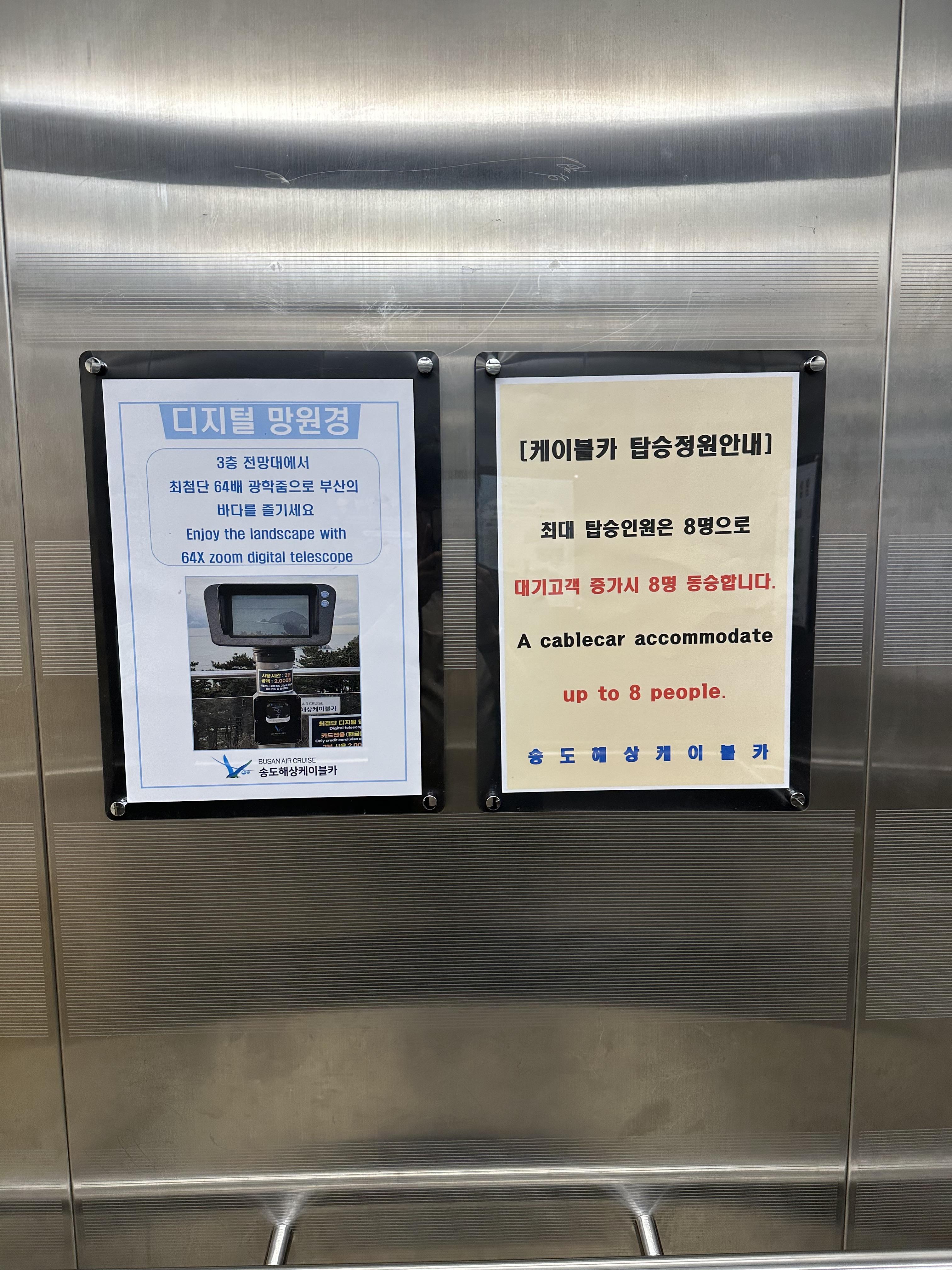 송도해상케이블카 스카이하버전망대에서 아름다운 송도 바다의 밤바다를 보고 아쉬운 마음을 뒤로 한채 엘레베이터를 타고 내려왔습니다. 케이블카의 탑승인원은 최대 8명이라는 것이 보입니다. 평일 금요일도 아닌 월요일에 와서 느낄 수는 없었지만 부산같은 유명한 관광지는 극성수기나 주말에는 관광객들도 붐비는데요. 2017년 5월에 황금연휴로 거의 일주일 쉬던 날이 있었습니다. 그때 통영 케이블카를 타러 갔는데 성수기로 케이블카 타려는 사람들로 북적이는 모습을 보았습니다.