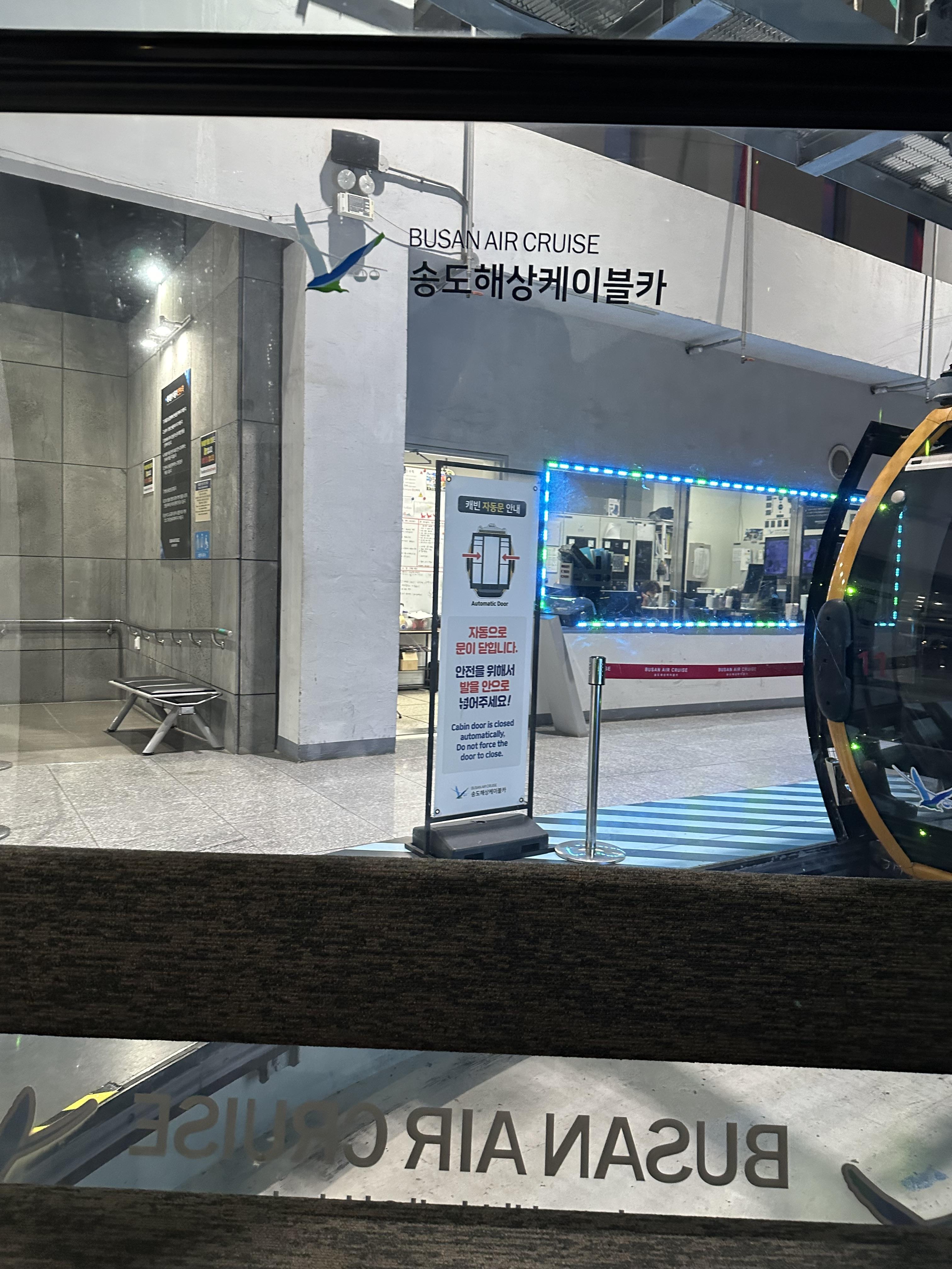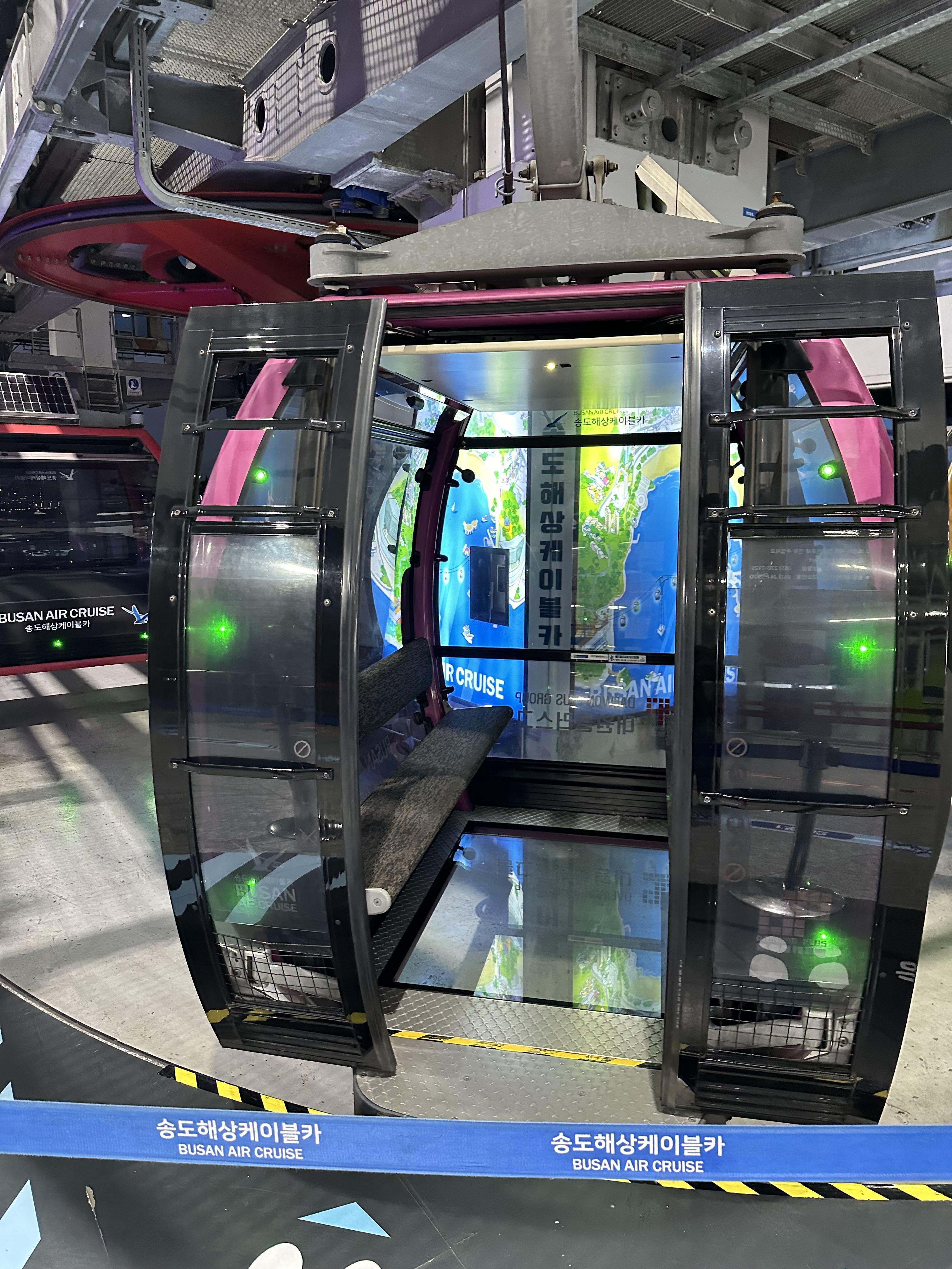 부산 에어크루즈의 경우에도 다른 케이블카처럼 일반 캐빈과 크리스탈 캐빈으로 이루어졌습니다. 제가 타려고 했던 캐빈은 일반 캐비인데 앞쪽에 바닥이 유리로 되어있는 크리스탈 캐빈이 지나가고 있었고 바로 뒤에 오는 일반캐빈에 탑승하여 출발했습니다.