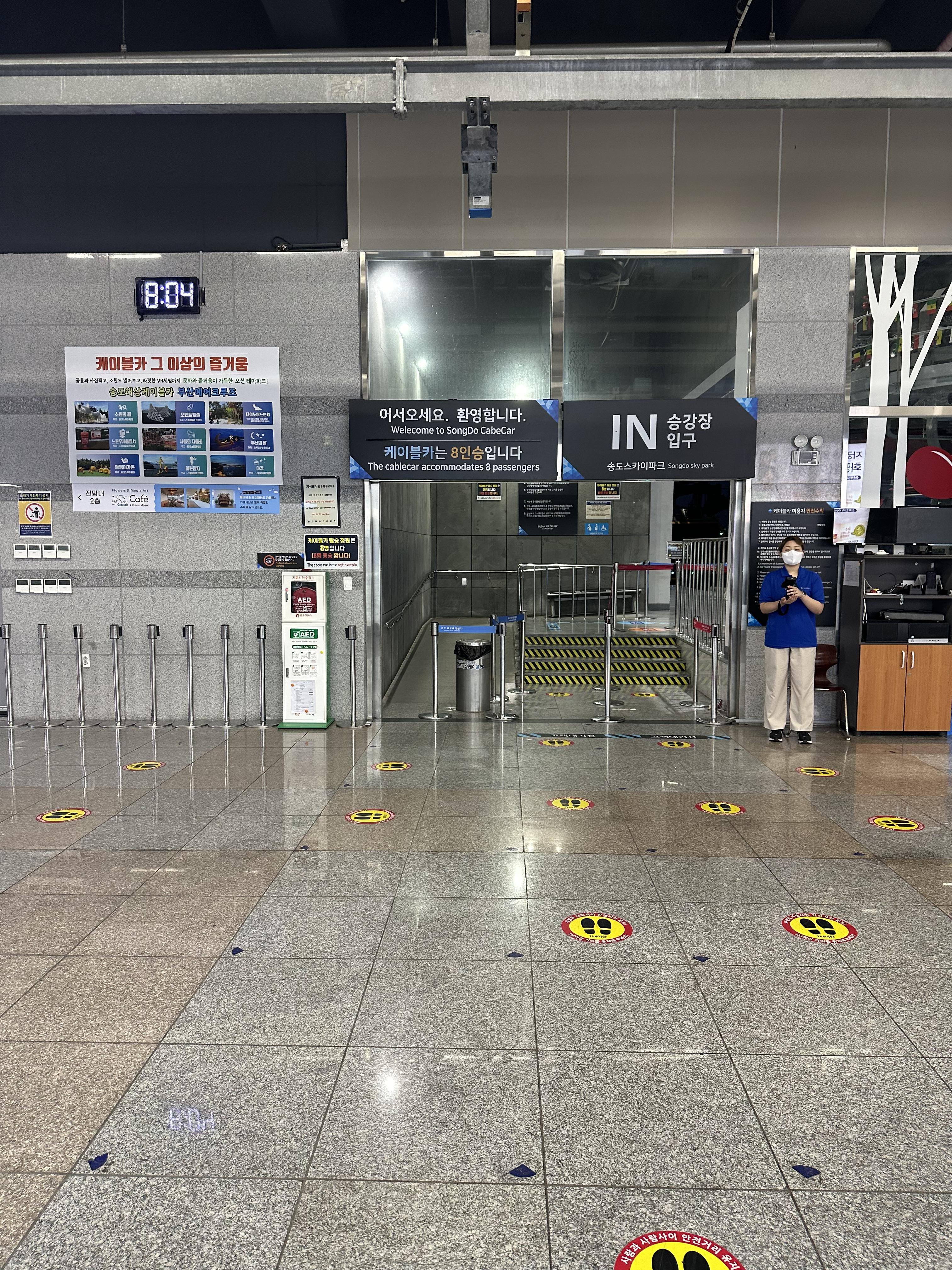 엘레베이터를 타고 상부 승강장으로 오니까 정면 시간에 20시 4분이라는 시간이 보이기 시작했습니다. 8시가 되니까 점차 어두워지는 것을 확인할 수 있는 여름의 밤이었습니다. 송도해상케이블카 하부승강장인 베이스테이션에서 왕복티켓을 구매한 왕복 티켓의 바코드를 직원에게 제시하고 탑승을 시작했습니다.